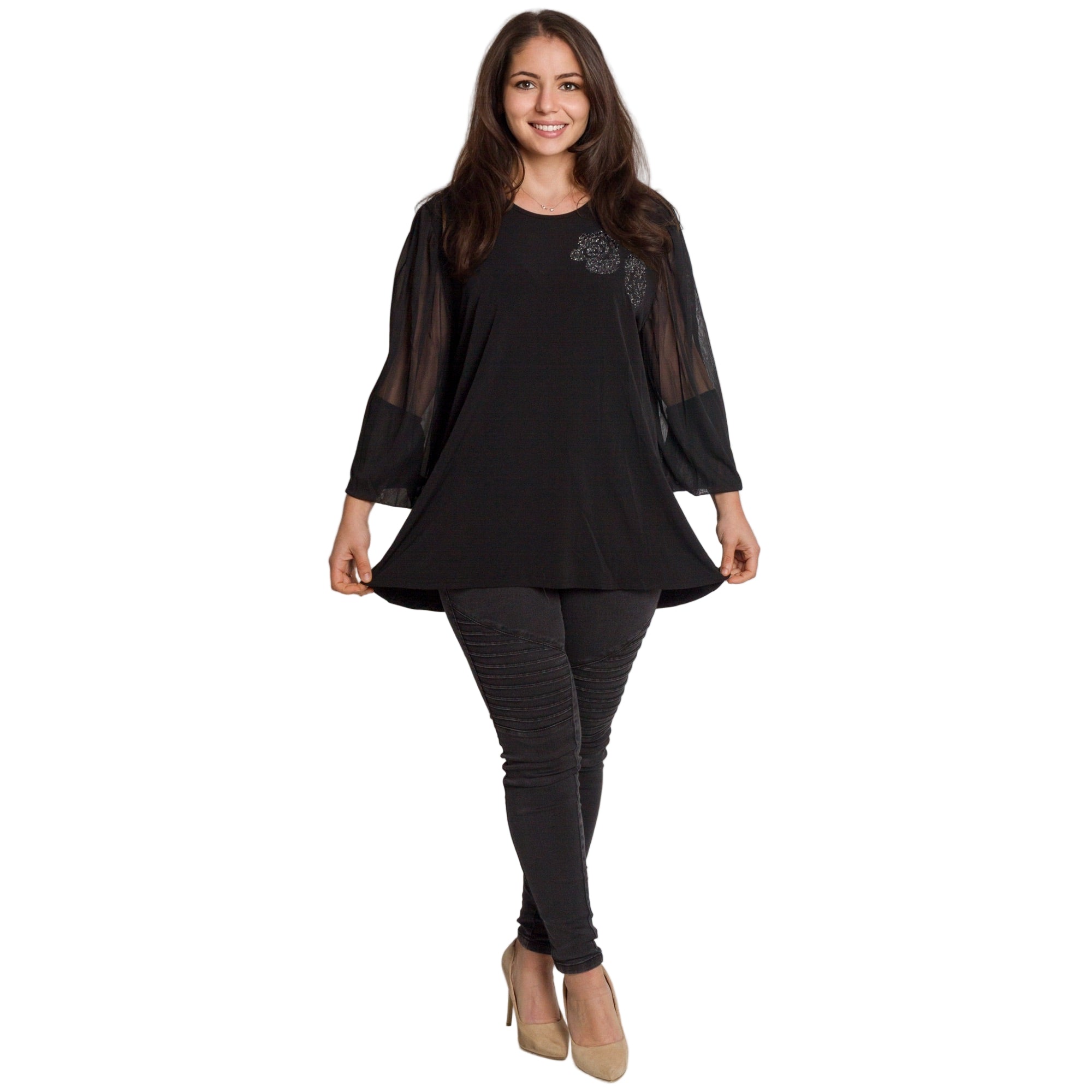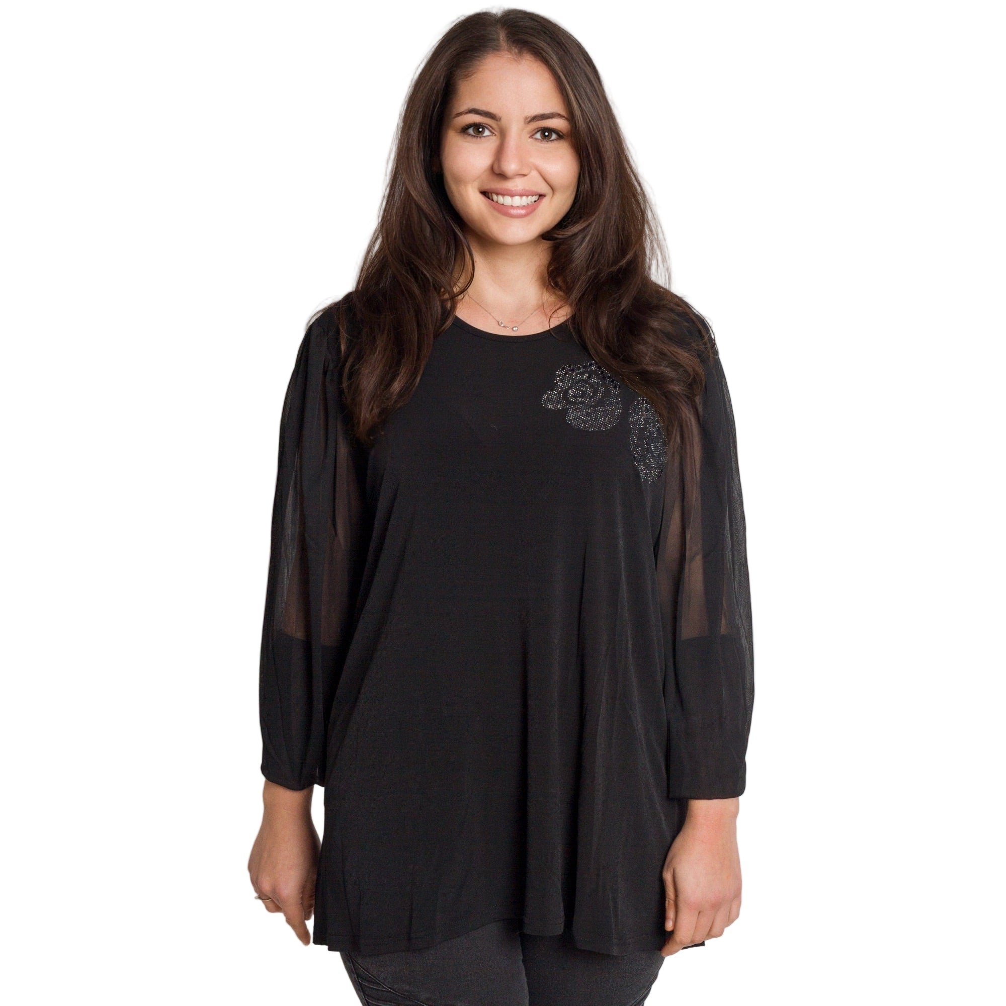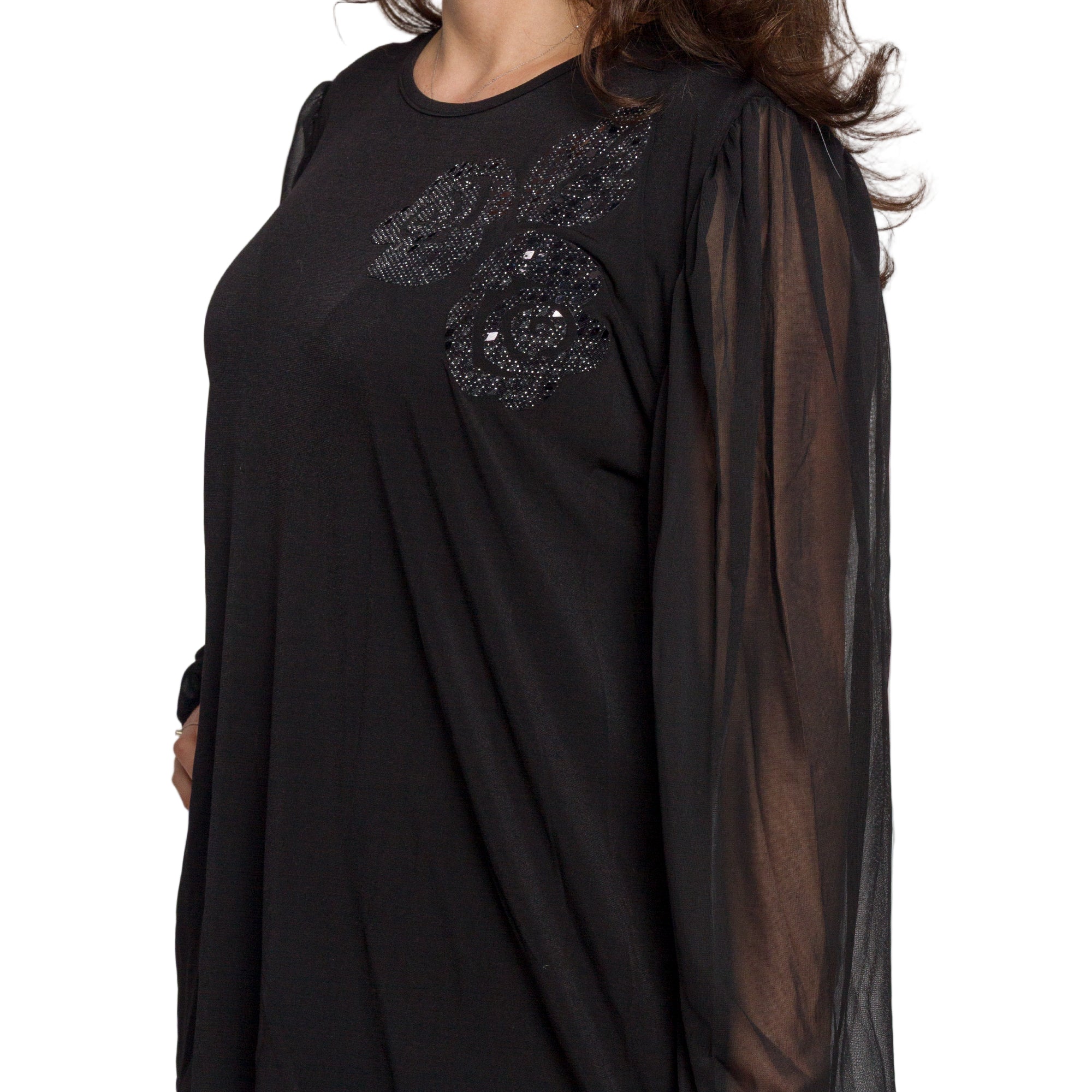 Черна разкроена туника с тюл ръкави и блестяща апликация