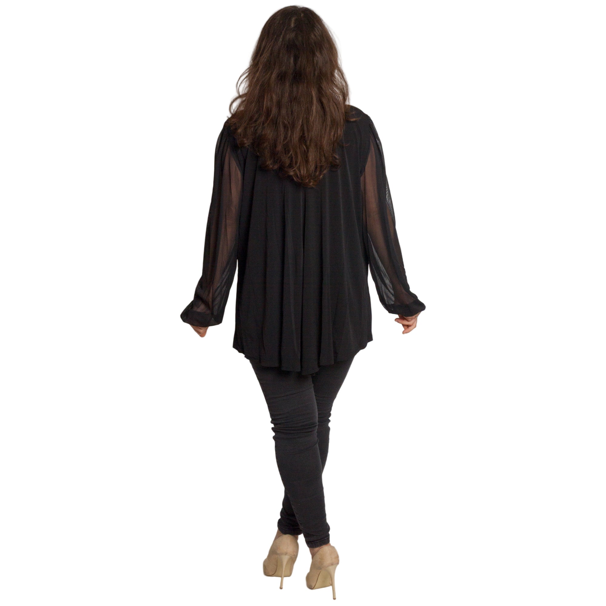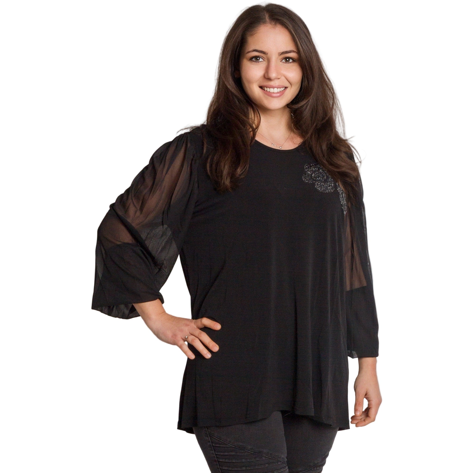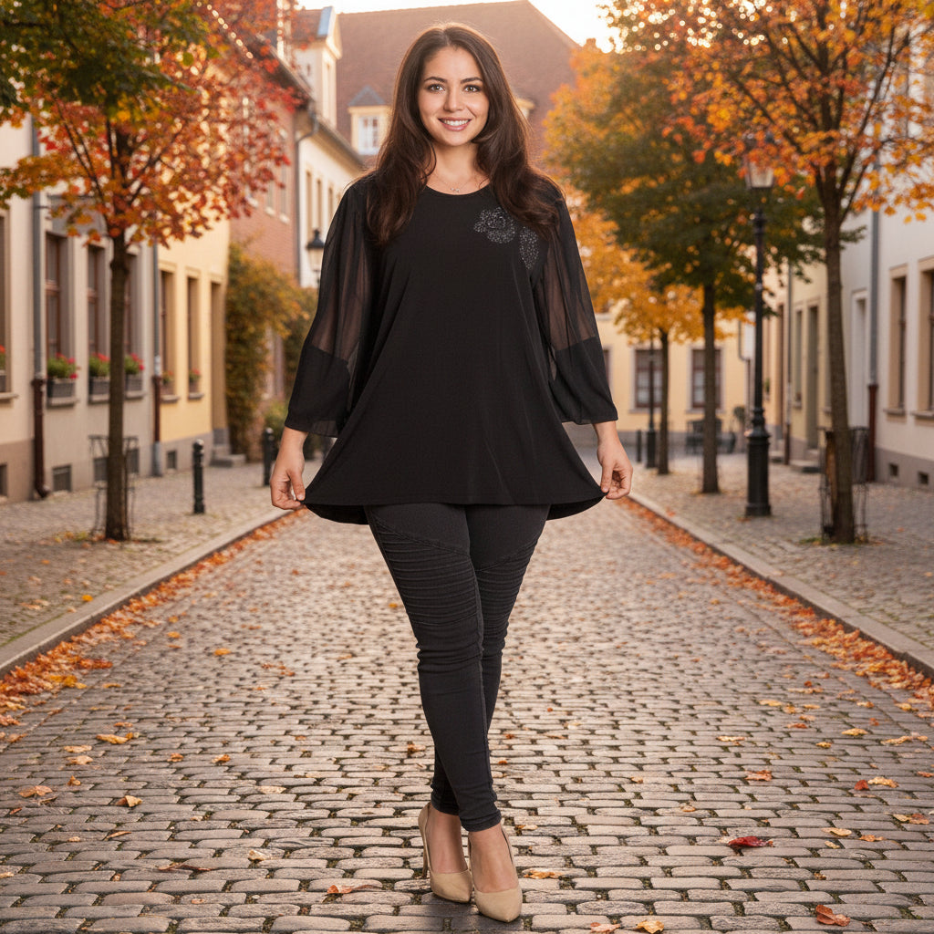 Черна разкроена туника с тюл ръкави и блестяща апликация