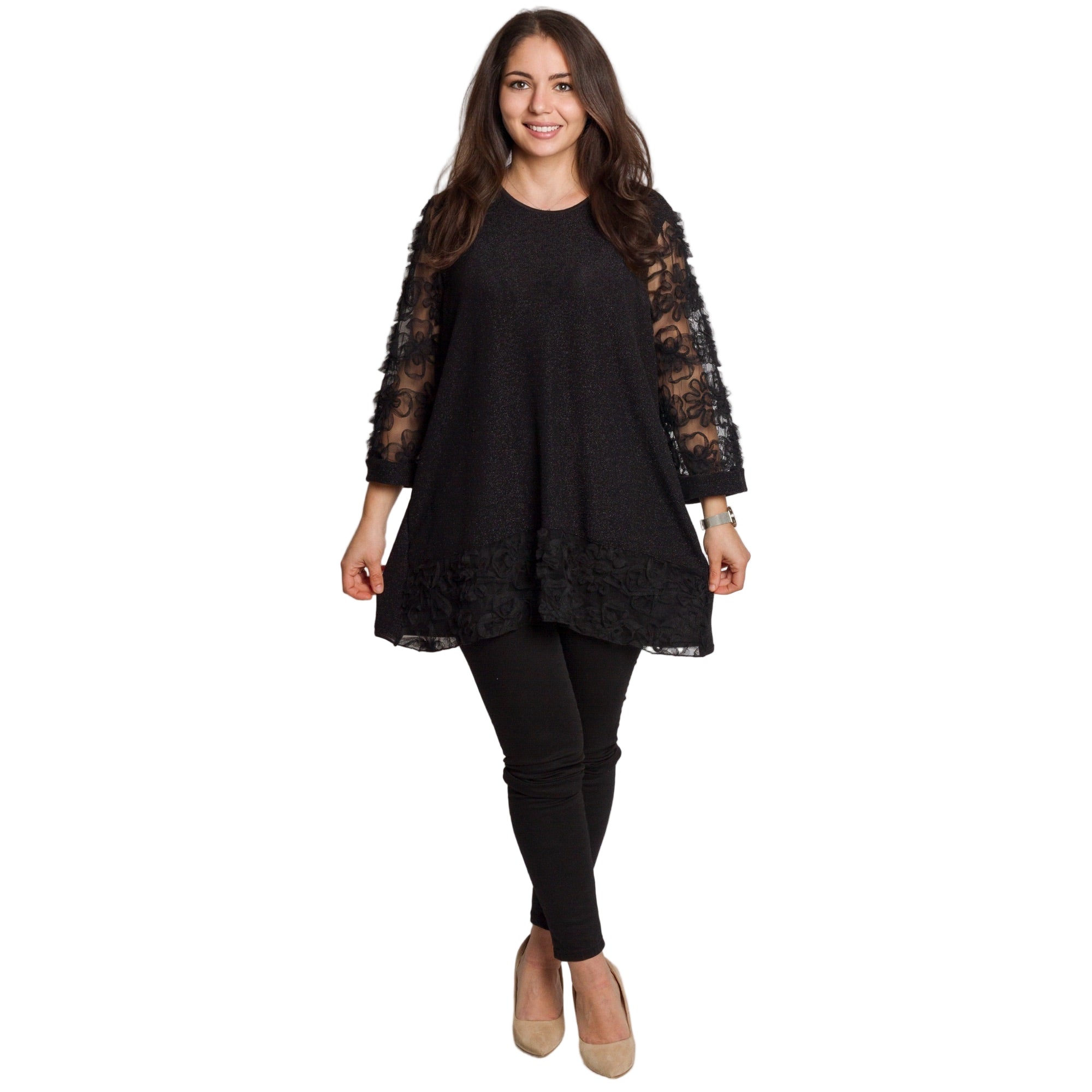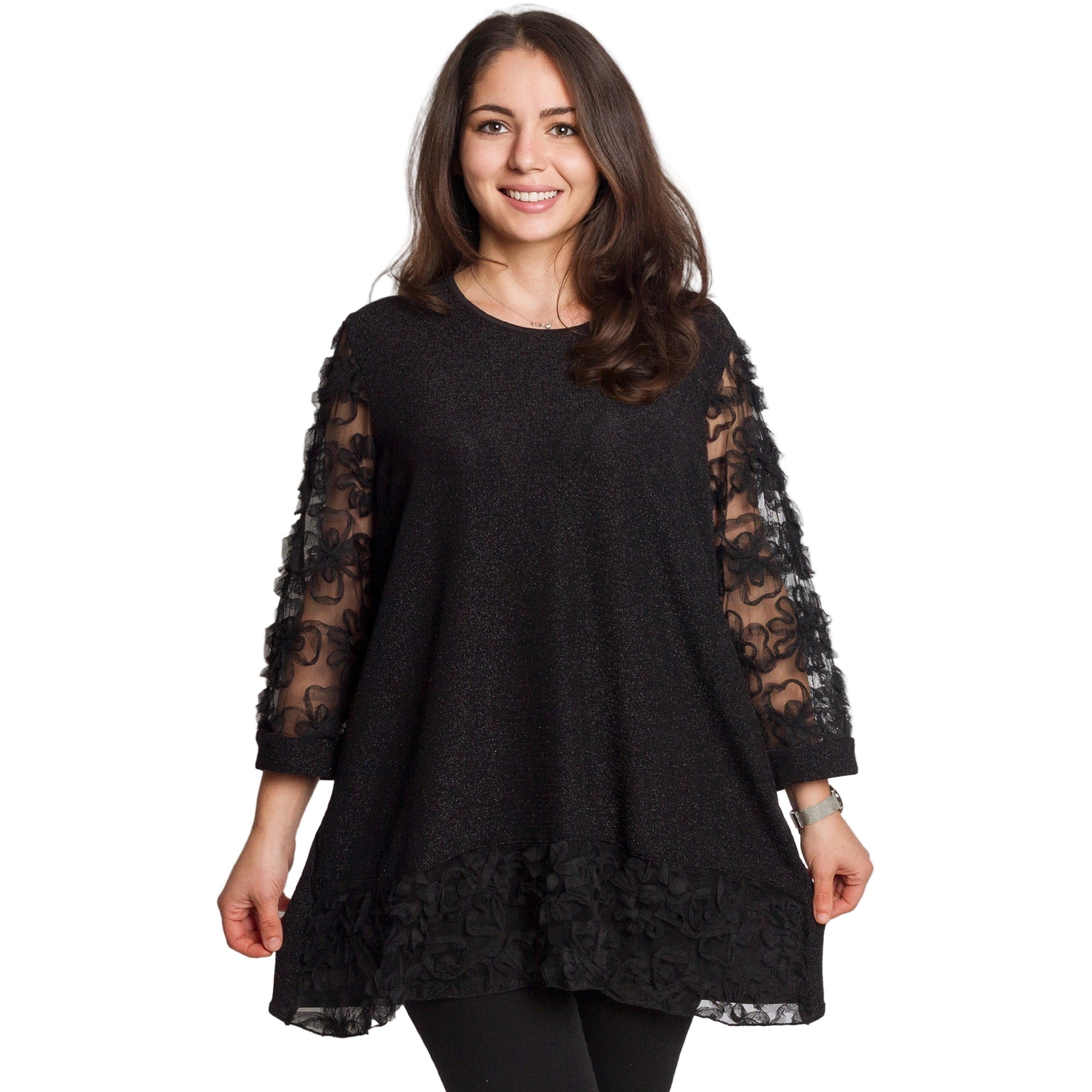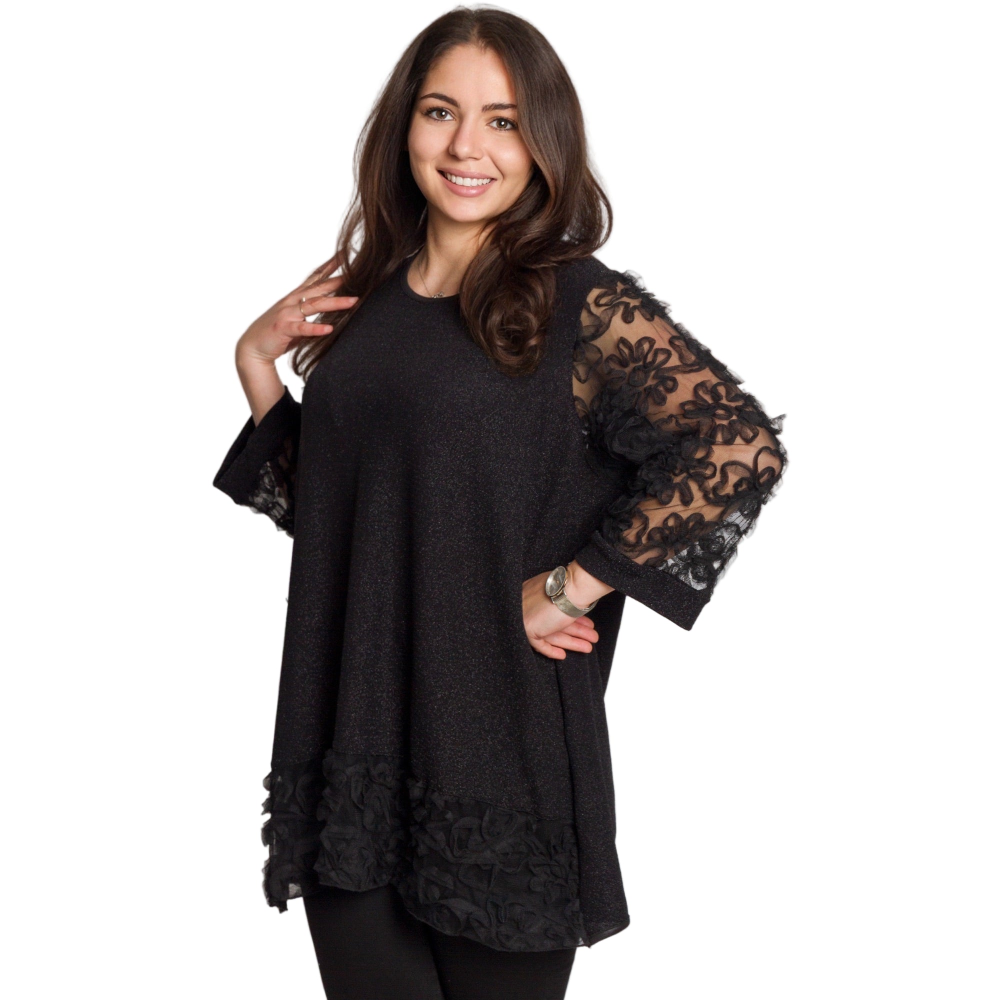Тази стилна черна туника впечатлява с изисканата си визия и финия блясък на материята. Ръкавите и долната част са изработени от прозрачен тюл с 3D флорални орнаменти, които придават елегантност и женственост. Меката и еластична материя осигурява комфорт, а правата кройка стои прекрасно на всяка фигура. Идеален избор за официални поводи, вечерни излизания или празнични събития през есенно-зимния сезон.