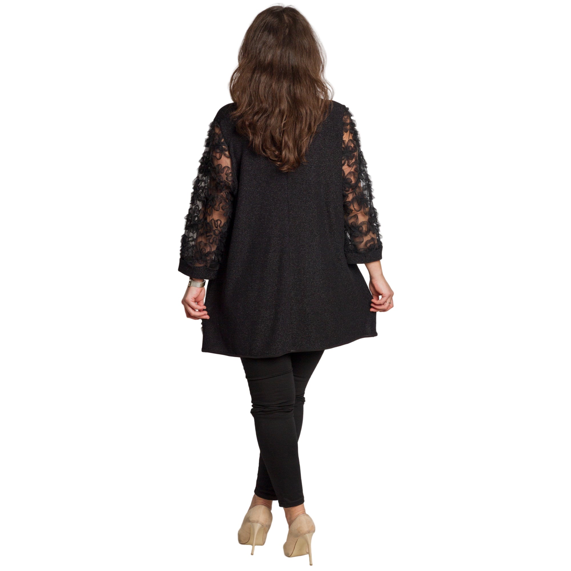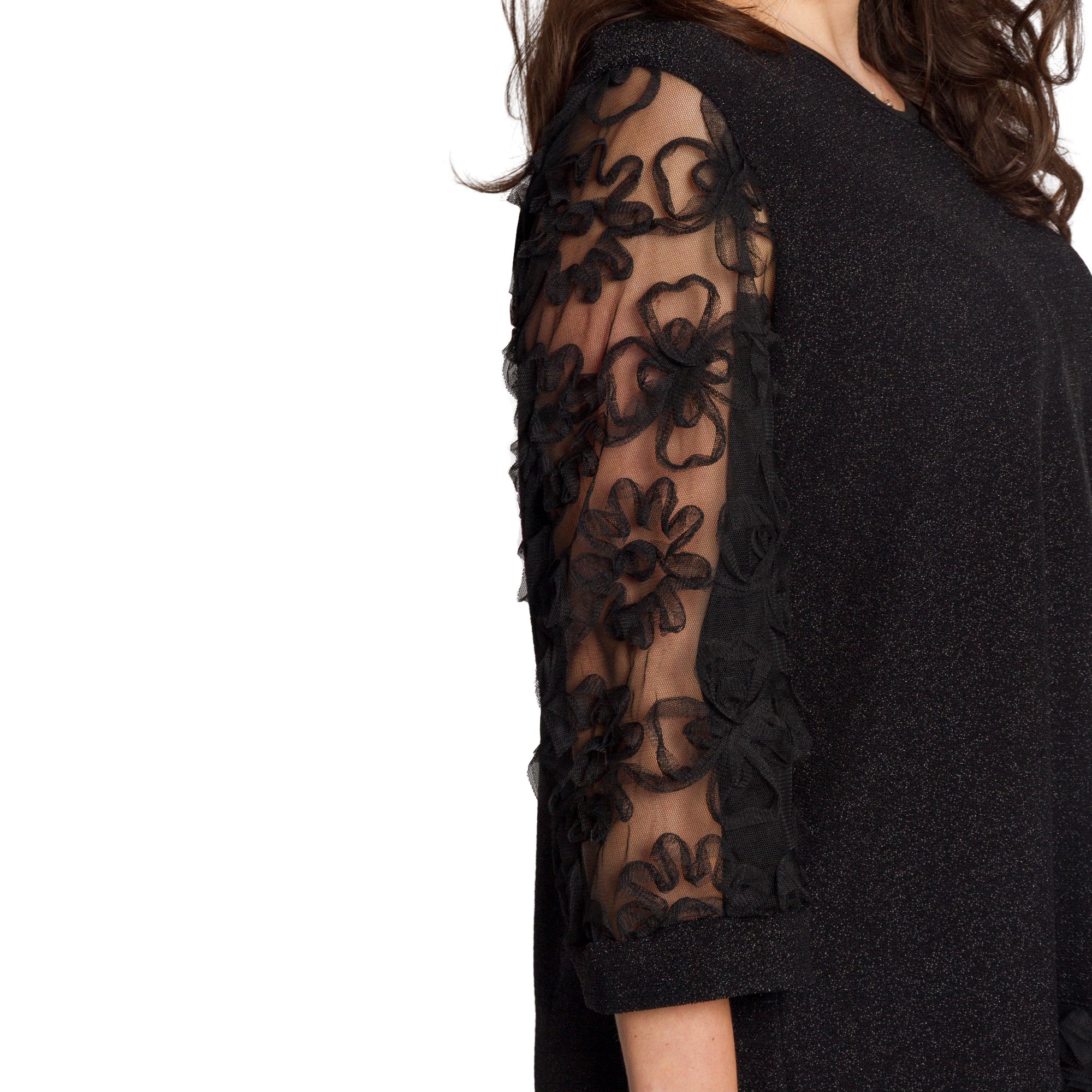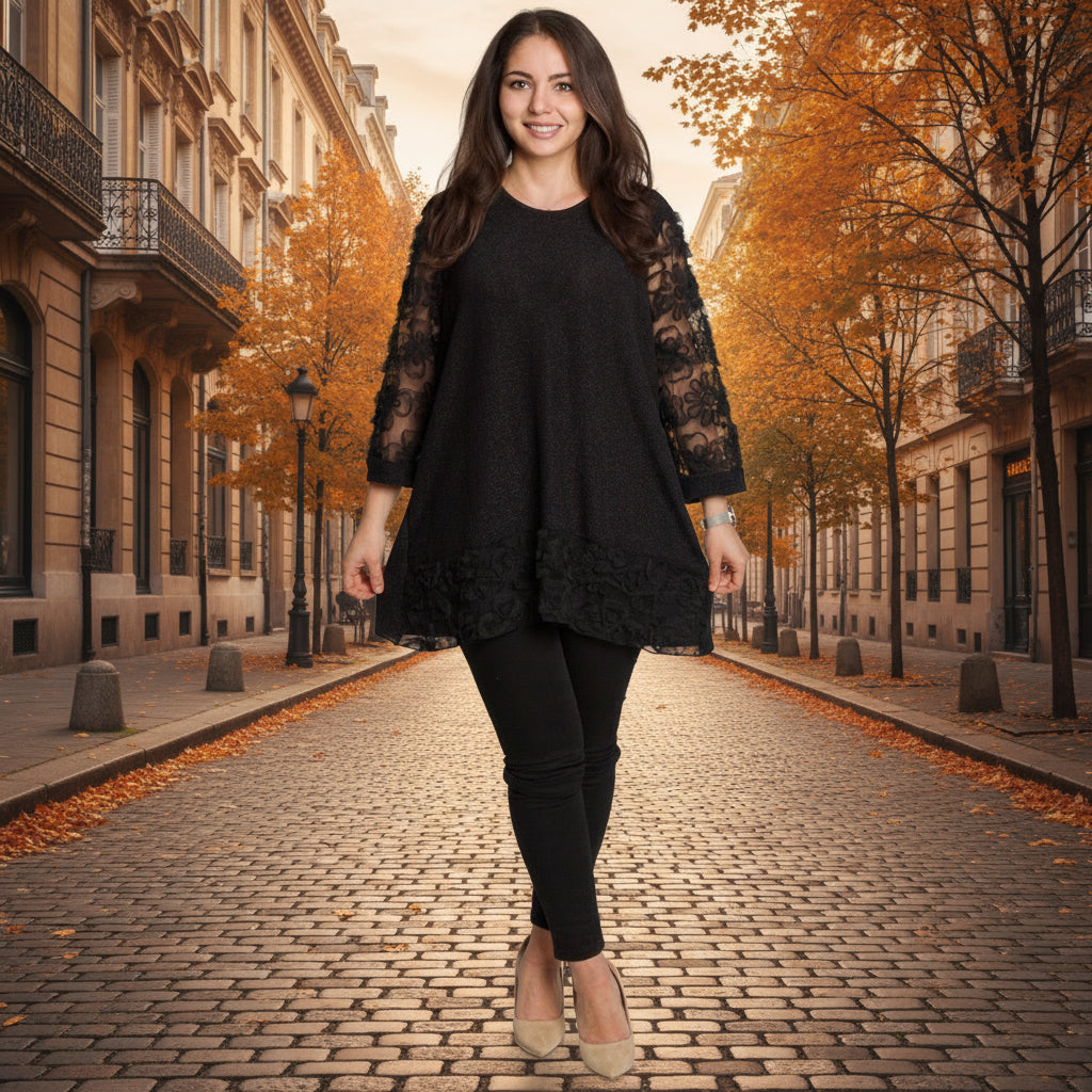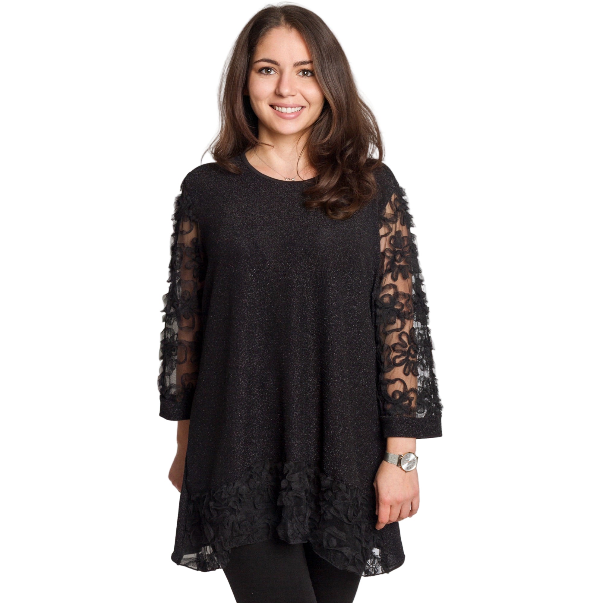 Тази стилна черна туника впечатлява с изисканата си визия и финия блясък на материята. Ръкавите и долната част са изработени от прозрачен тюл с 3D флорални орнаменти, които придават елегантност и женственост. Меката и еластична материя осигурява комфорт, а правата кройка стои прекрасно на всяка фигура. Идеален избор за официални поводи, вечерни излизания или празнични събития през есенно-зимния сезон.
