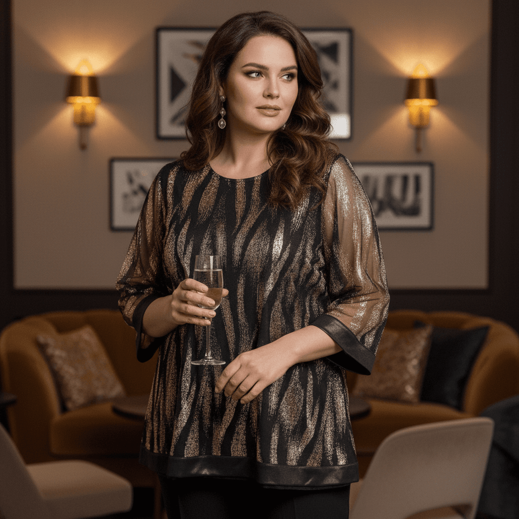 Тази впечатляваща туника комбинира елегантност и модерен блясък. Изработена е от висококачествена материя с полиамид, полиестер и ликра, която осигурява удобство и лекота при носене. Основата е черна, украсена със златист металиков десен, напомнящ на животински мотив, който придава изискан и празничен вид. Прозрачните ръкави и сатенените кантове по края завършват визията с изтънчен акцент. Подходяща е за официални поводи, вечерни излизания и празнични събития през есенно-зимния сезон.