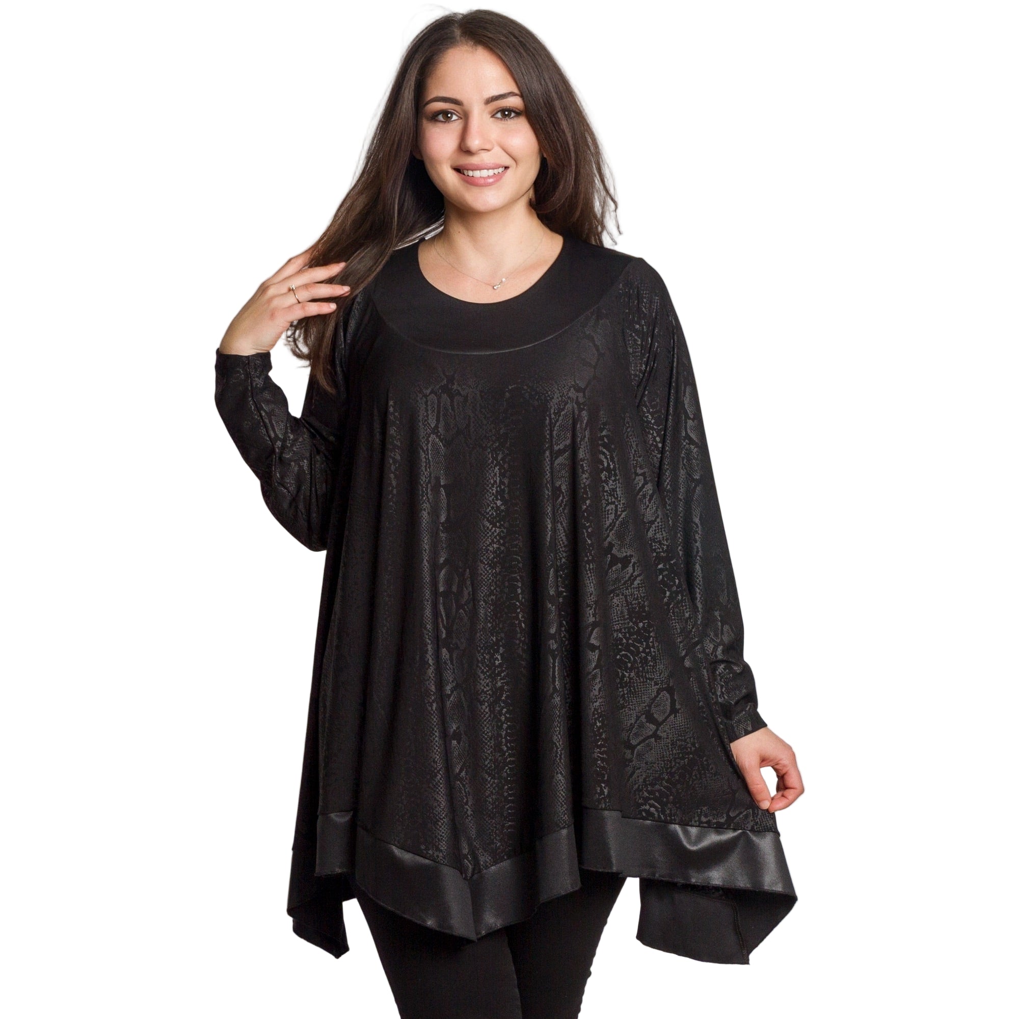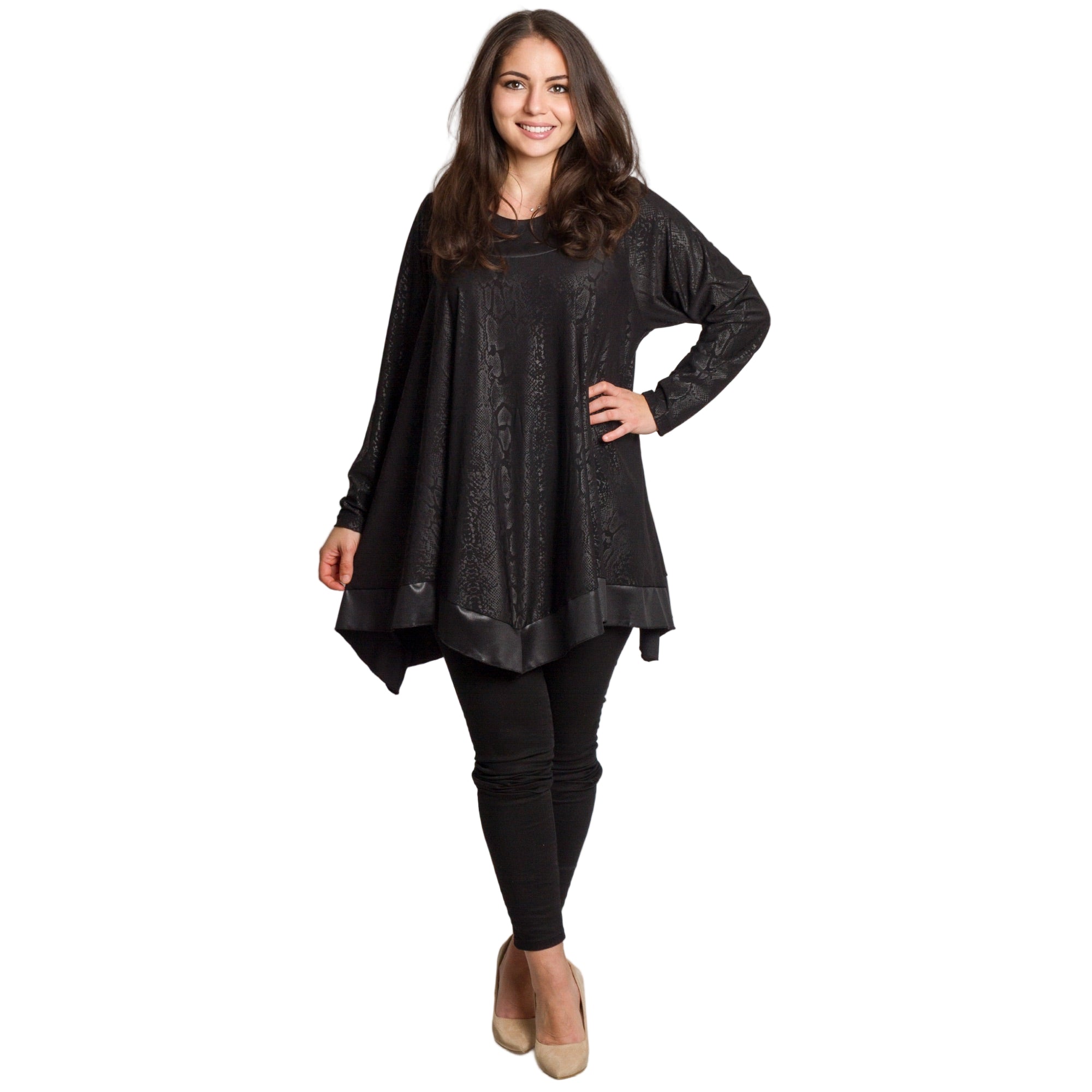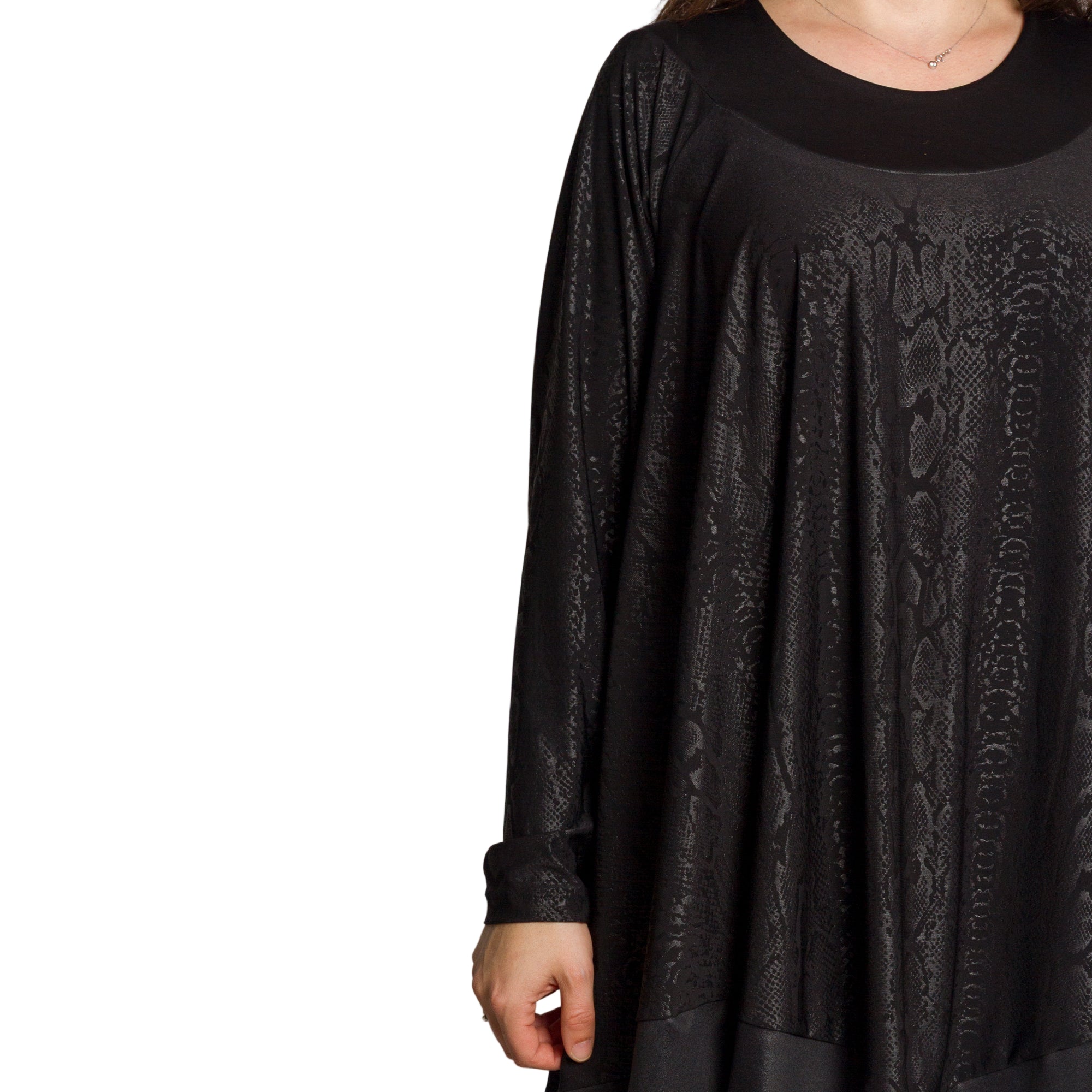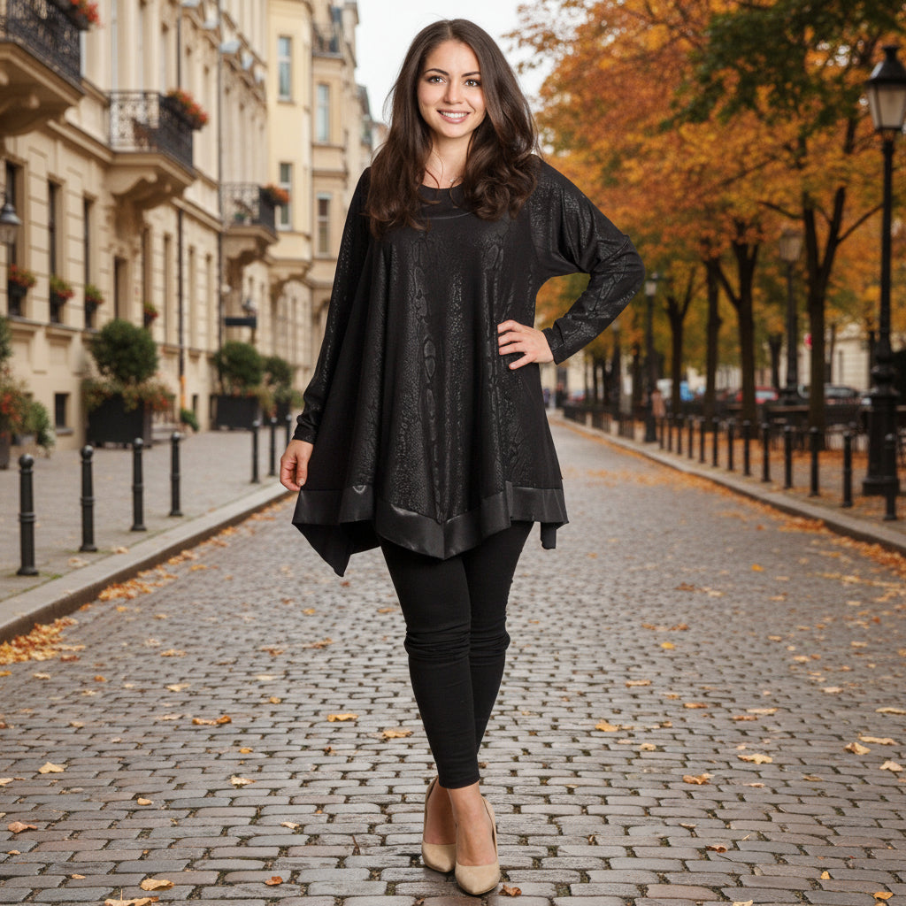 Тази елегантна черна туника с фино релефен змийски десен е създадена за жени, които ценят комфорта и стила. Изработена от 100% вискоза, материята е мека, приятна на допир и с лек сатенен блясък. Разкроената кройка и асиметричният подгъв осигуряват свобода на движението и изящна линия. Облото деколте и дългите ръкави придават завършен и изтънчен вид, подходящ за официални поводи и вечерни излизания.