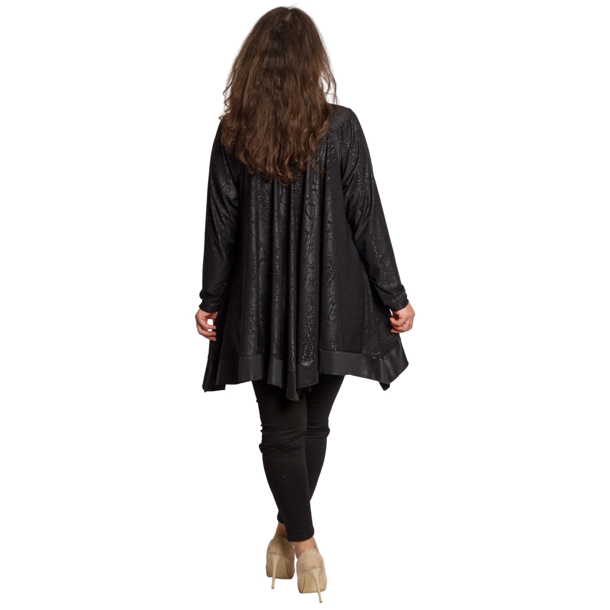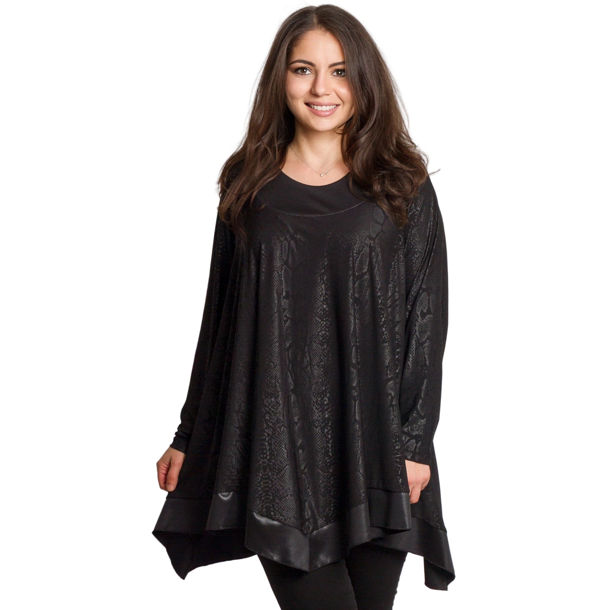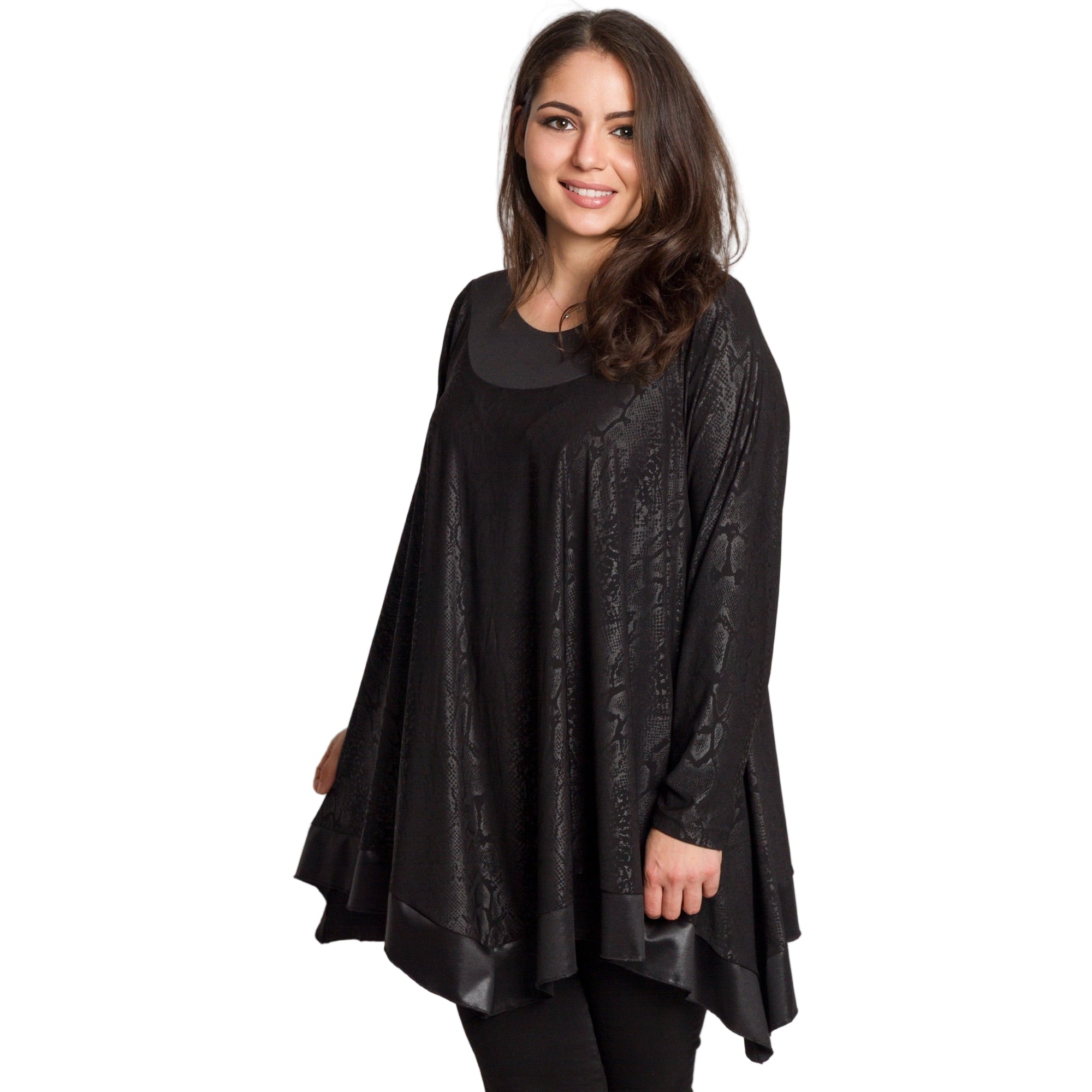 Тази елегантна черна туника с фино релефен змийски десен е създадена за жени, които ценят комфорта и стила. Изработена от 100% вискоза, материята е мека, приятна на допир и с лек сатенен блясък. Разкроената кройка и асиметричният подгъв осигуряват свобода на движението и изящна линия. Облото деколте и дългите ръкави придават завършен и изтънчен вид, подходящ за официални поводи и вечерни излизания.