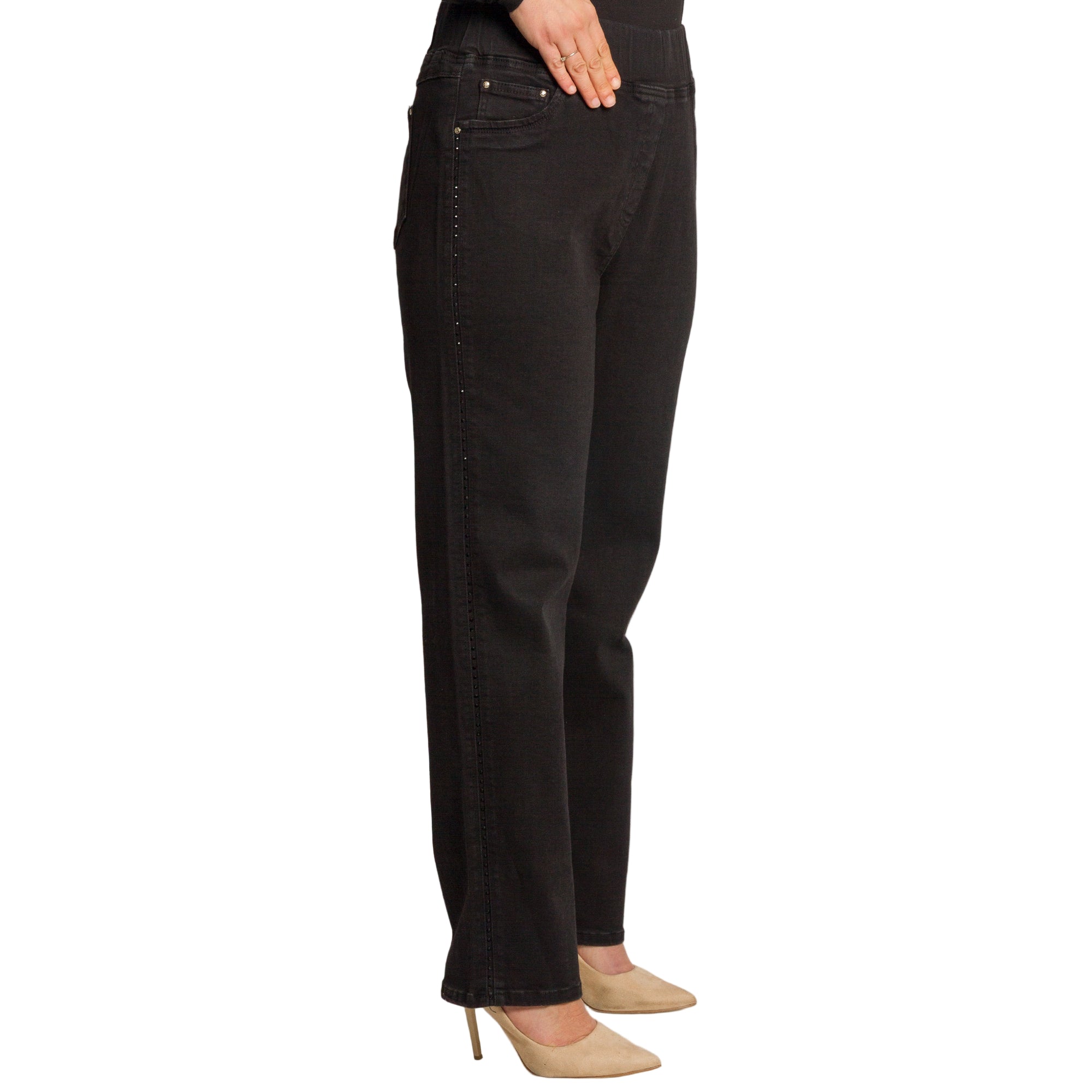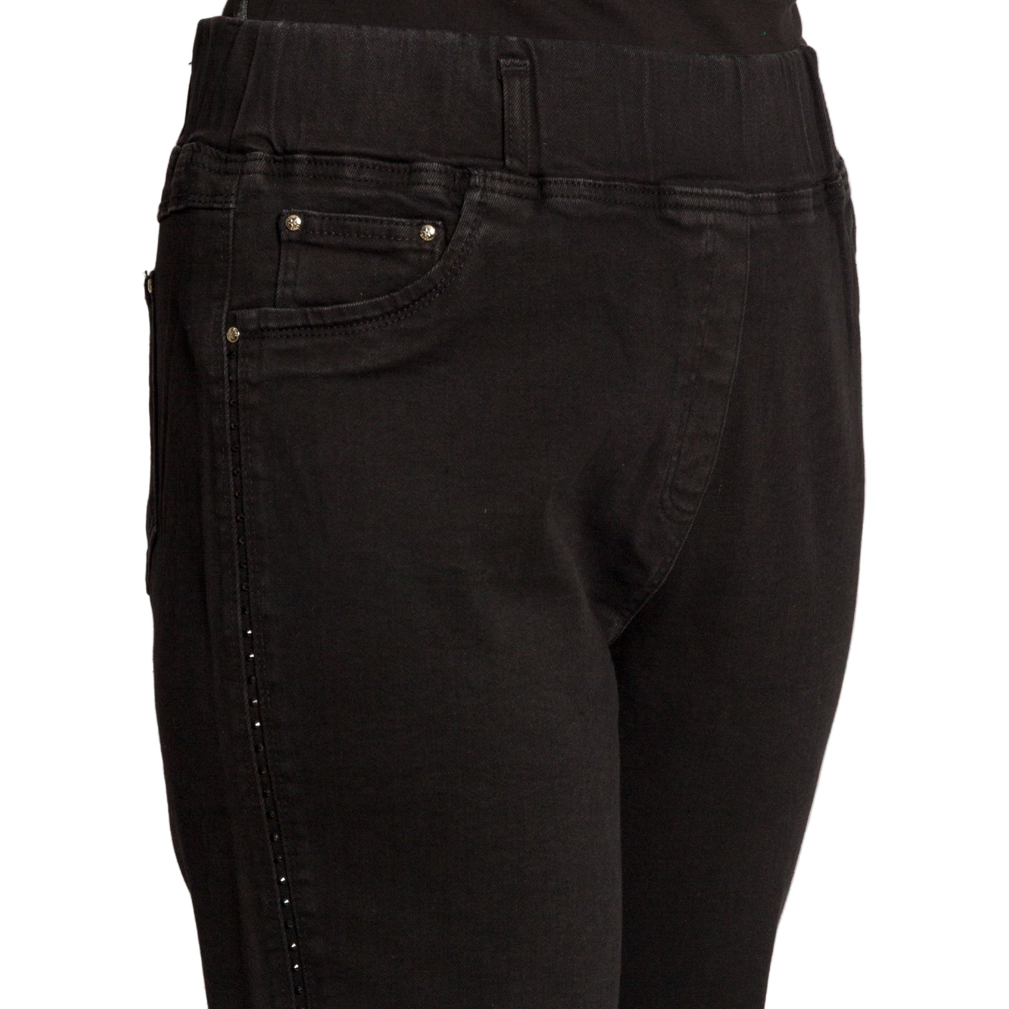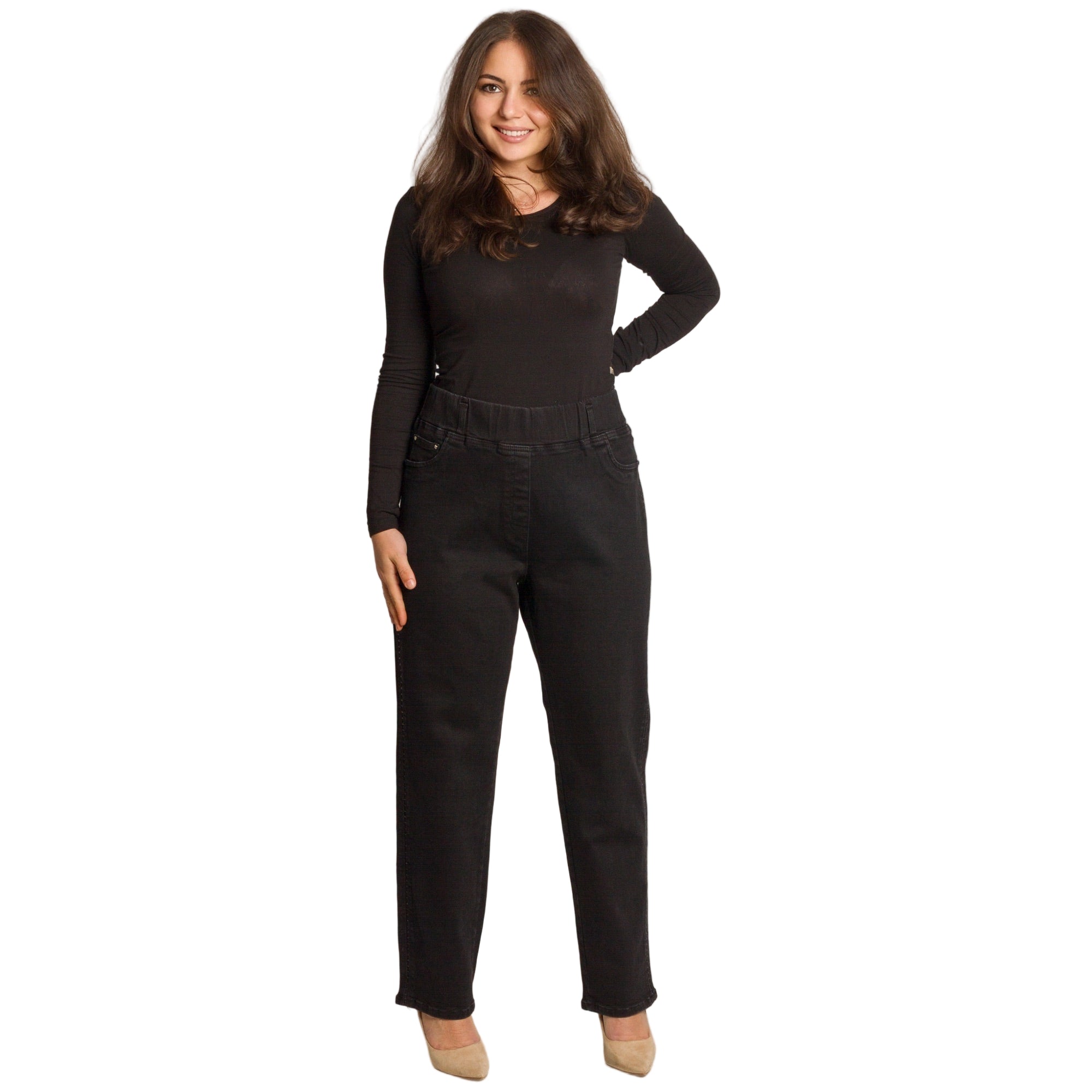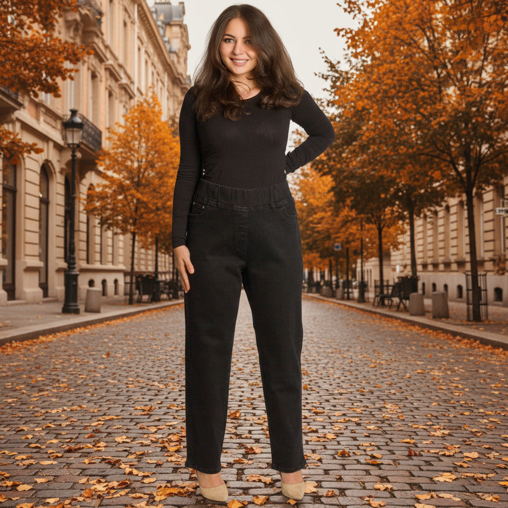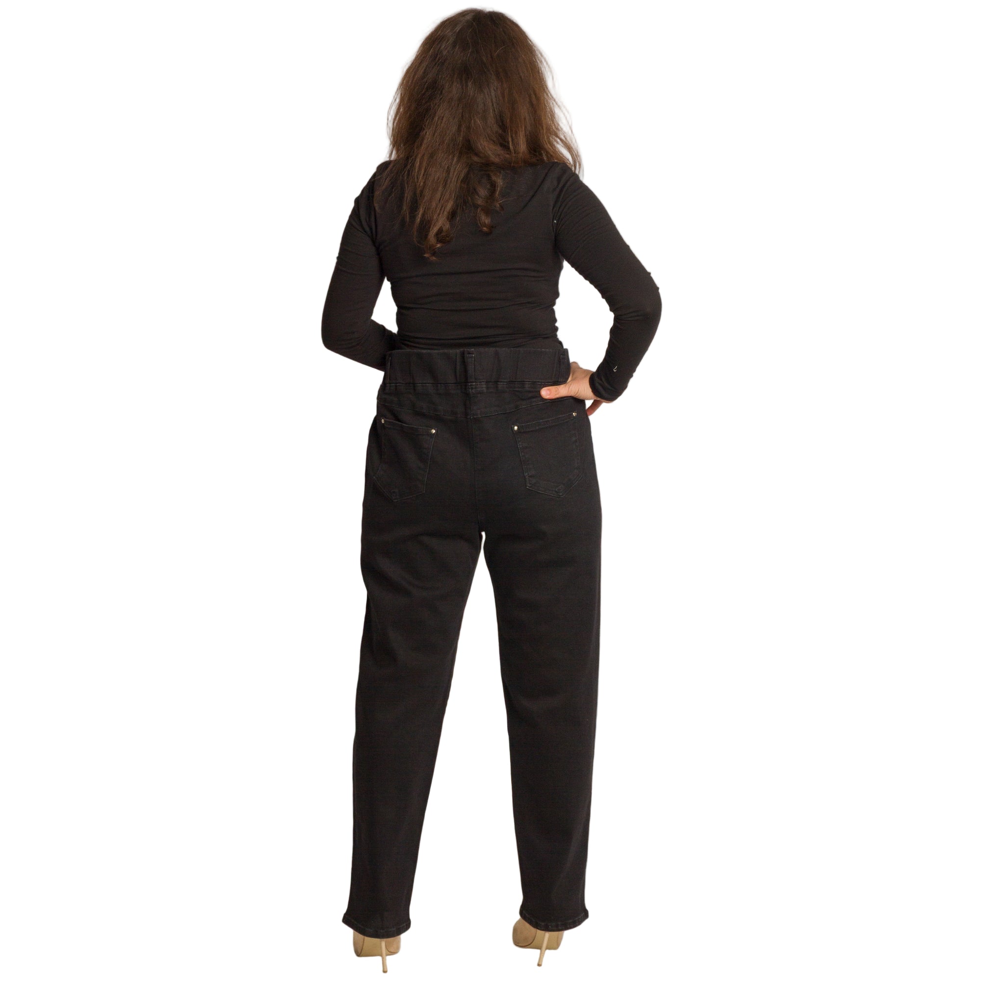 Тези черни дамски дънки в големи размери съчетават комфорт и стил, за да се чувствате уверени всеки ден. Изработени са от мека и еластична памучна материя с добавен еластан, която осигурява свобода на движение и отлично прилягане към фигурата. Моделът е с висока талия, еластичен колан и свободна кройка, която подчертава силуета, без да пристяга. Подходящи са както за ежедневието, така и за по-официални визии през есенно-зимния сезон. Декоративните детайли и изчистената линия придават модерна и изискана визия.