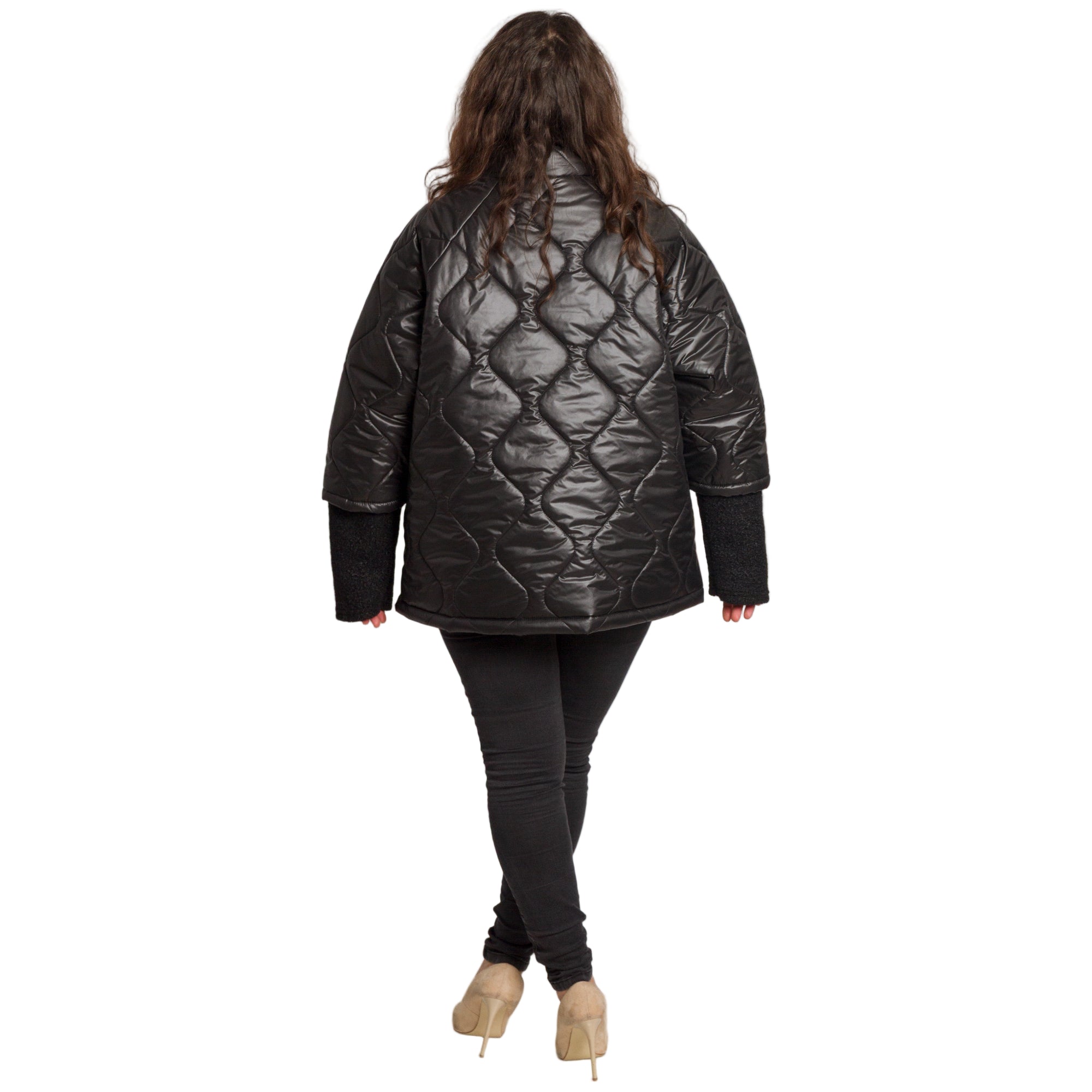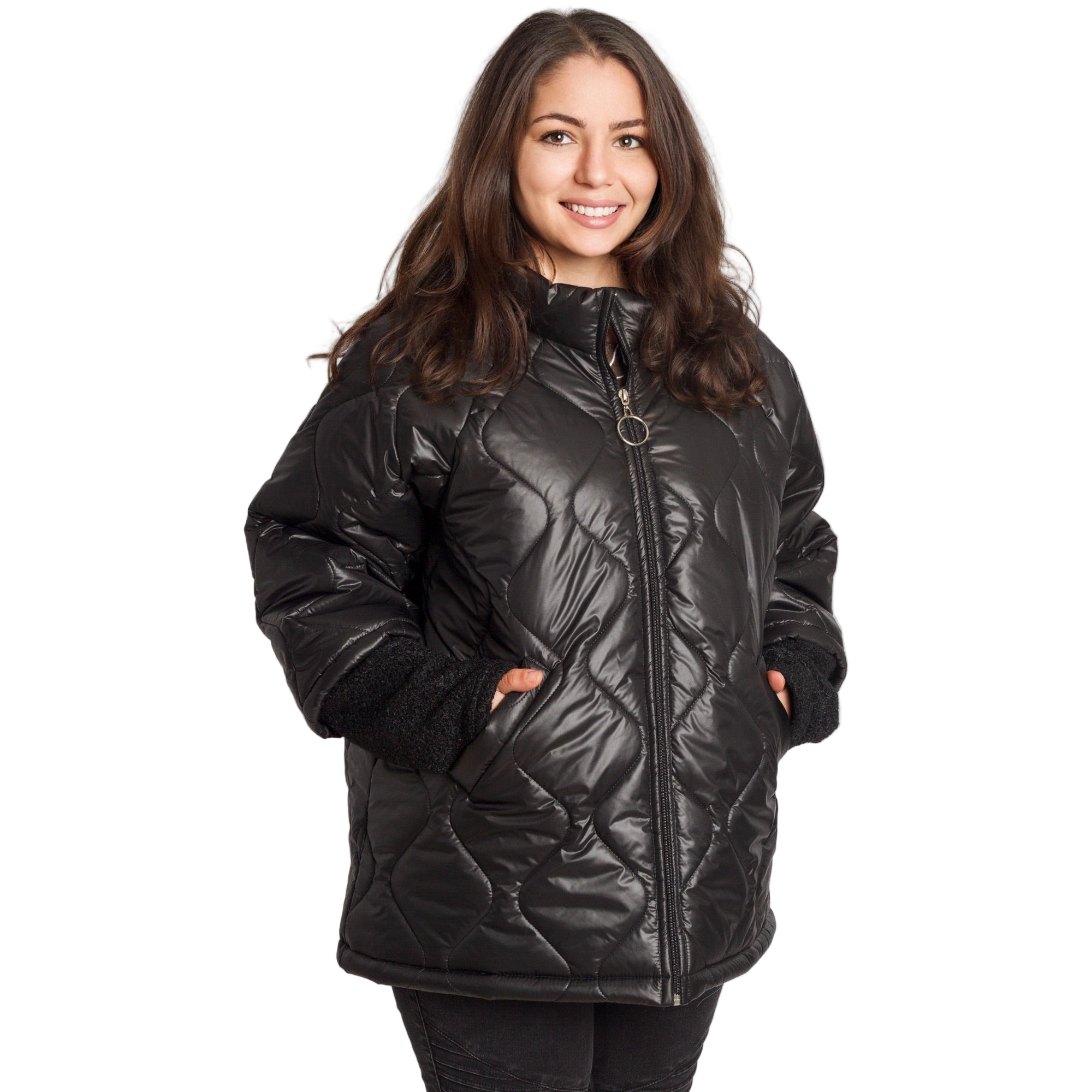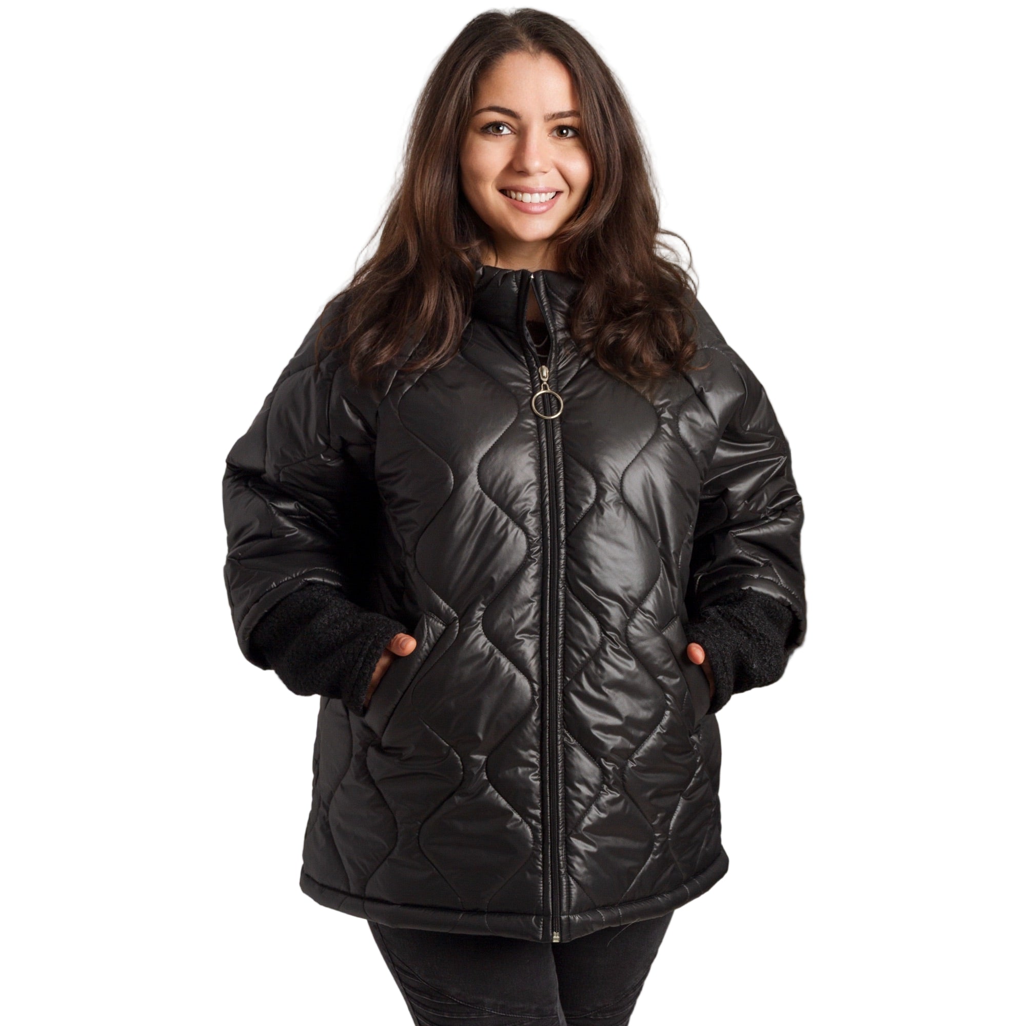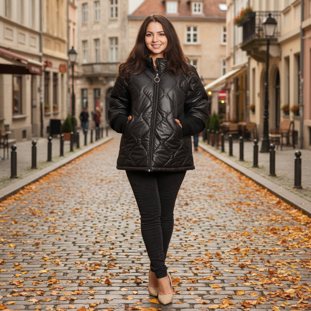 Това стилно черно яке е перфектният избор за есенно-зимния сезон. Изработено от висококачествена материя с лека еластичност, моделът осигурява комфорт и свобода на движение. Правата кройка подчертава фигурата, а капитонираният дизайн добавя модерен акцент. Закопчава се с цип с декоративен метален пръстен, а джобовете отпред осигуряват удобство и топлина. Подходящо е както за ежедневието, така и за по-официални поводи.