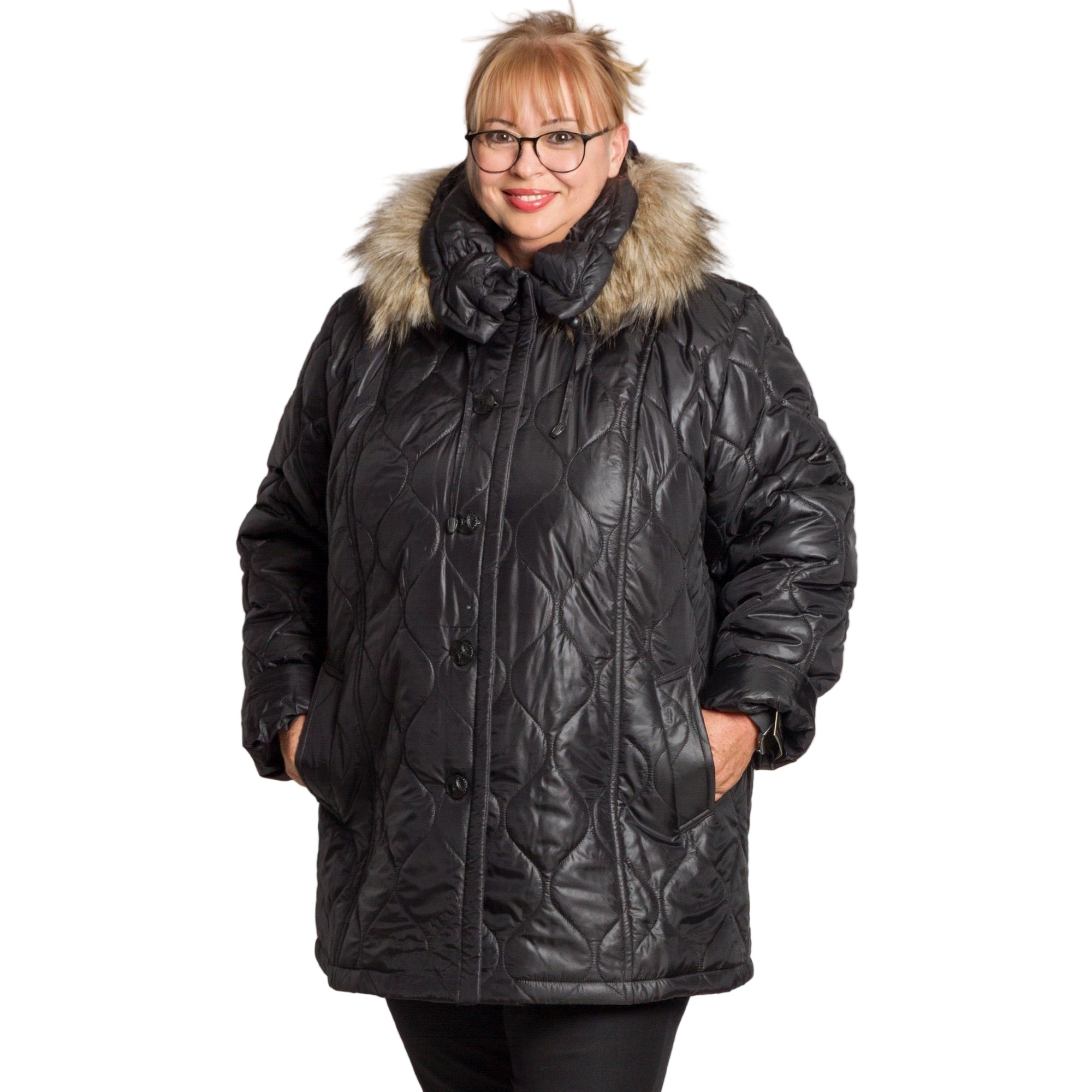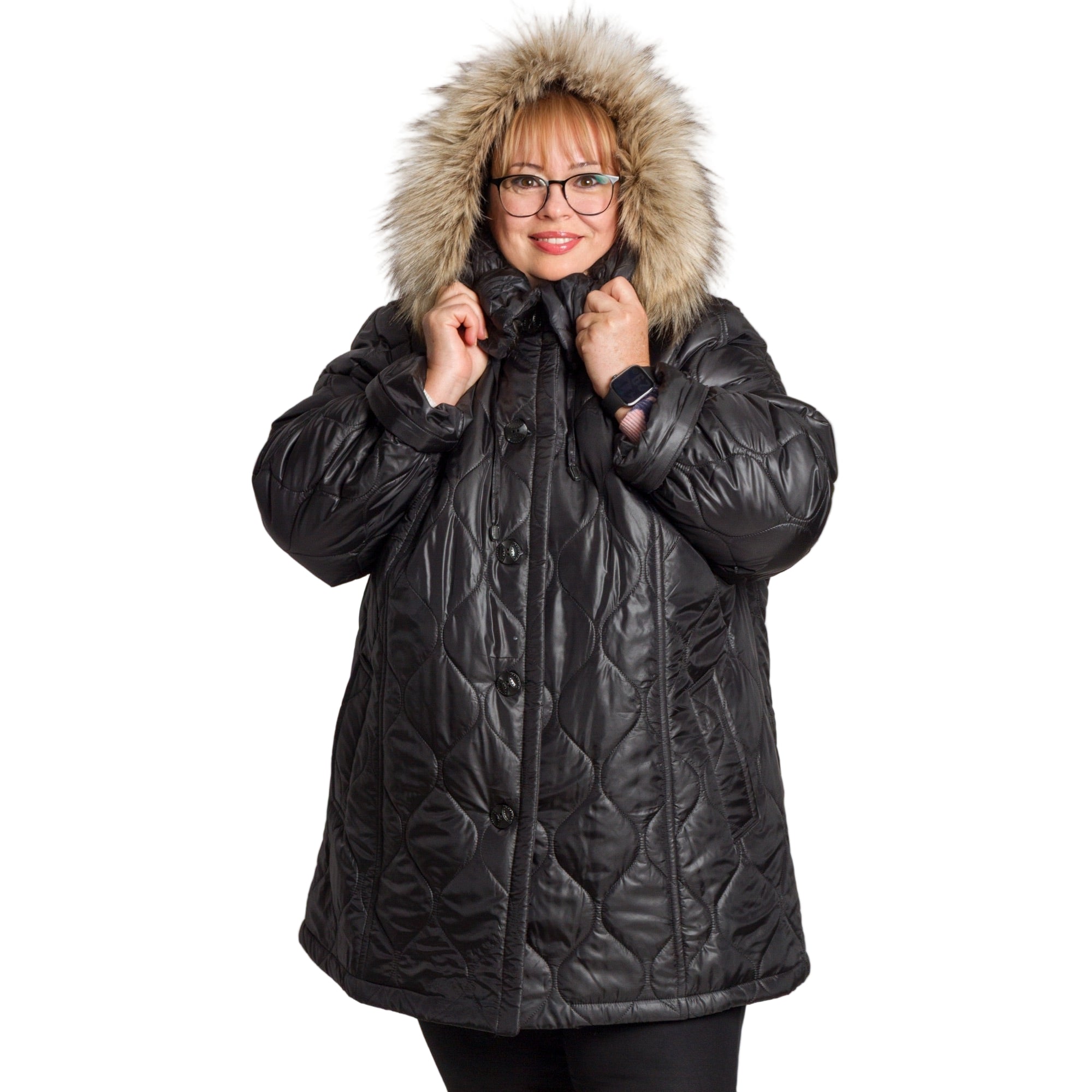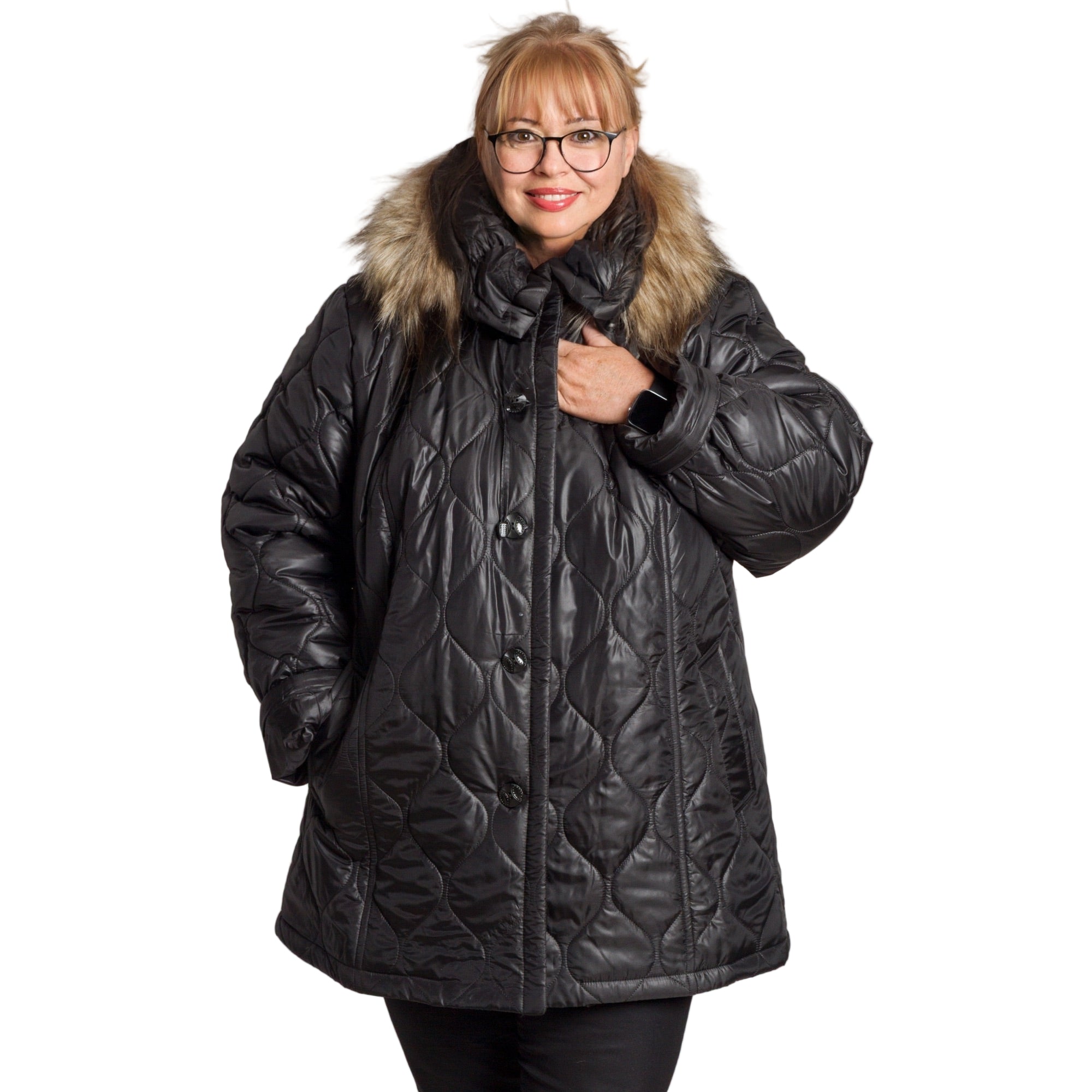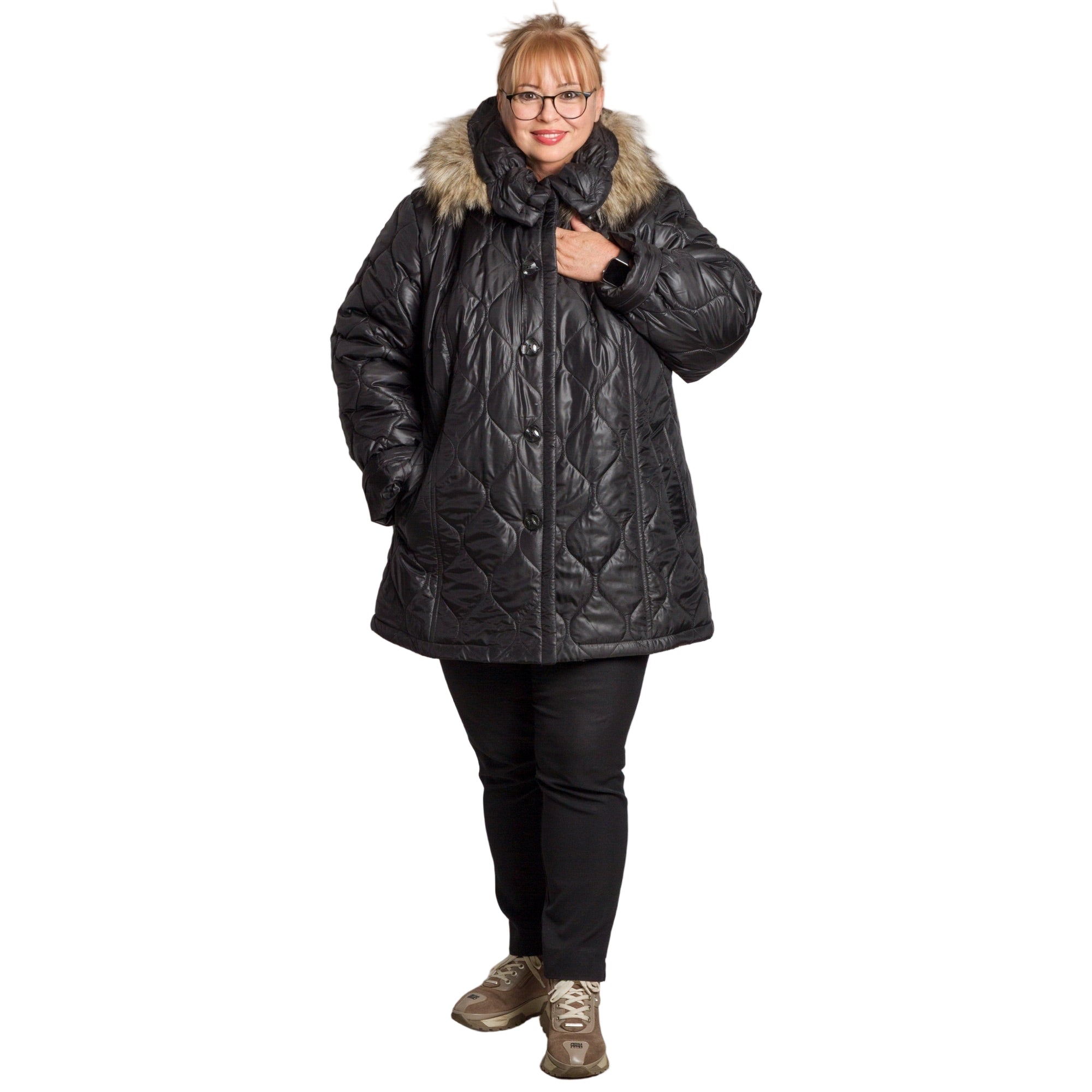 Елегантно и практично, това черно дамско яке в големи размери е перфектният избор за студените есенно-зимни дни. Моделът е изработен от висококачествена смес от памук, полиестер и ликра, осигуряваща топлина, мекота и леко еластично усещане за комфорт. Якето е капитонирано с ефектна релефна шарка и разкроена кройка, която подчертава фигурата, без да ограничава движенията. Качулката е сваляема и декорирана с пух от изкуствен косъм, придаващ стил и уют. Подходящо както за ежедневието, така и за по-елегантни поводи.