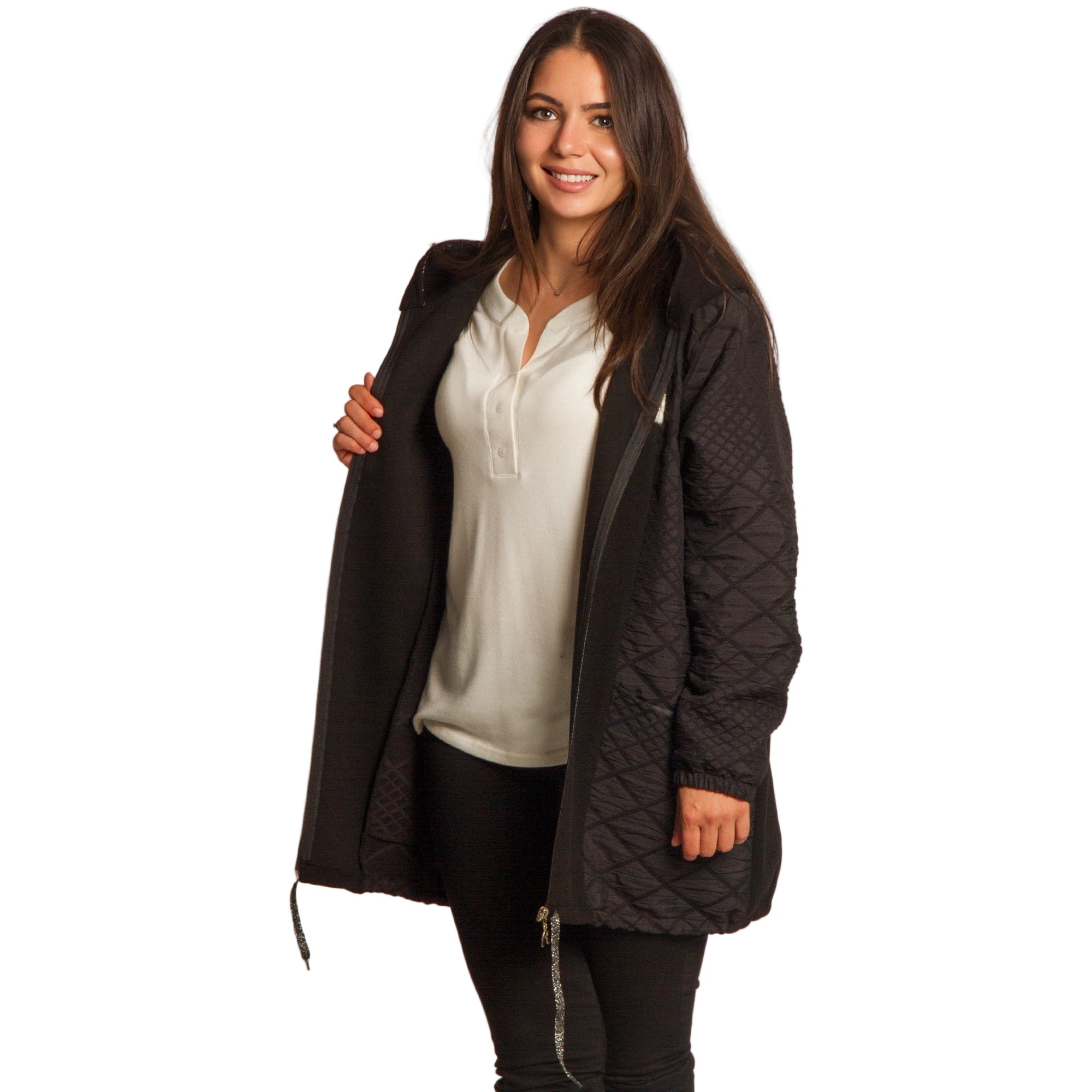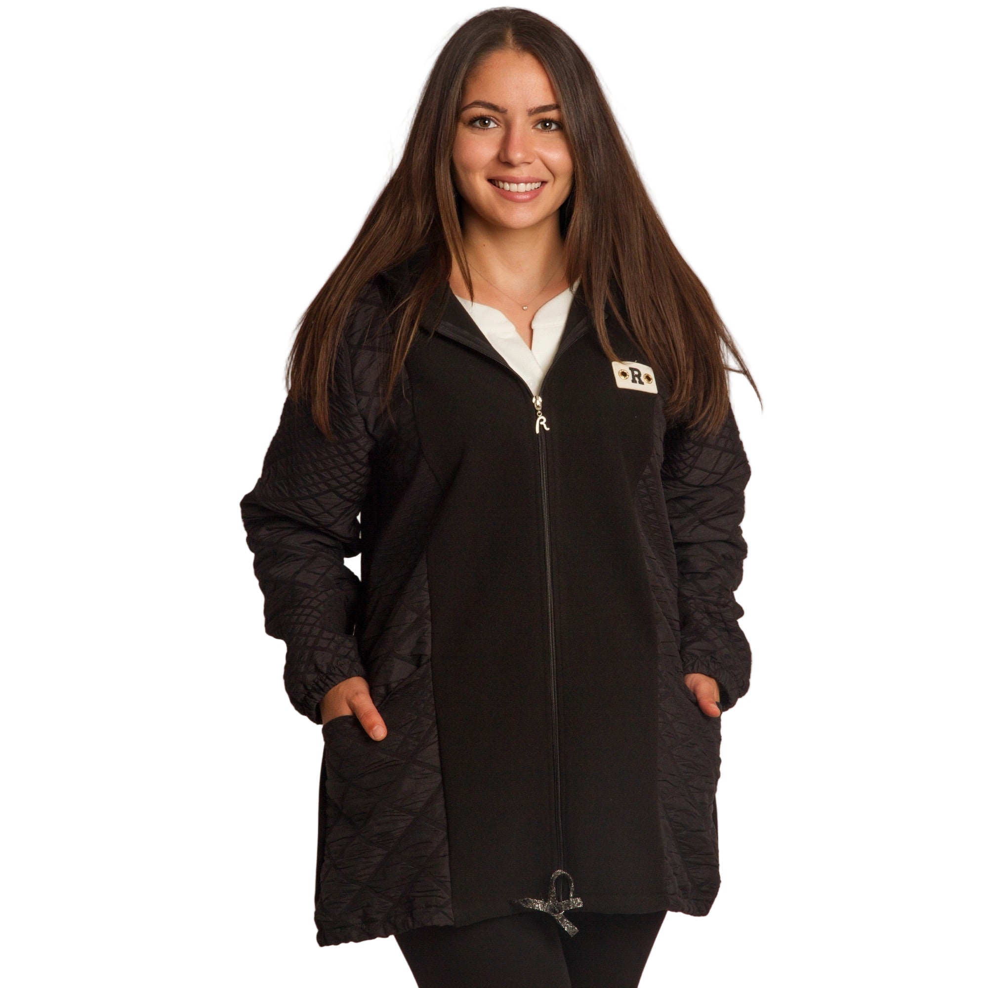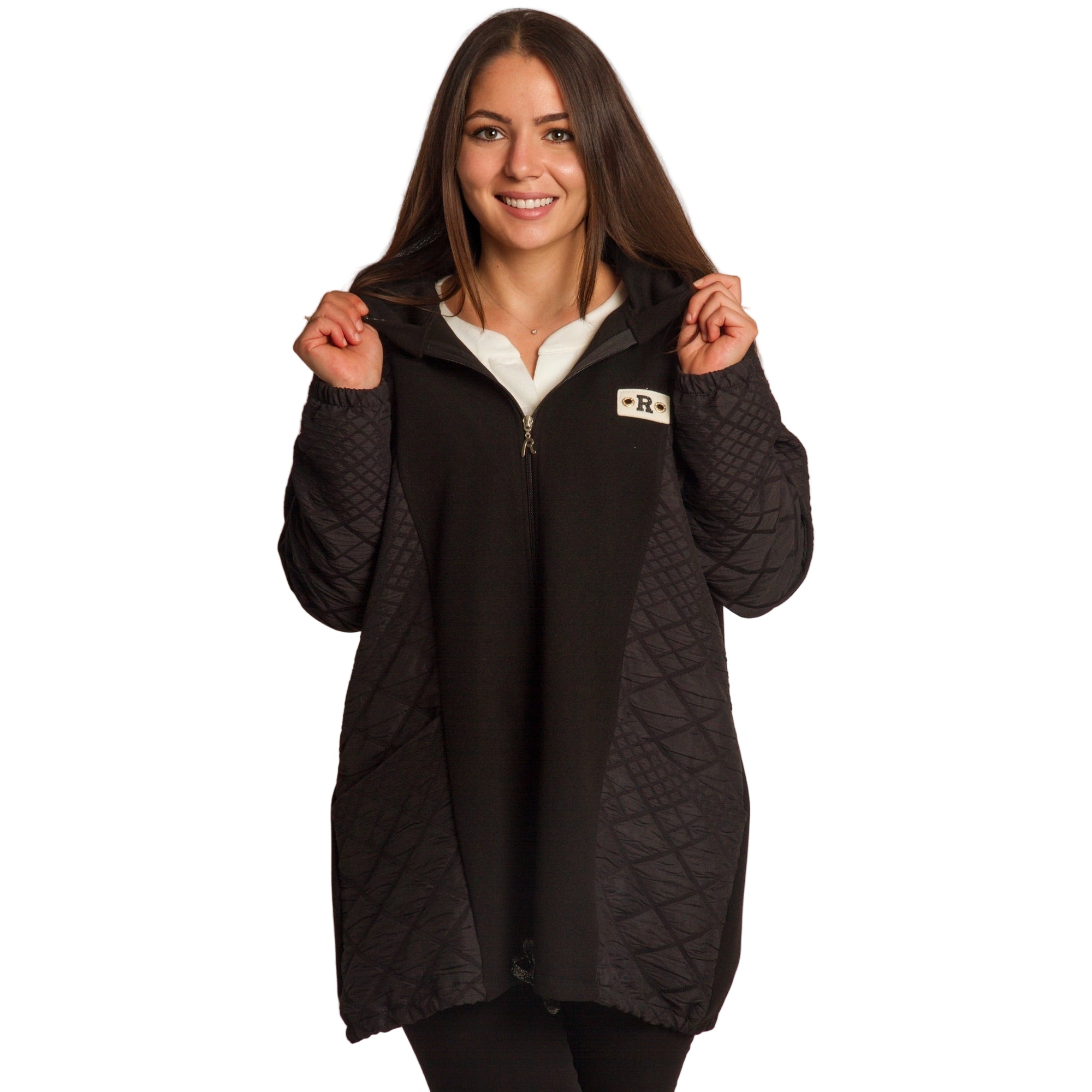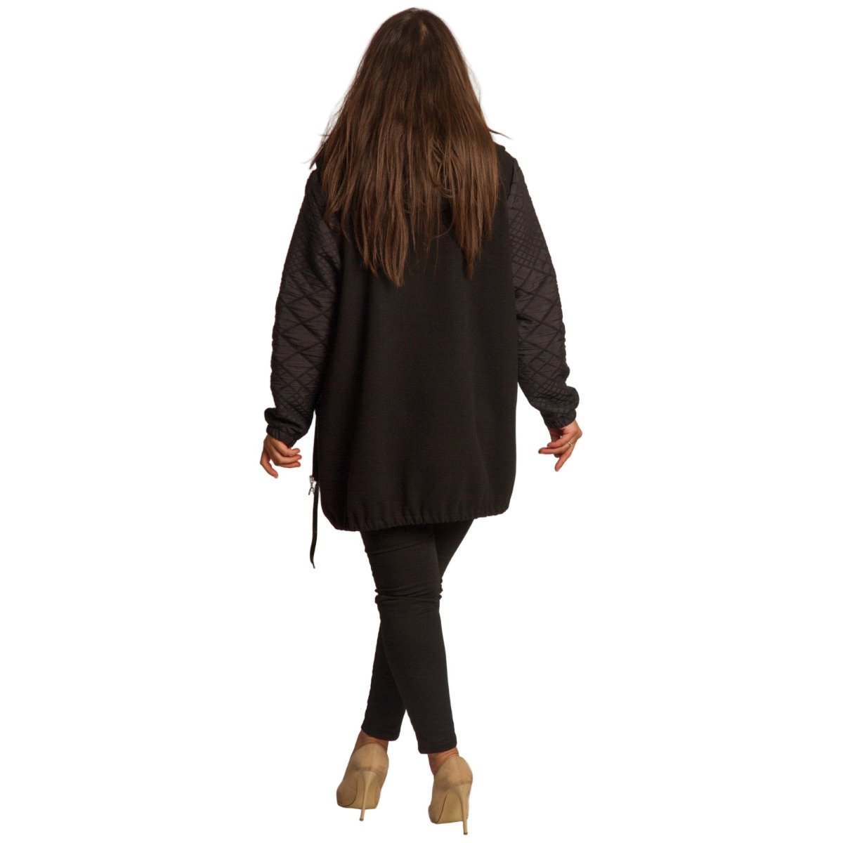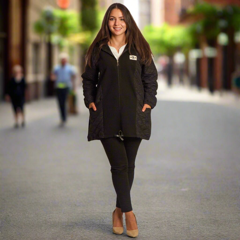 Стилно и практично дамско яке в черен цвят, изработено от висококачествена вълна и акрил, което осигурява топлина и комфорт през студените дни. Моделът е с права и свободна кройка, подходящ както за ежедневни, така и за по-официални поводи. Разполага с два удобни джоба и закопчаване с цип по цялата дължина. Декоративните шевове по ръкавите и страните придават елегантен акцент. Подходящо е за есенно-зимния сезон.