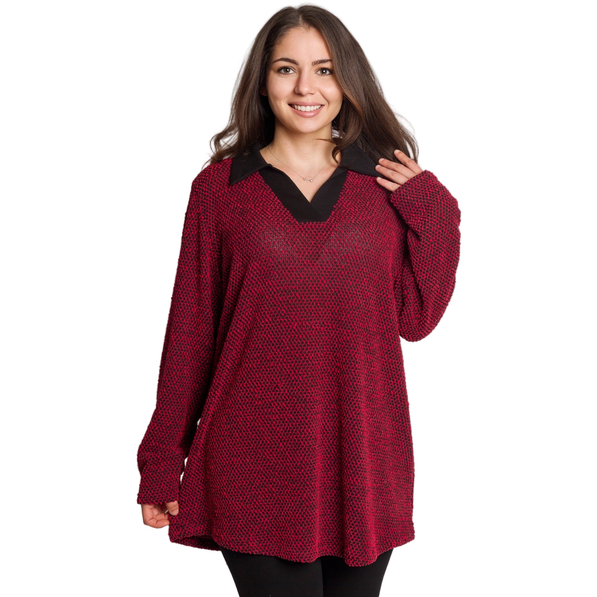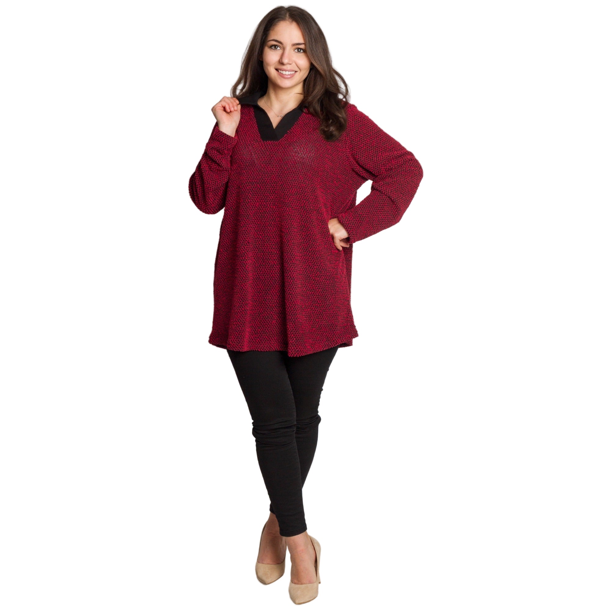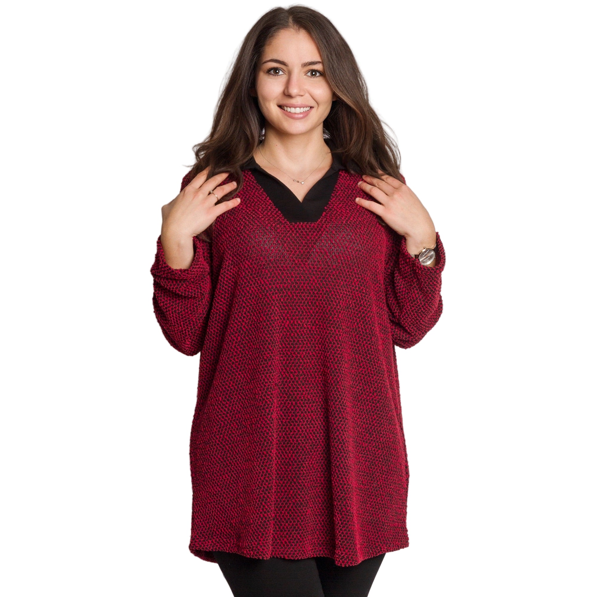 Стилна и впечатляваща туника в червен цвят с контрастна черна яка и V-образно деколте. Материята е текстурирана, еластична и стои красиво върху тялото, без да прилепва. Съставът от полиамид, полиестер и ликра осигурява комфорт, лекота и свобода на движение през целия ден. Правата кройка и структурата на плата прикриват зоните, които жените не желаят да подчертават, a деколтето издължава визуално силуета. Туниката е подходяща както за ежедневието, така и за по-елегантни визии.