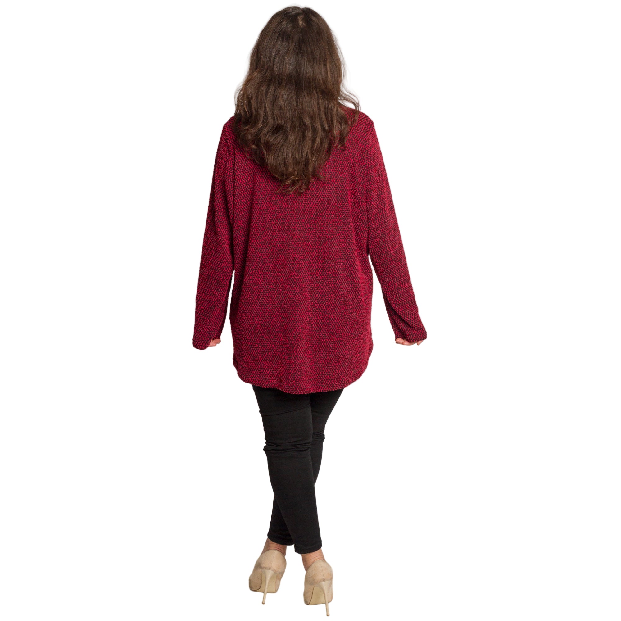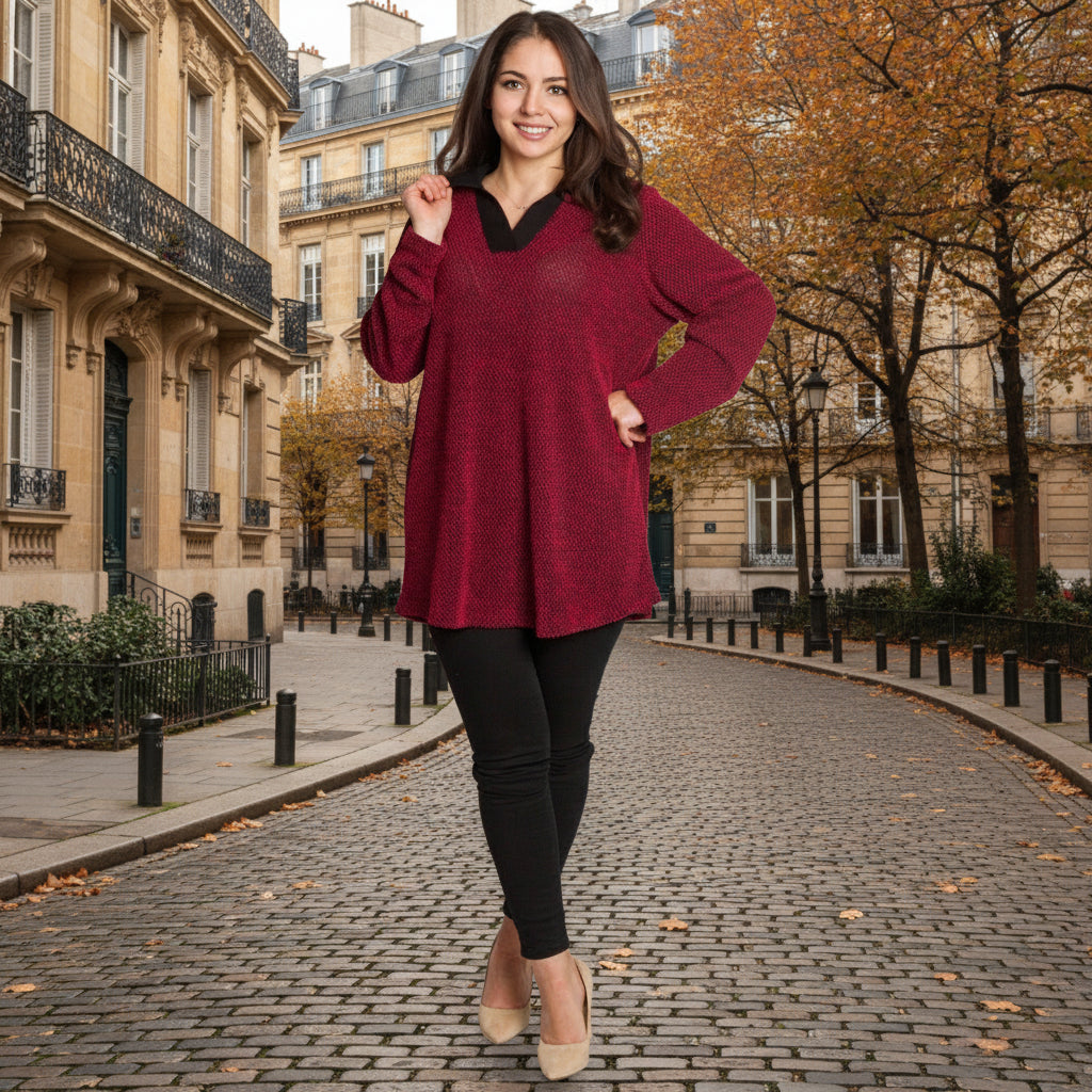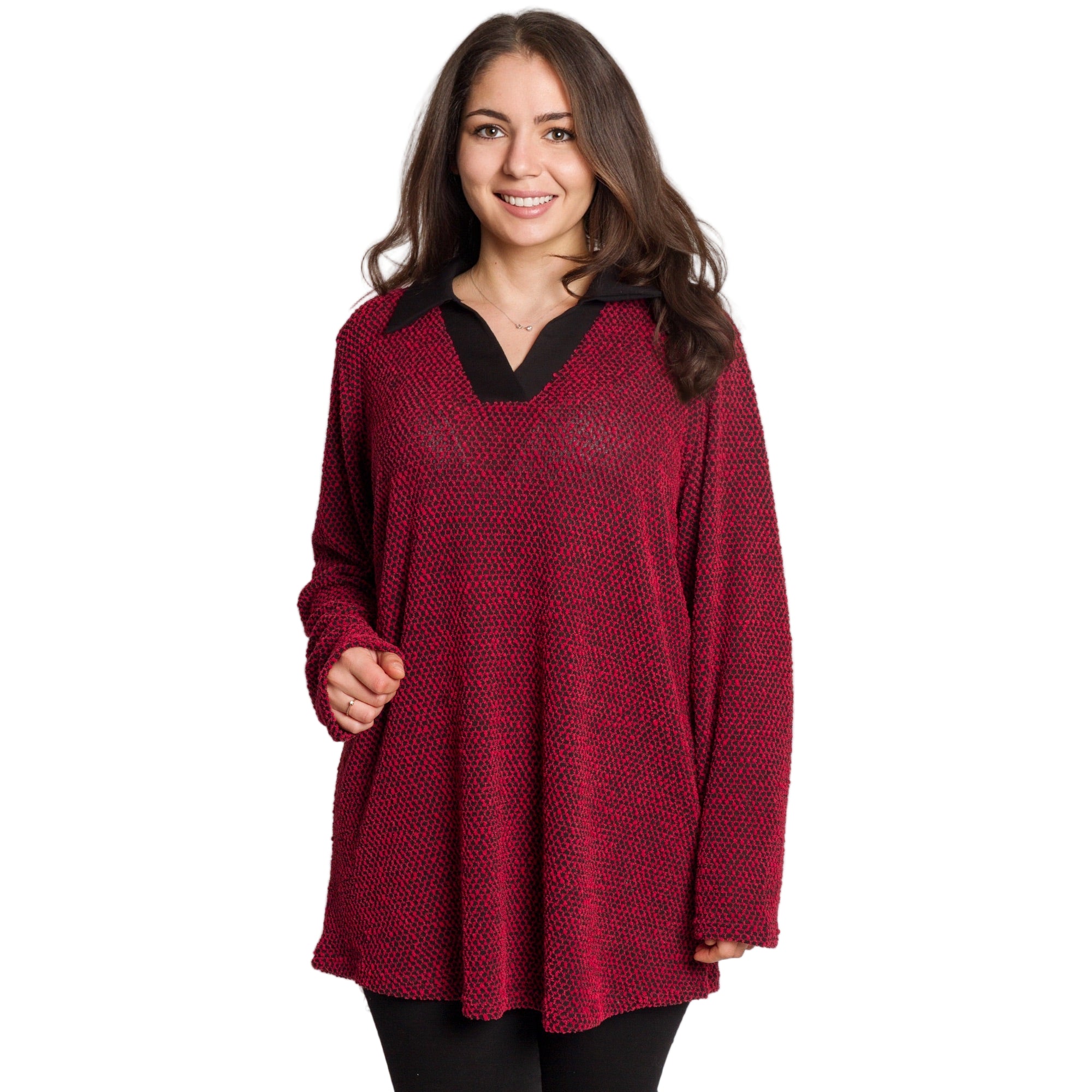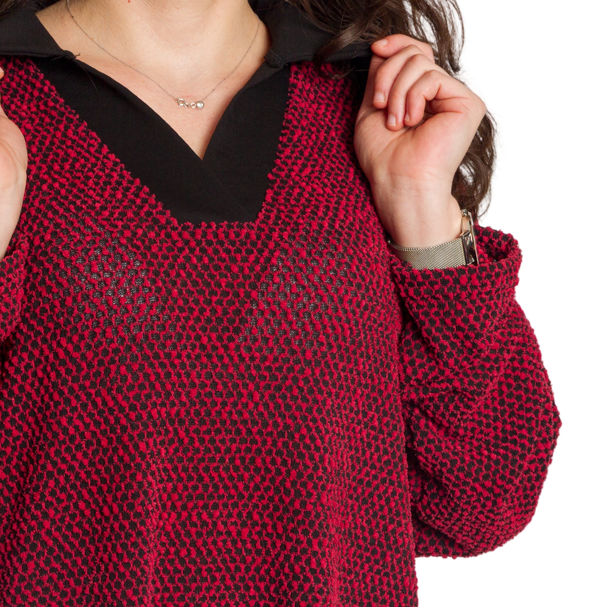 Стилна и впечатляваща туника в червен цвят с контрастна черна яка и V-образно деколте. Материята е текстурирана, еластична и стои красиво върху тялото, без да прилепва. Съставът от полиамид, полиестер и ликра осигурява комфорт, лекота и свобода на движение през целия ден. Правата кройка и структурата на плата прикриват зоните, които жените не желаят да подчертават, a деколтето издължава визуално силуета. Туниката е подходяща както за ежедневието, така и за по-елегантни визии.