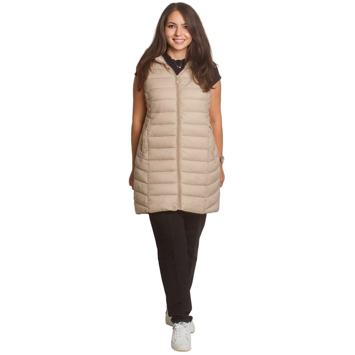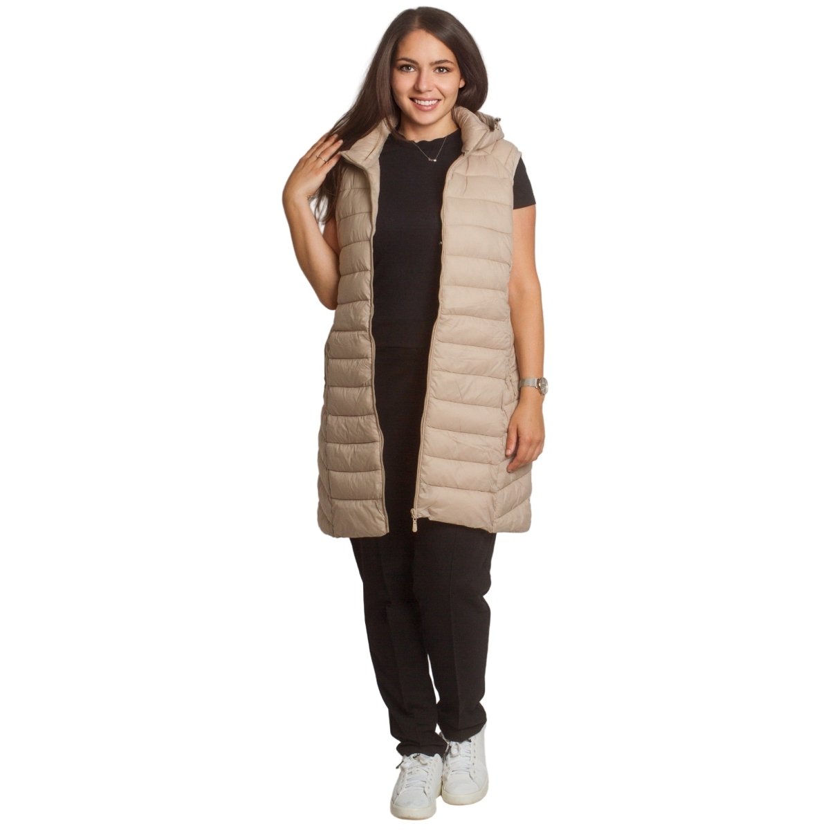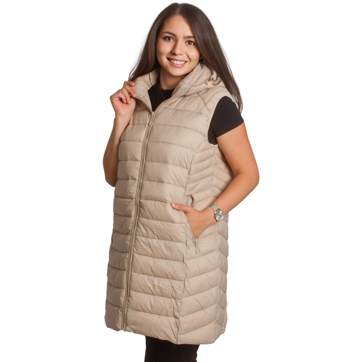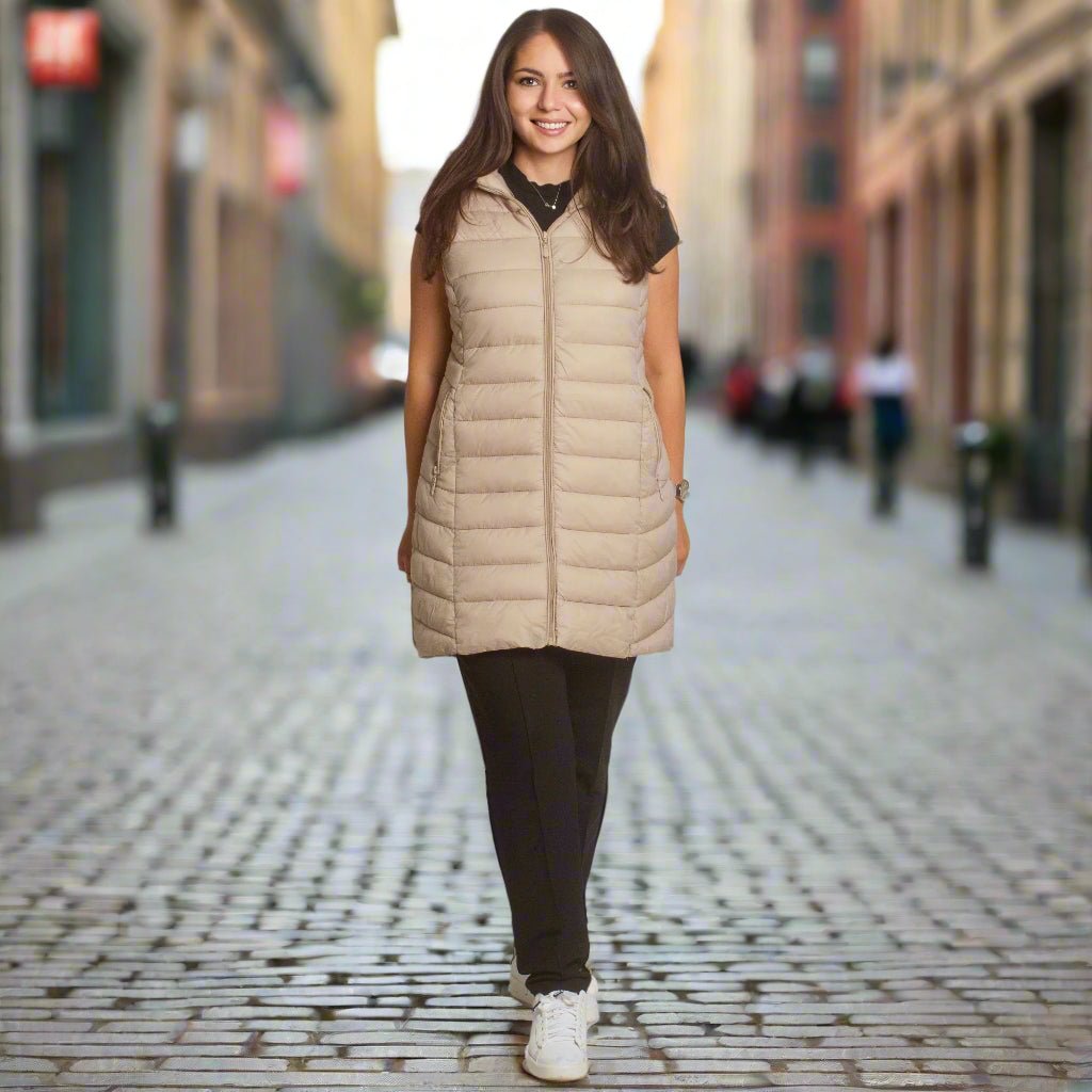 Стилен и практичен дълъг елек в бежов цвят, изработен от лека и удобна материя. Моделът е с права кройка, която подчертава силуета и осигурява свобода на движение. Елекът разполага с джобове с цип и висока яка, която предпазва от вятър. Закопчава се с дълъг цип по цялата дължина. Подходящ е както за ежедневни разходки, така и за по-елегантна визия през есенно-зимния сезон.