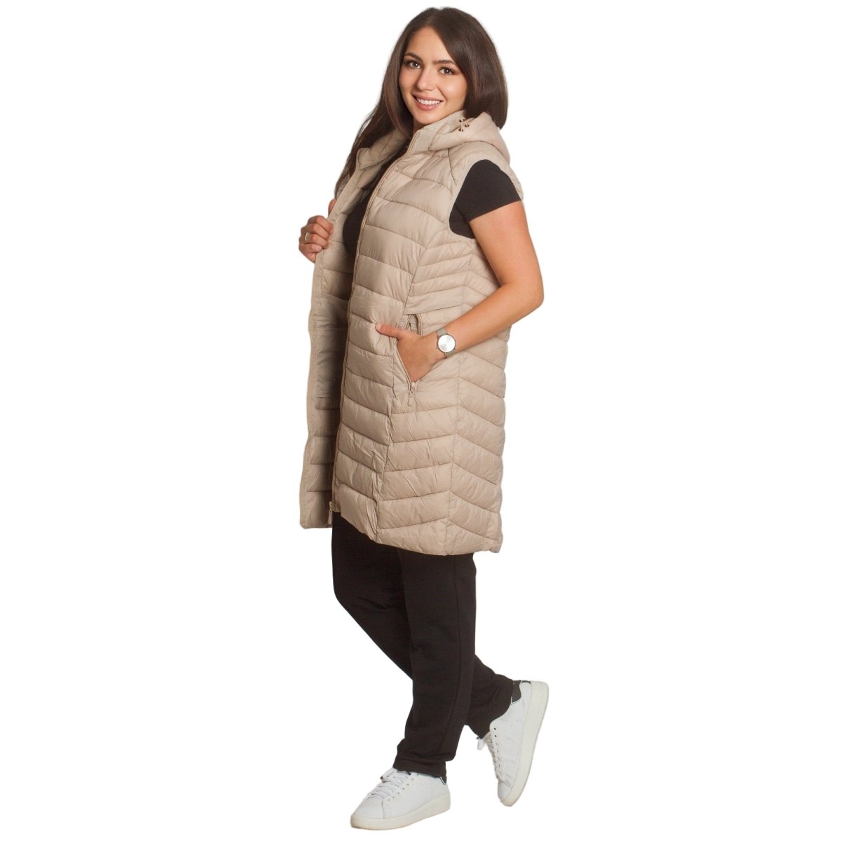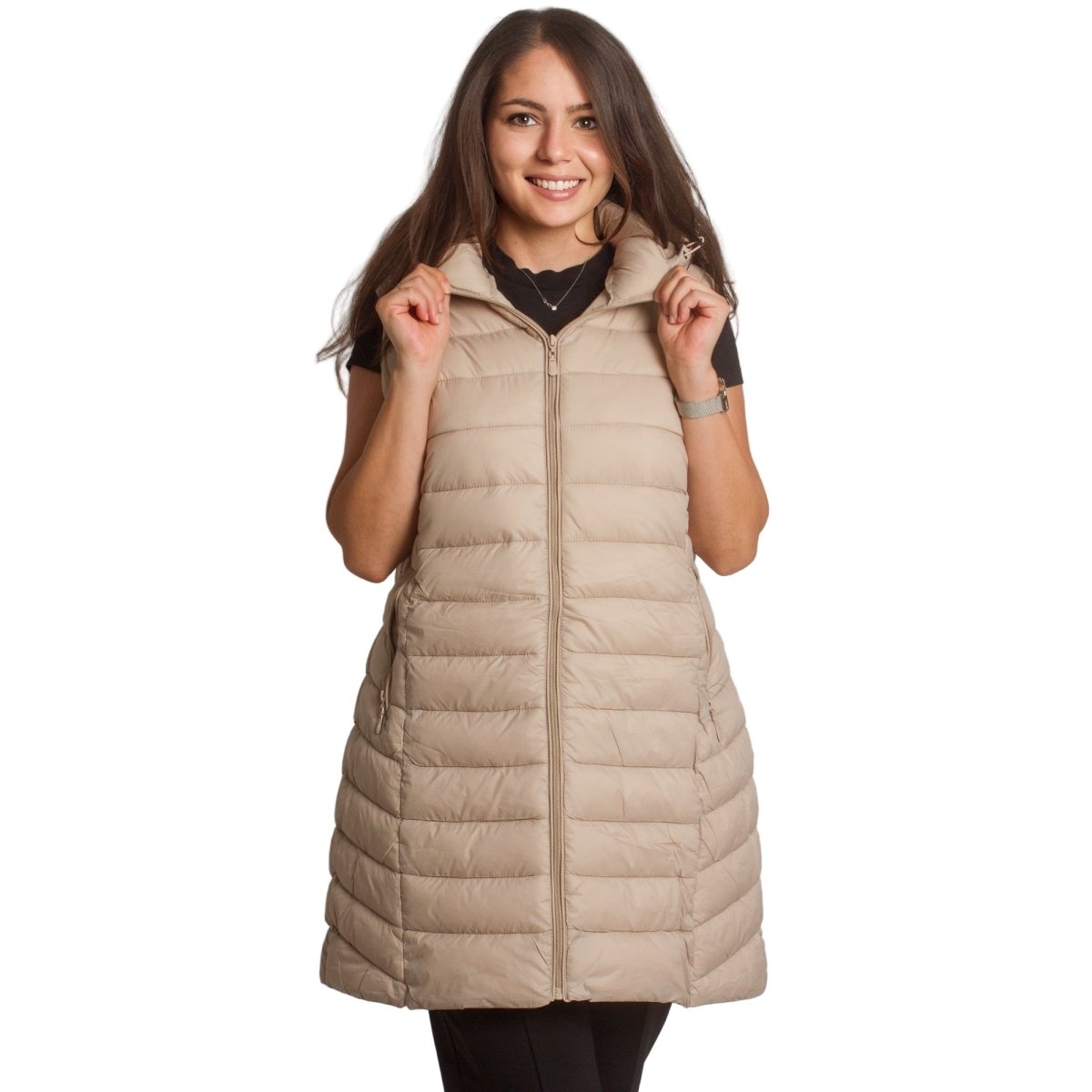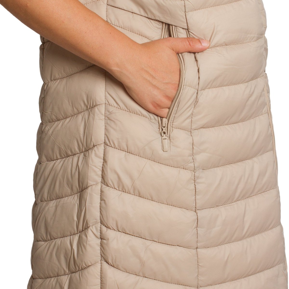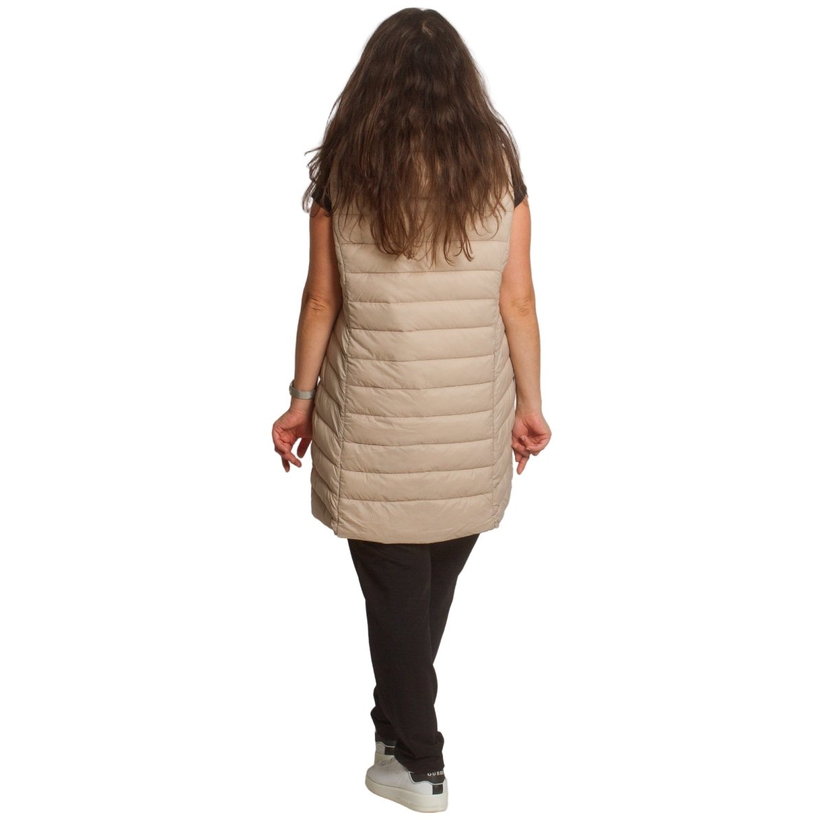 Стилен и практичен дълъг елек в бежов цвят, изработен от лека и удобна материя. Моделът е с права кройка, която подчертава силуета и осигурява свобода на движение. Елекът разполага с джобове с цип и висока яка, която предпазва от вятър. Закопчава се с дълъг цип по цялата дължина. Подходящ е както за ежедневни разходки, така и за по-елегантна визия през есенно-зимния сезон.