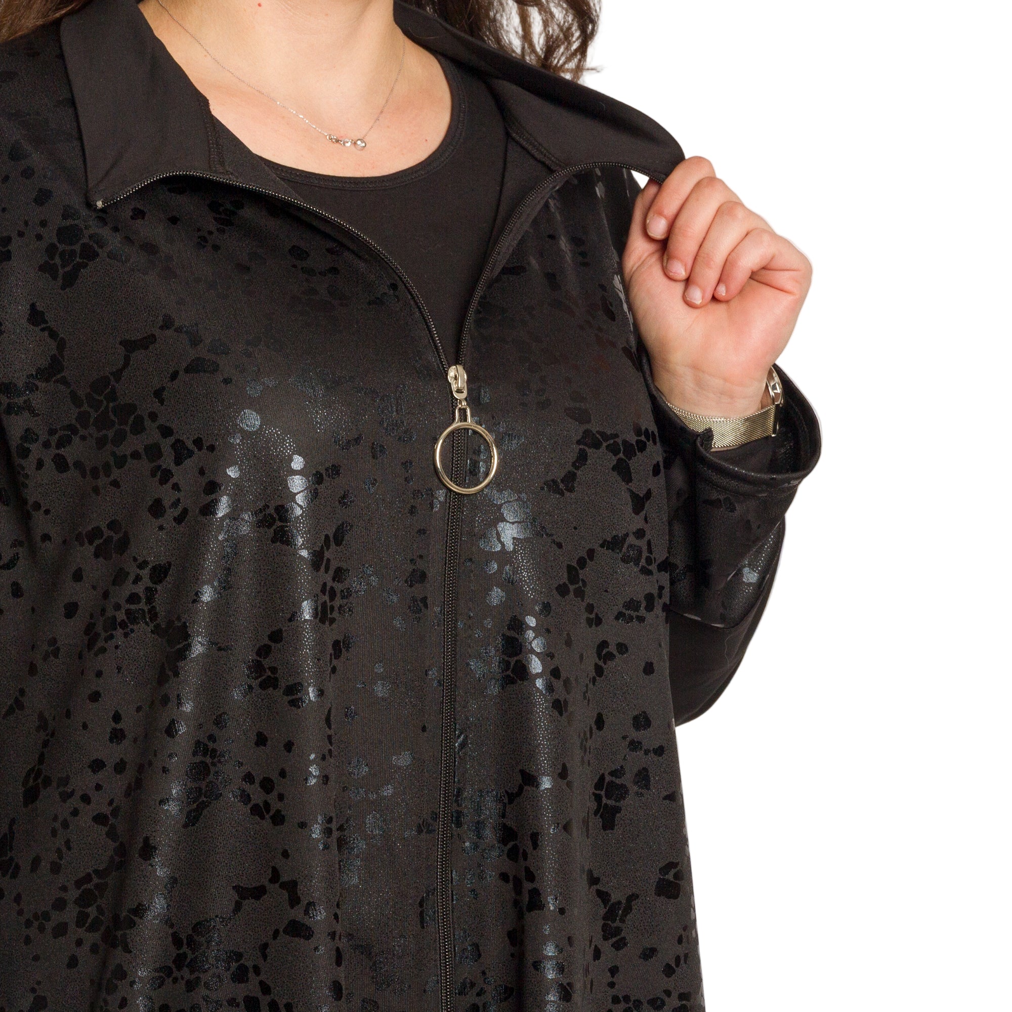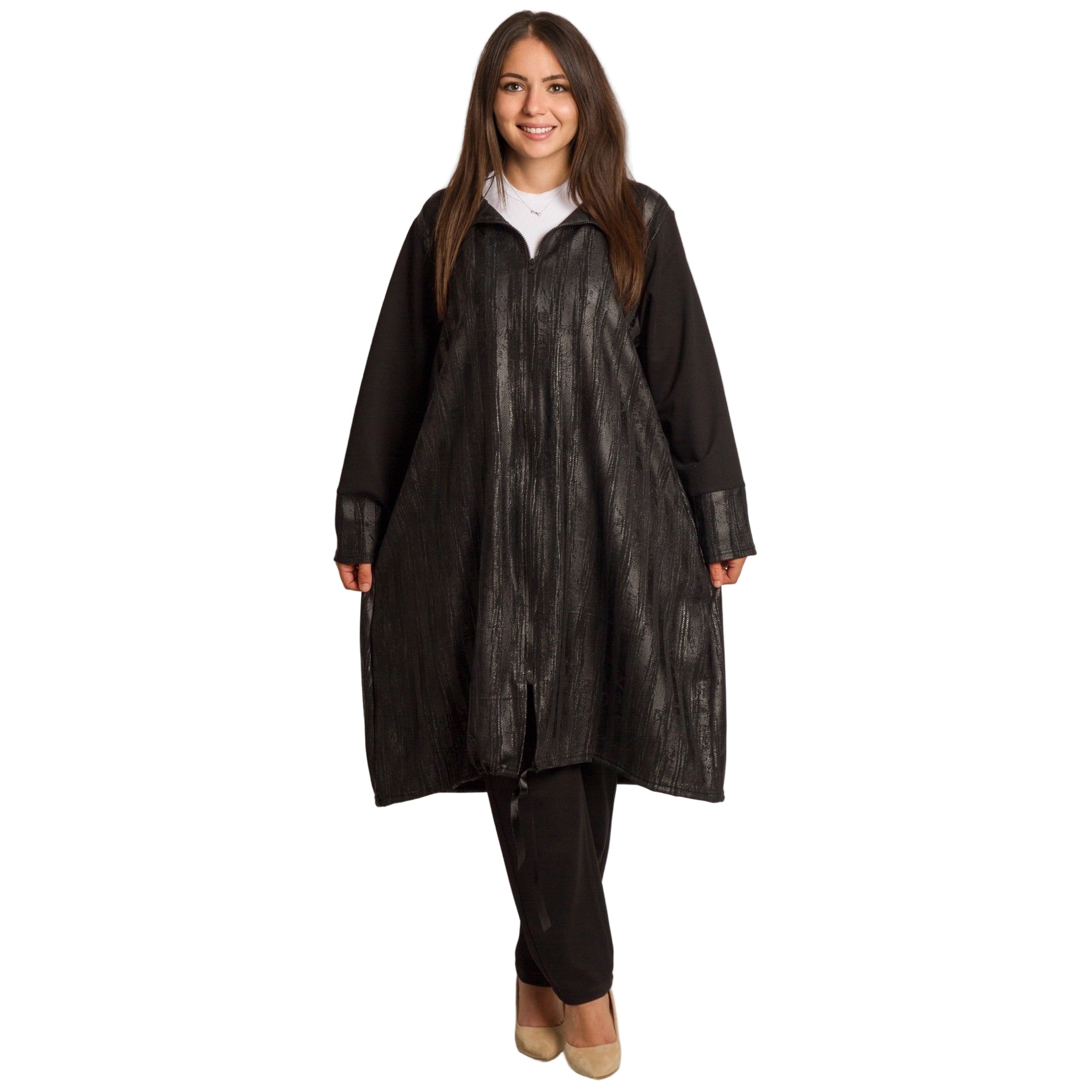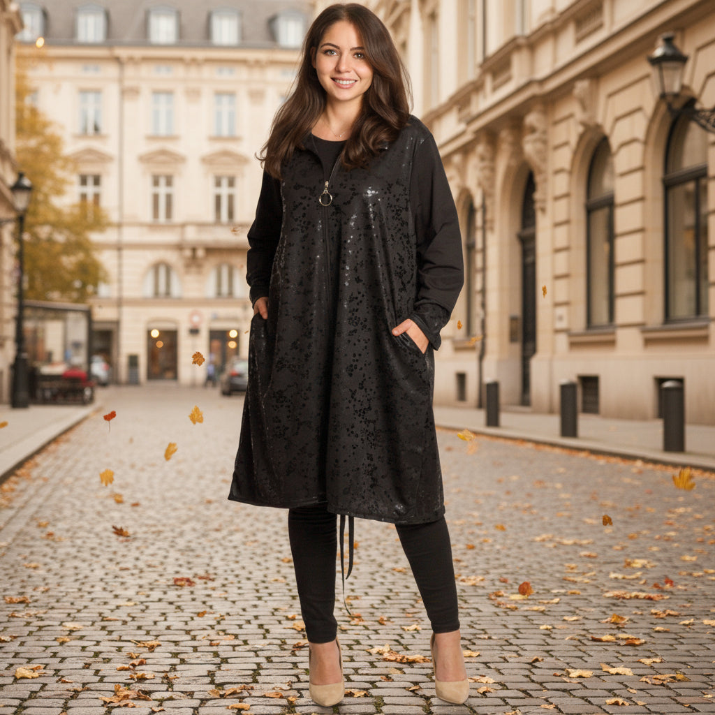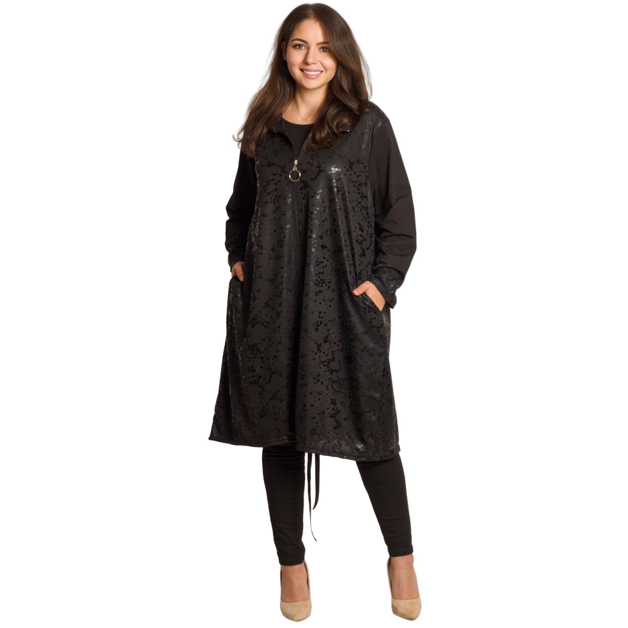 Стилно дълго яке в черен цвят, създадено специално за жени в големи размери. Изработено от комбинация от полиамид, полиестер и еластан, моделът предлага едновременно комфорт, топлина и елегантност. Свободната кройка и леко лъскавият десен придават модерен и изискан вид. Якето е с практичен цип и дължина, която осигурява допълнителна защита през хладните есенно-зимни дни. Подходящо е както за ежедневни излизания, така и за по-официални поводи.