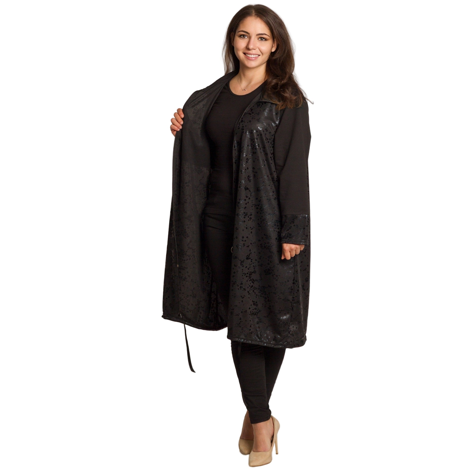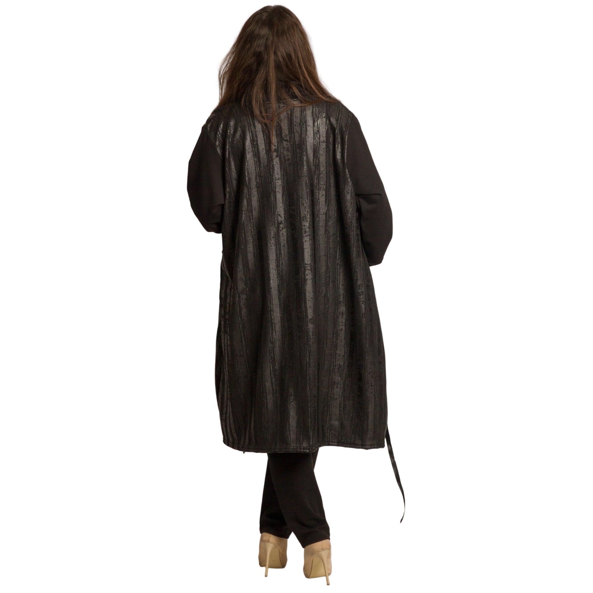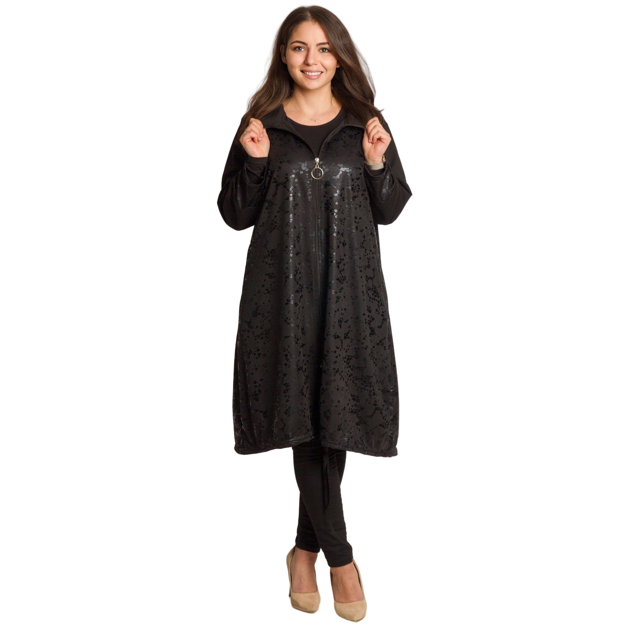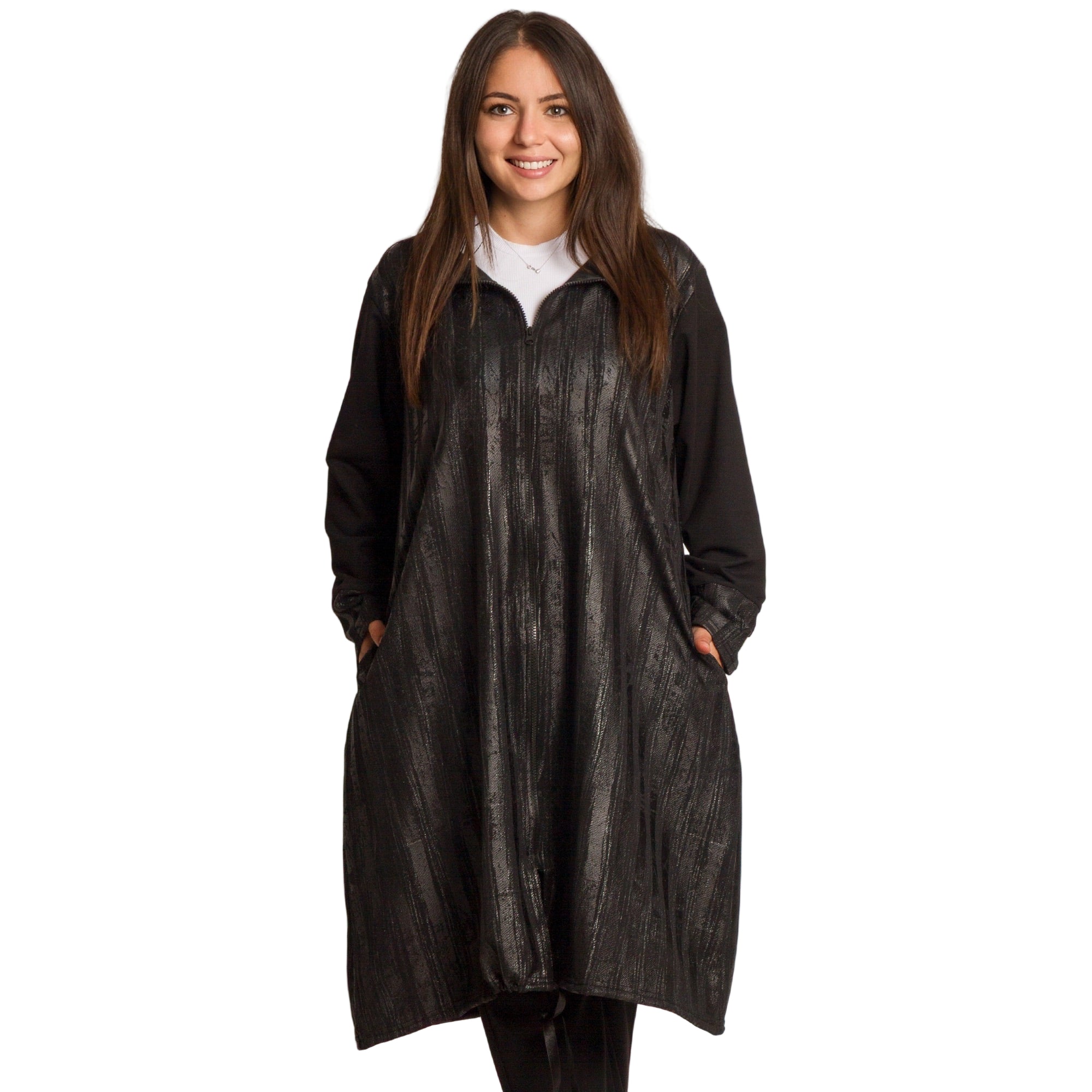 Стилно дълго яке в черен цвят, създадено специално за жени в големи размери. Изработено от комбинация от полиамид, полиестер и еластан, моделът предлага едновременно комфорт, топлина и елегантност. Свободната кройка и леко лъскавият десен придават модерен и изискан вид. Якето е с практичен цип и дължина, която осигурява допълнителна защита през хладните есенно-зимни дни. Подходящо е както за ежедневни излизания, така и за по-официални поводи.
