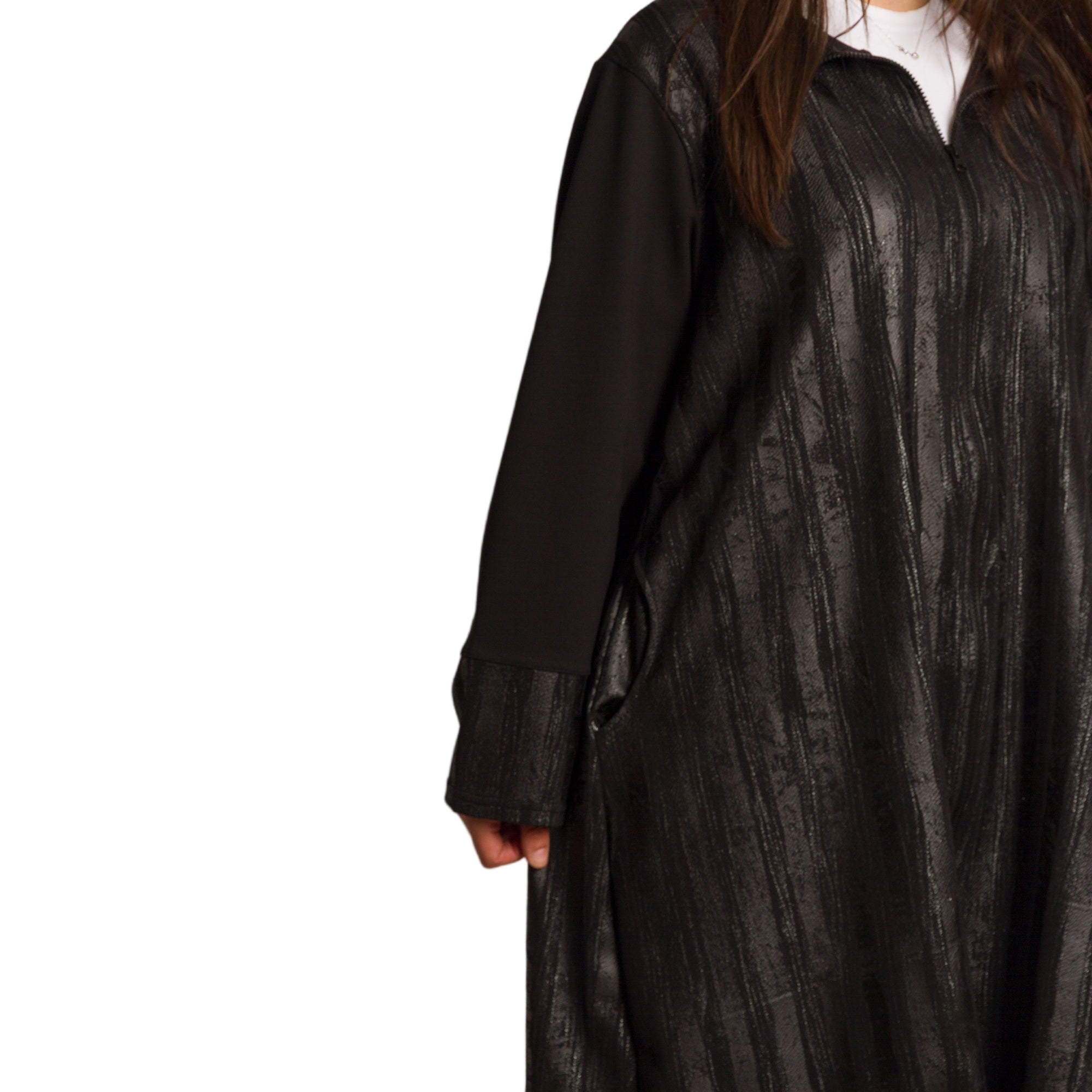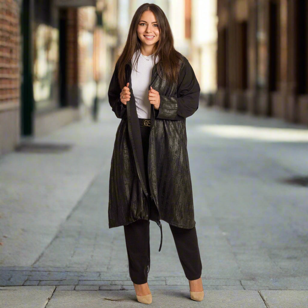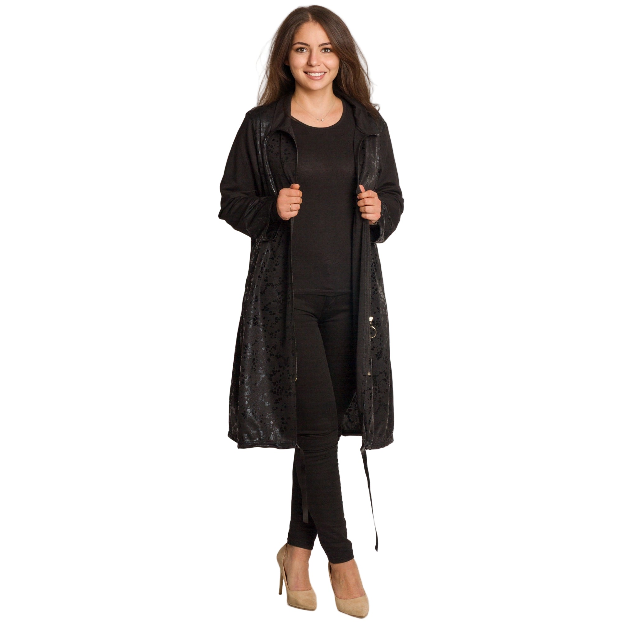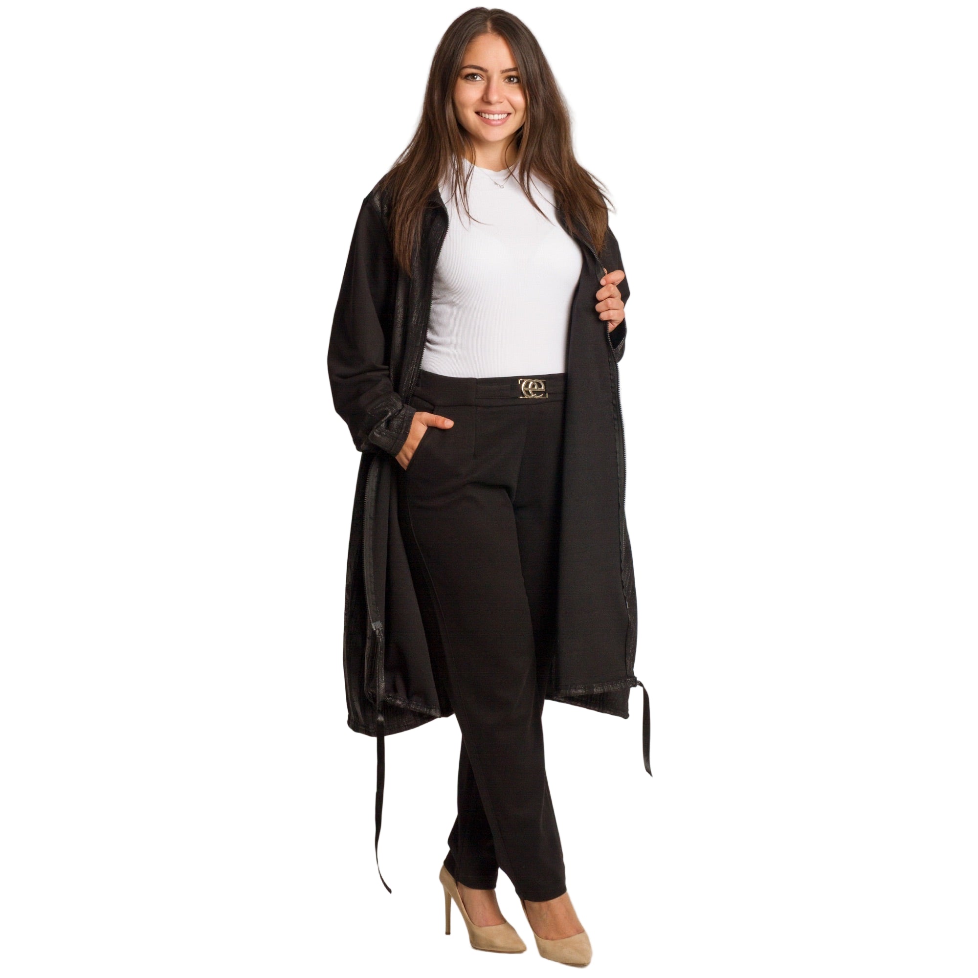 Стилно дълго яке в черен цвят, създадено специално за жени в големи размери. Изработено от комбинация от полиамид, полиестер и еластан, моделът предлага едновременно комфорт, топлина и елегантност. Свободната кройка и леко лъскавият десен придават модерен и изискан вид. Якето е с практичен цип и дължина, която осигурява допълнителна защита през хладните есенно-зимни дни. Подходящо е както за ежедневни излизания, така и за по-официални поводи.