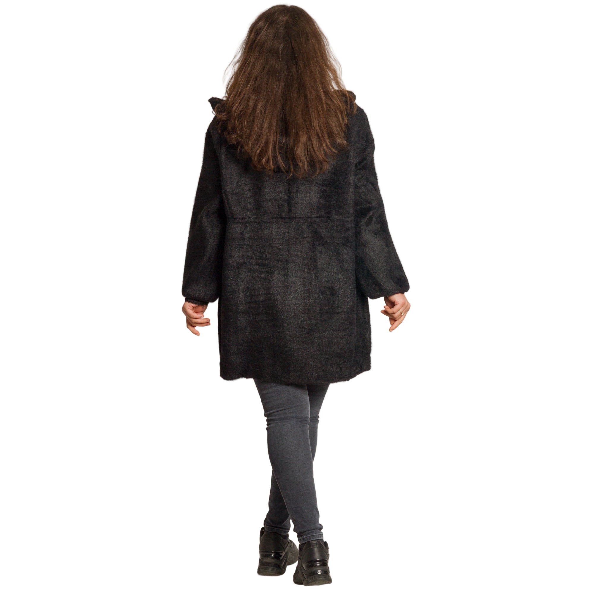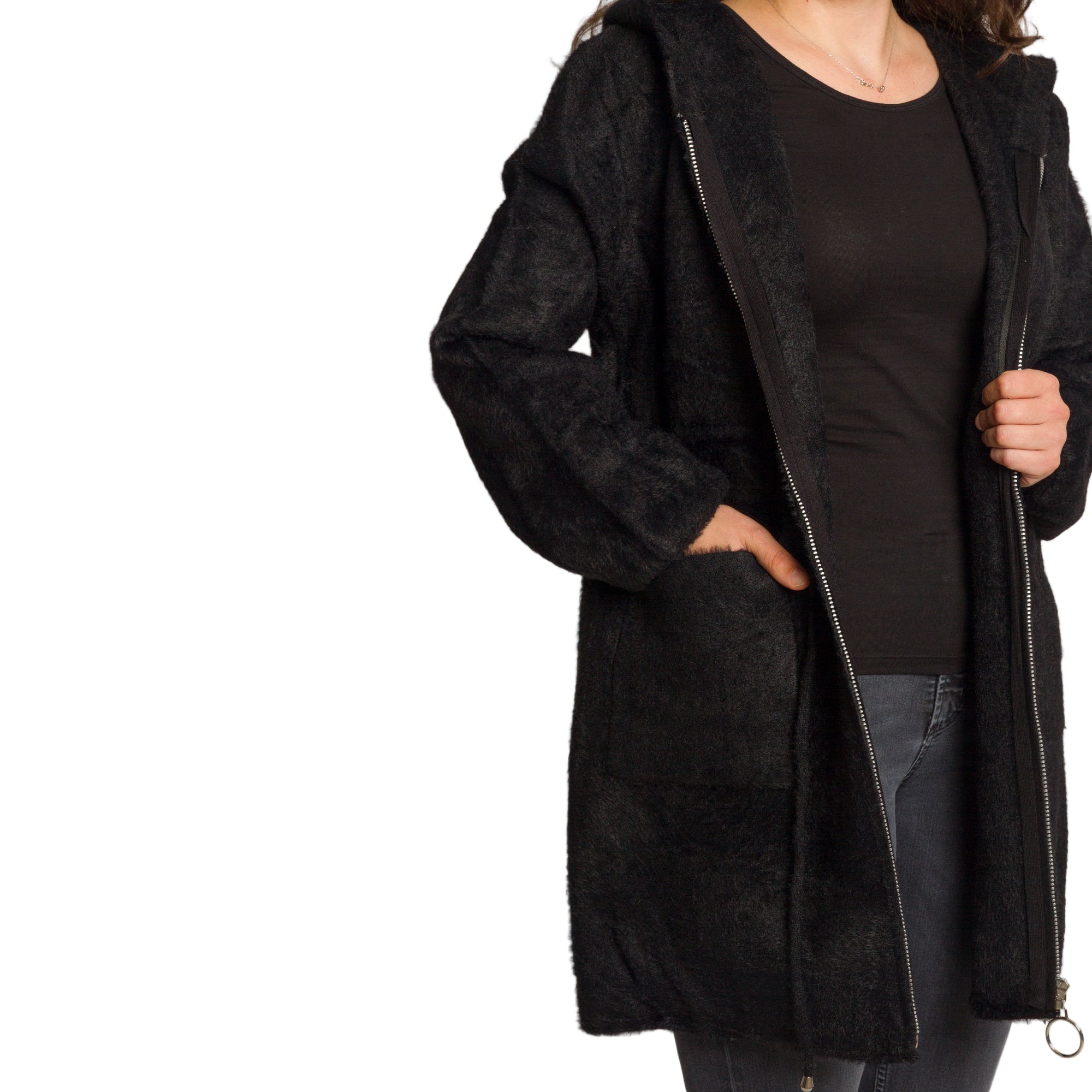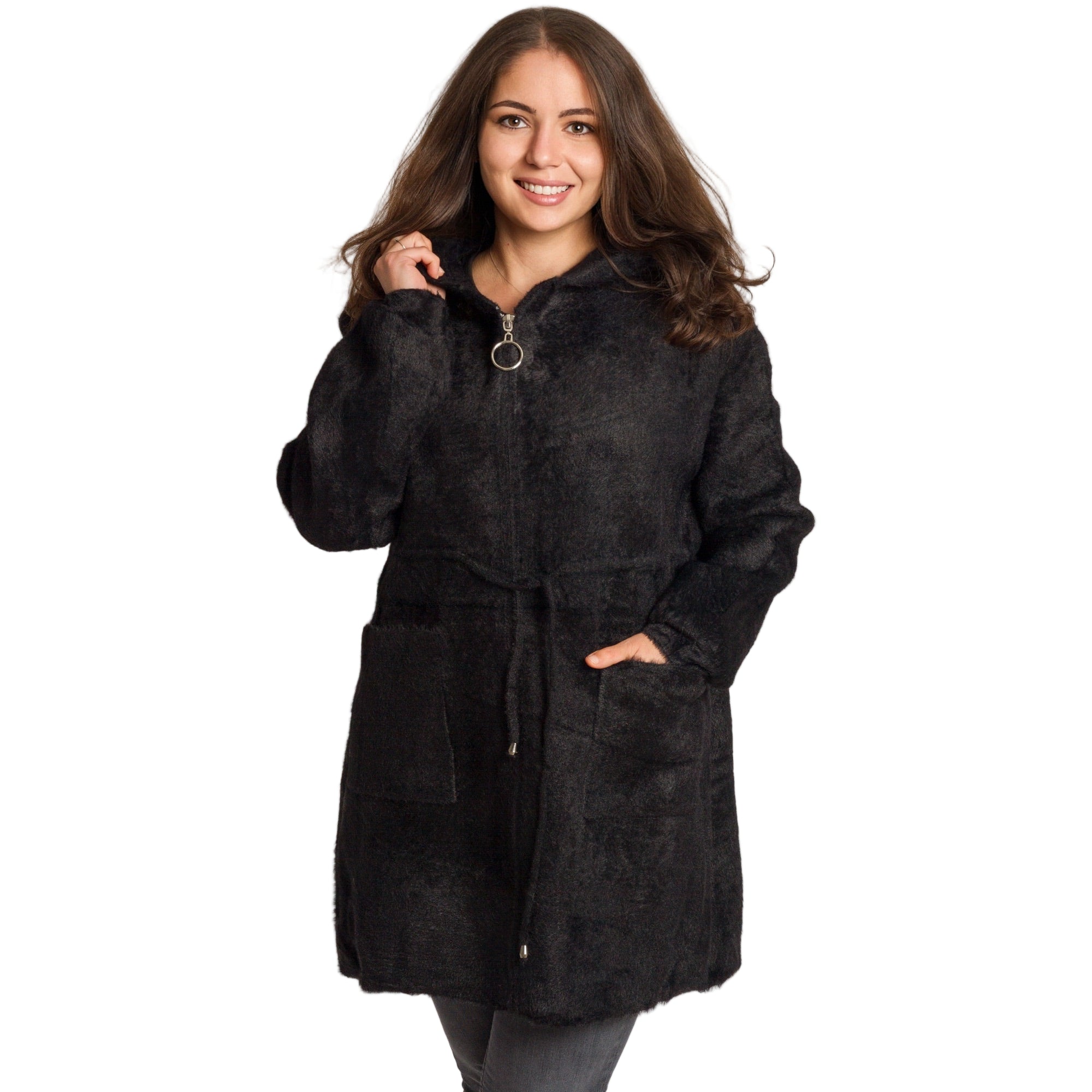 Универсално и стилно дамско яке в големи размери, създадено за комфорт и елегантна визия през студените дни. Изработено е от 50% вискоза, 25% памук и 25% полиамид, което осигурява мекота, еластичност и удобство при носене. Моделът е с права кройка и връзки на талията, които позволяват регулиране според предпочитанията. Разполага с практична качулка за защита в студено време и два големи предни джоба за удобство. Закопчаването е с цип, завършващ с декоративен метален ринг. Класическият черен цвят го прави лесен за съчетаване с всякакъв стил – от ежедневен до по-елегантен.