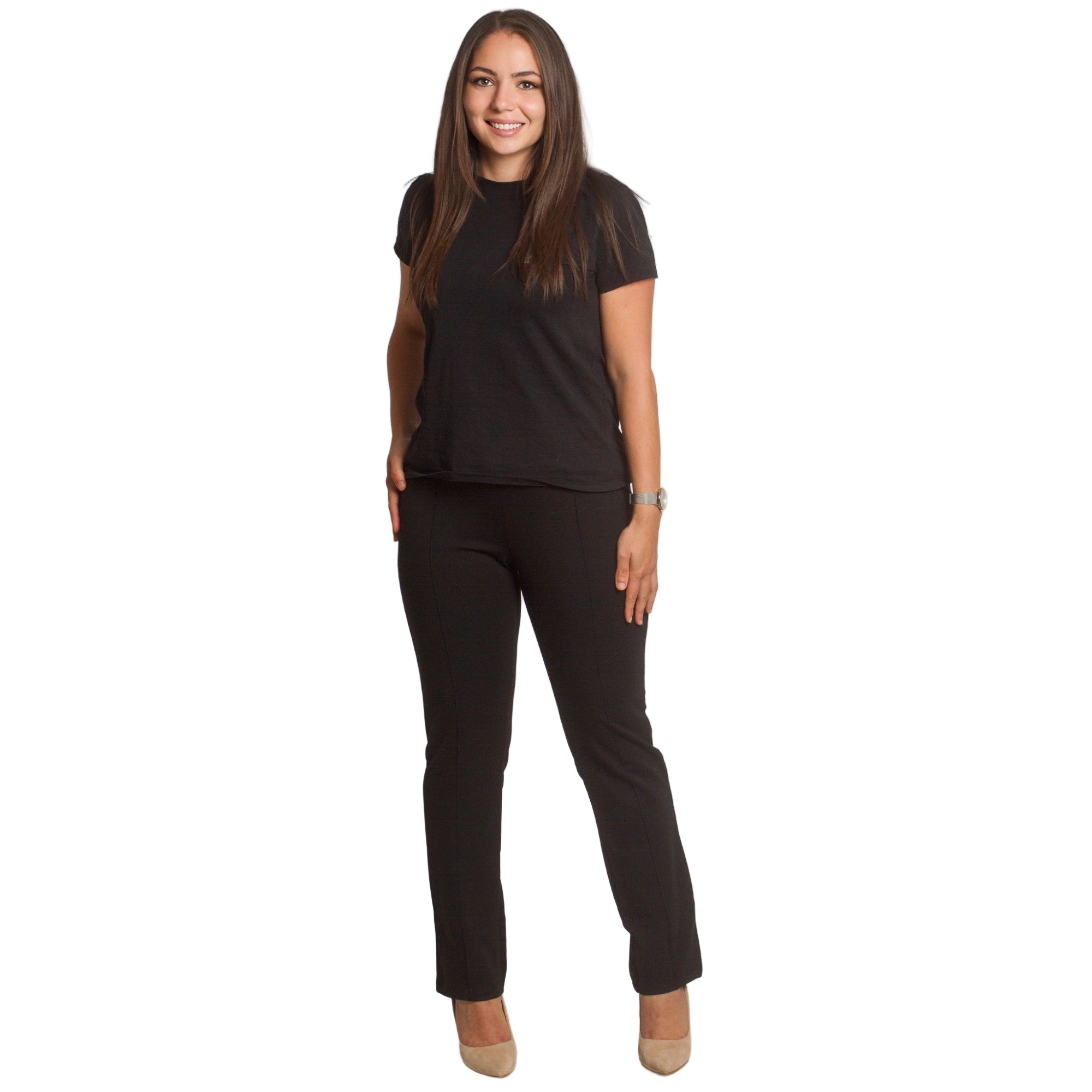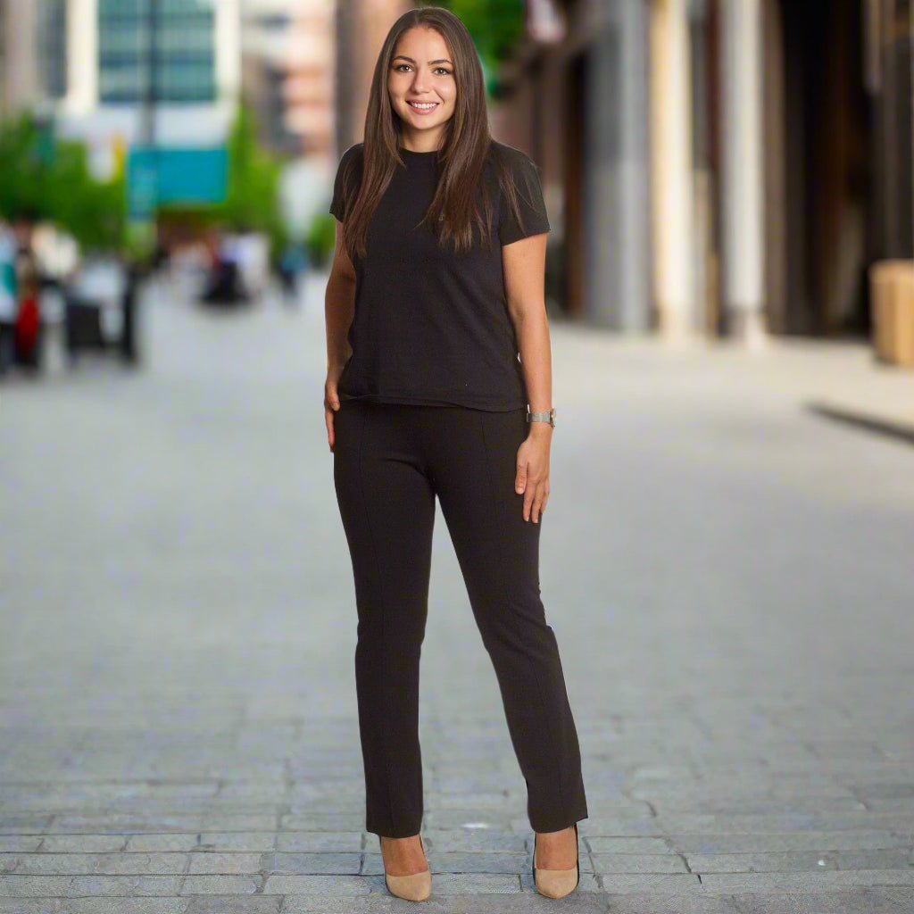Елегантен и удобен черен панталон, изработен от 100% полиестер. Моделът е с висока талия и еластичен ластик за максимален комфорт. Правата кройка подчертава силуета и осигурява изчистена визия, подходяща както за ежедневието, така и за по-официални поводи. Лесен за съчетаване с ризи, туники и сака.