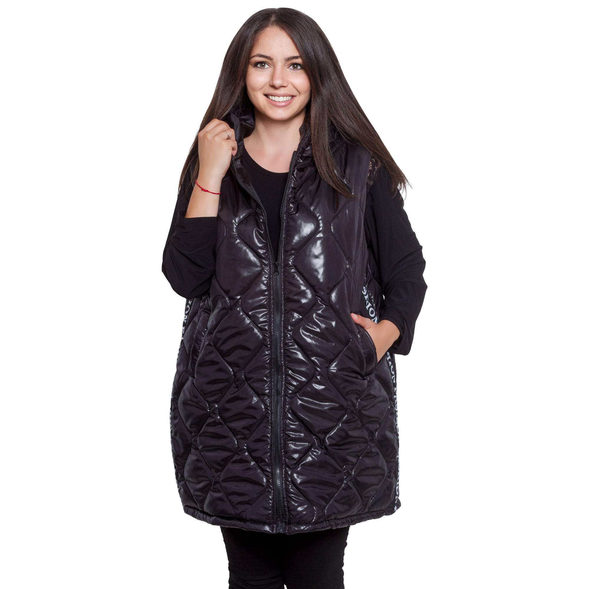 Стилен елек в черен цвят, създаден за модерната жена, която обича комфорта и елегантния ежедневен стил. Моделът е изработен от лек и издръжлив полиестер с лъскав ефект и ромбоиден капитонаж. Разполага с практични странични джобове и декоративна лента с надпис FASHION от двете страни. Закопчава се с цип по цялата дължина, а високата яка осигурява допълнителна топлина през студените дни. Подходящ за есенно-зимния сезон.