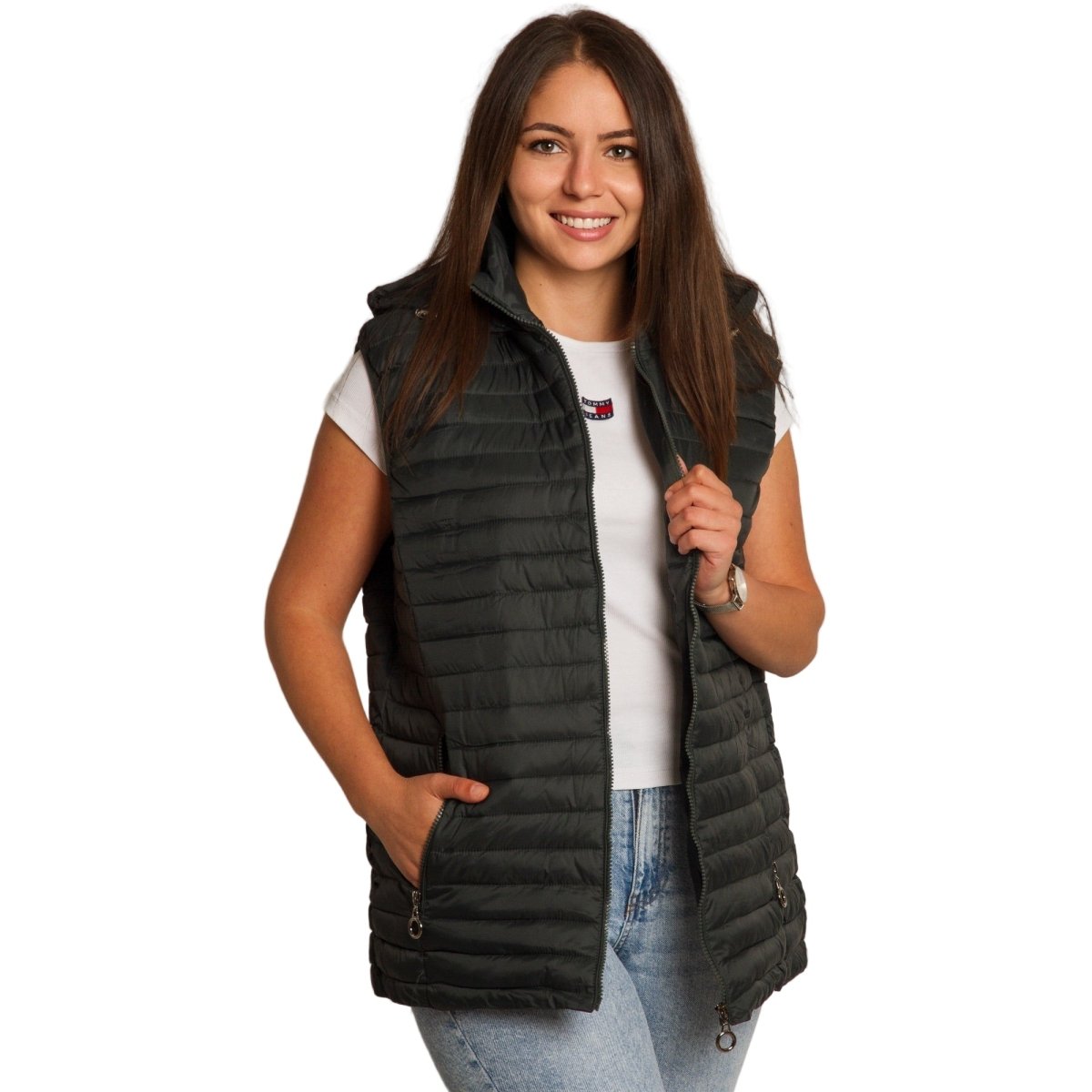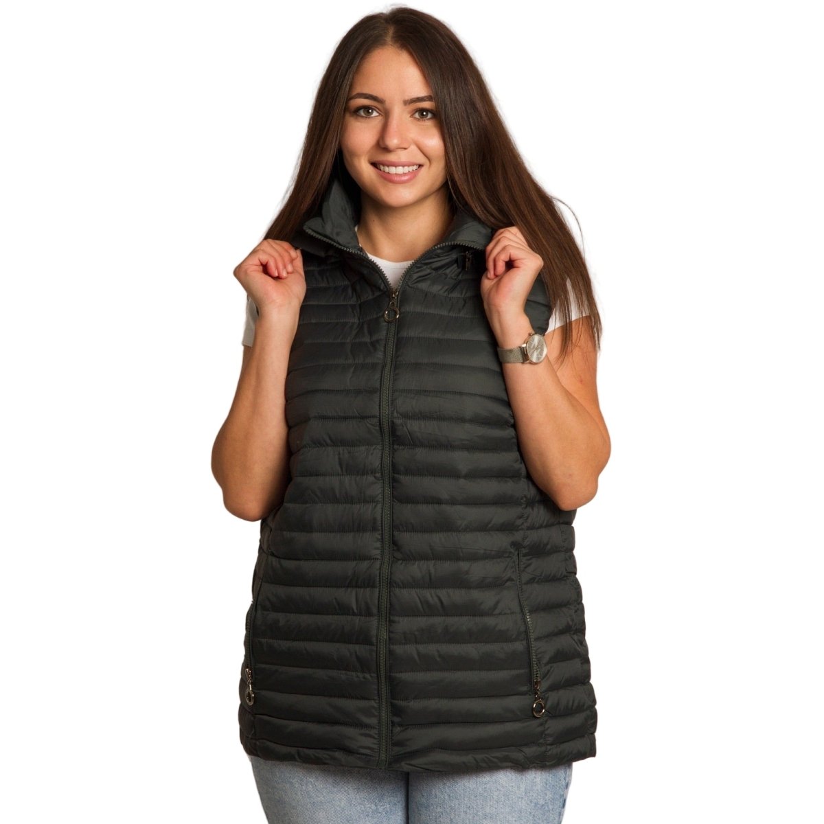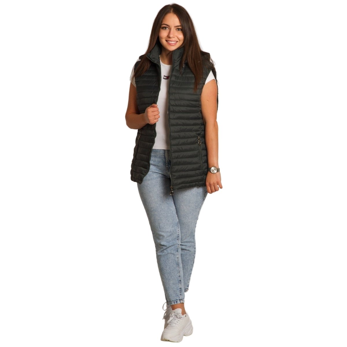 Удобен и стилен дамски елек в зелен цвят, подходящ за есенно-зимния сезон. Моделът е с права кройка, която гарантира комфорт и свобода на движенията. Изработен е от 100% полиестер, което го прави лек, практичен и лесен за поддръжка. Закопчава се с цип по цялата дължина, а страничните джобове също са снабдени с ципове за повече сигурност и удобство. Благодарение на изчистения си дизайн, елекът може да се носи както в ежедневието, така и при по-елегантни визии.