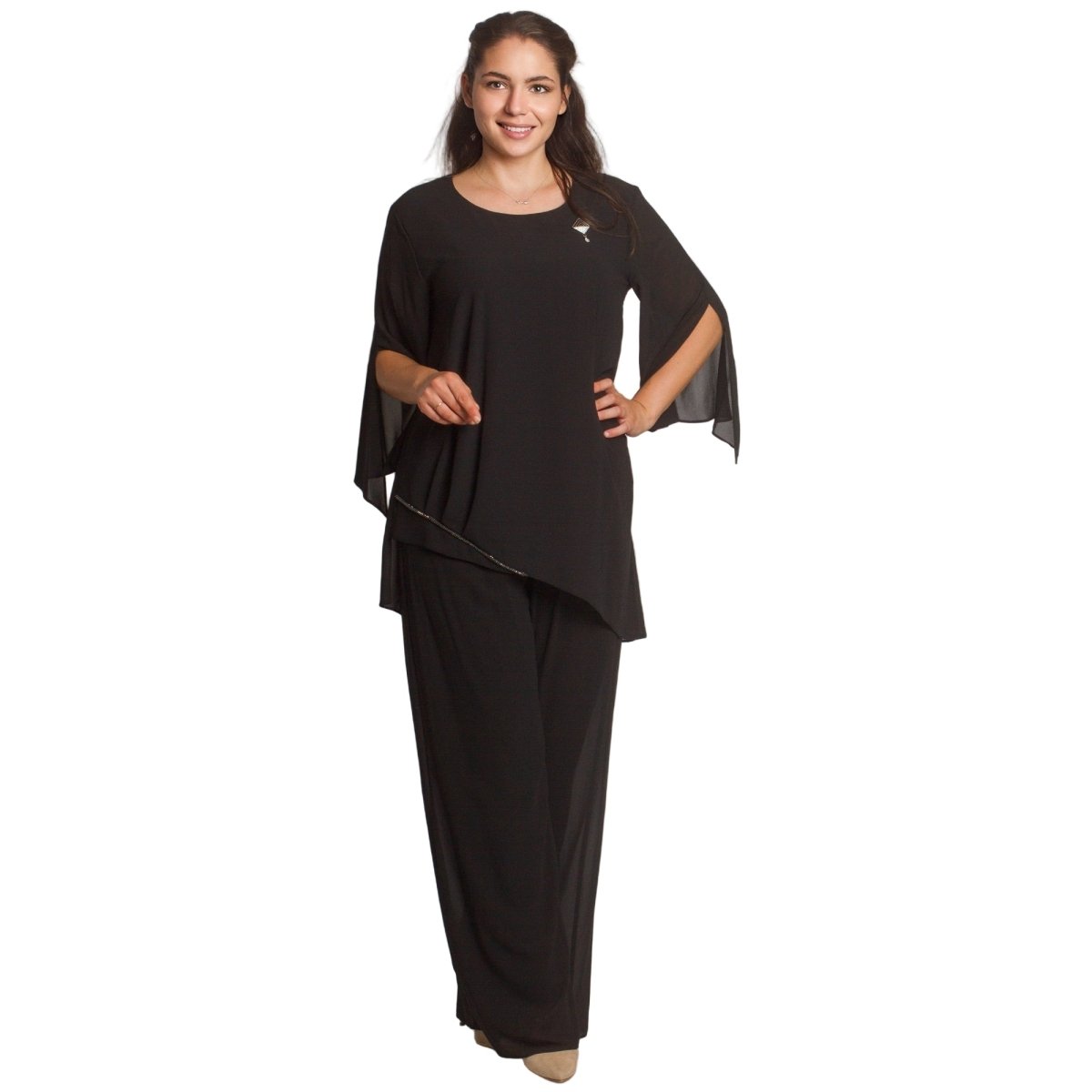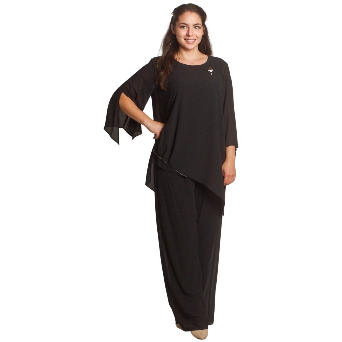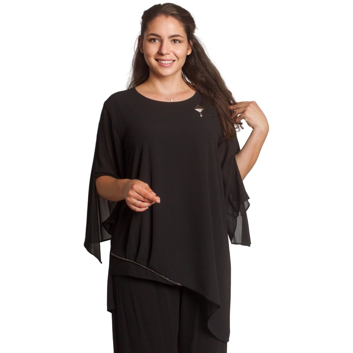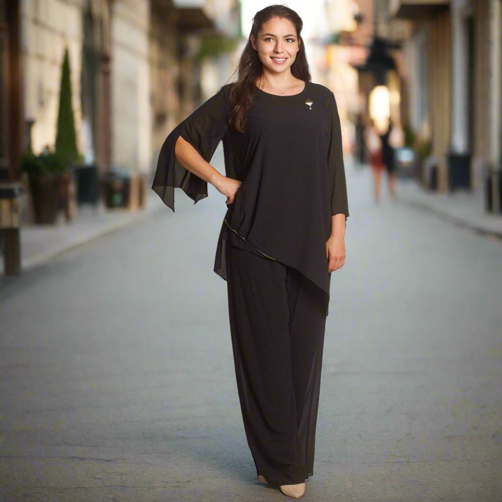 Елегантен дамски костюм от две части, състоящ се от свободна туника с асиметричен подгъв и панталон с дължина до глезена. Изработен е от висококачествена комбинация от вискоза и полиестер, която осигурява комфорт и лекота при носене. Черният цвят и изчистената линия го правят идеален избор за официални поводи и специални събития. Туниката е с ефирни ръкави и обло деколте, което добавя фин завършек към изискания силует.