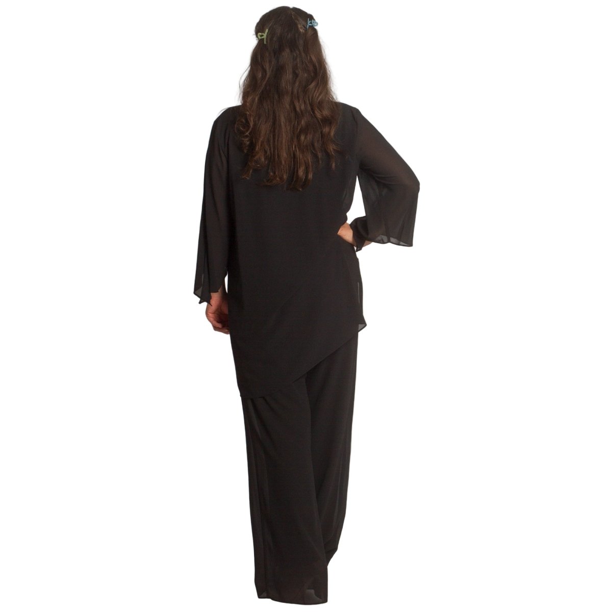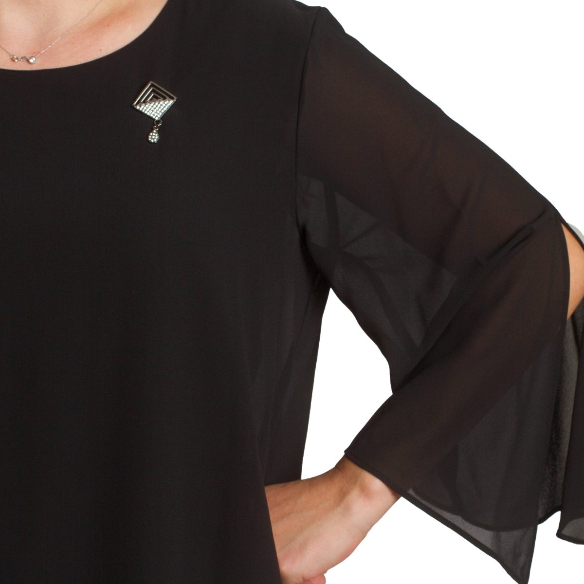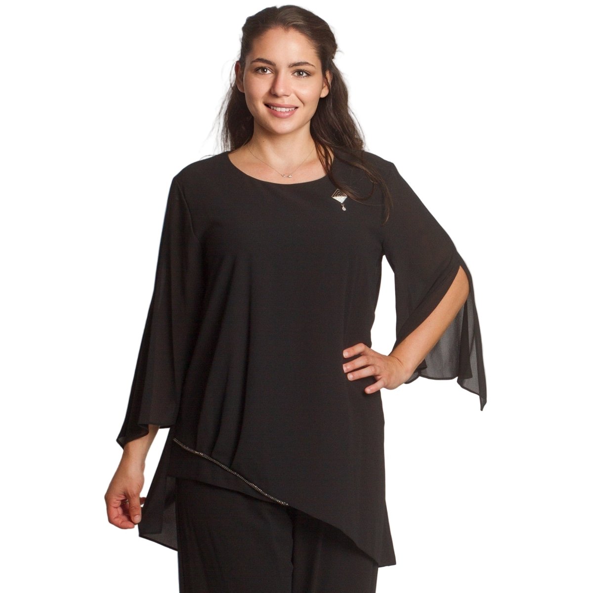 Елегантен дамски костюм от две части, състоящ се от свободна туника с асиметричен подгъв и панталон с дължина до глезена. Изработен е от висококачествена комбинация от вискоза и полиестер, която осигурява комфорт и лекота при носене. Черният цвят и изчистената линия го правят идеален избор за официални поводи и специални събития. Туниката е с ефирни ръкави и обло деколте, което добавя фин завършек към изискания силует.