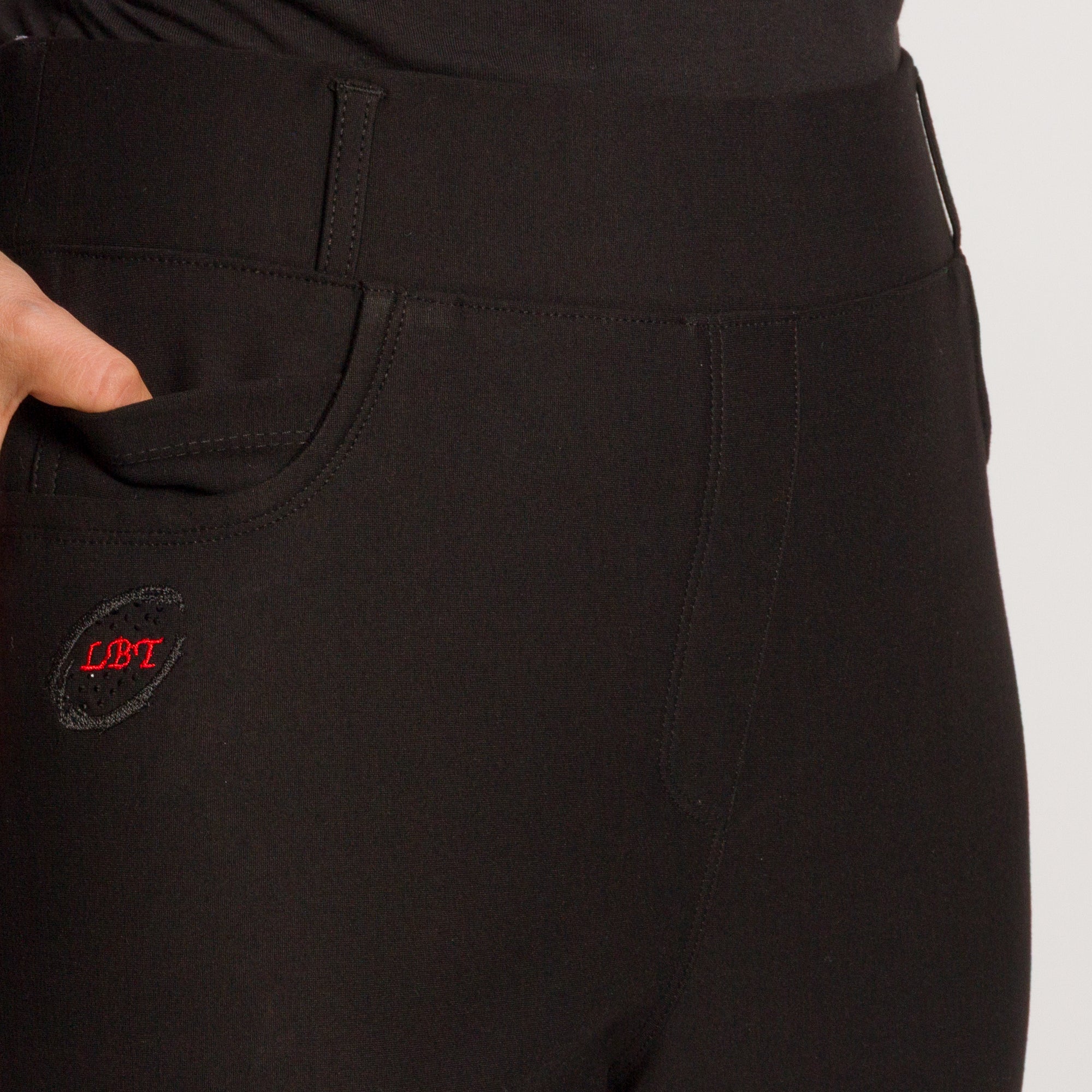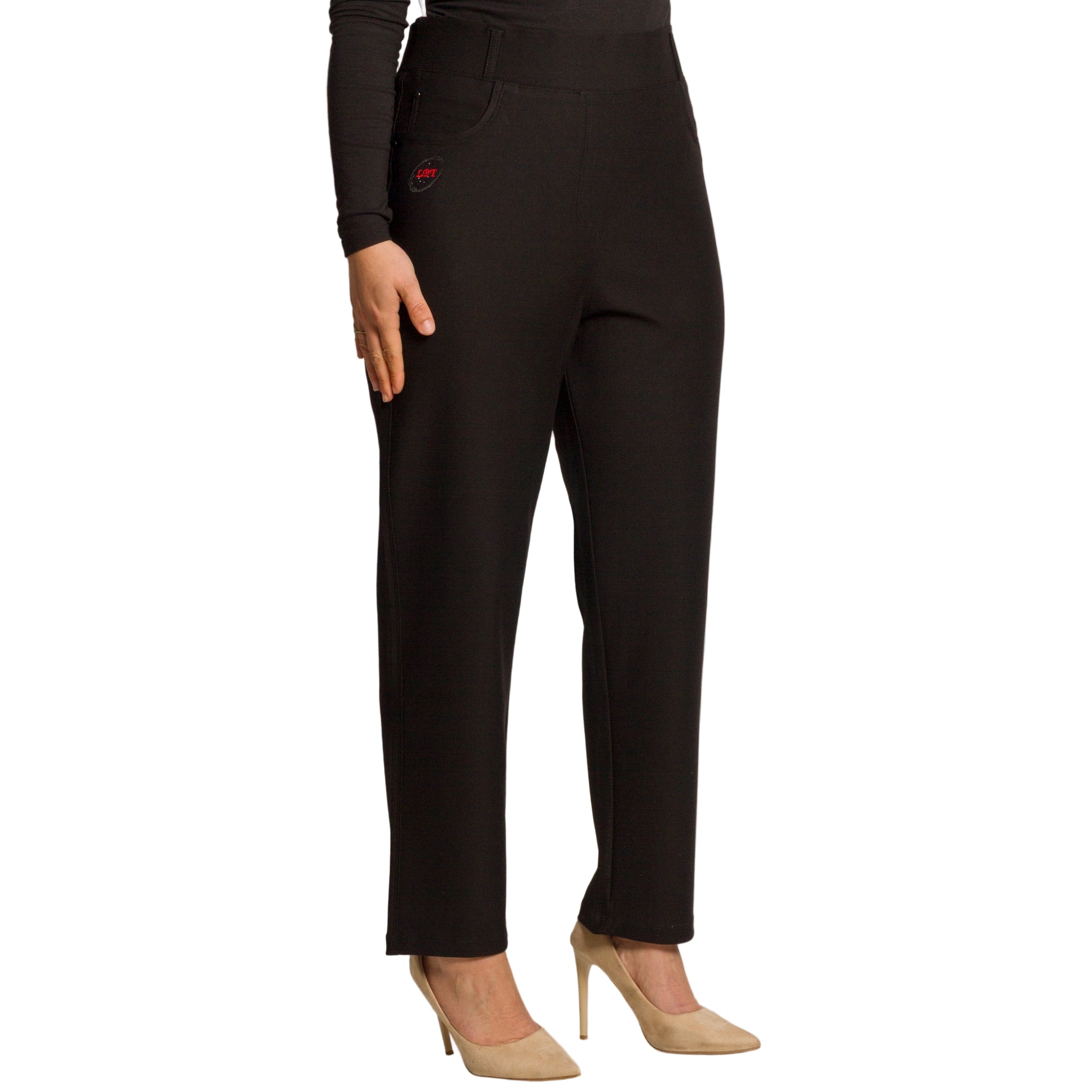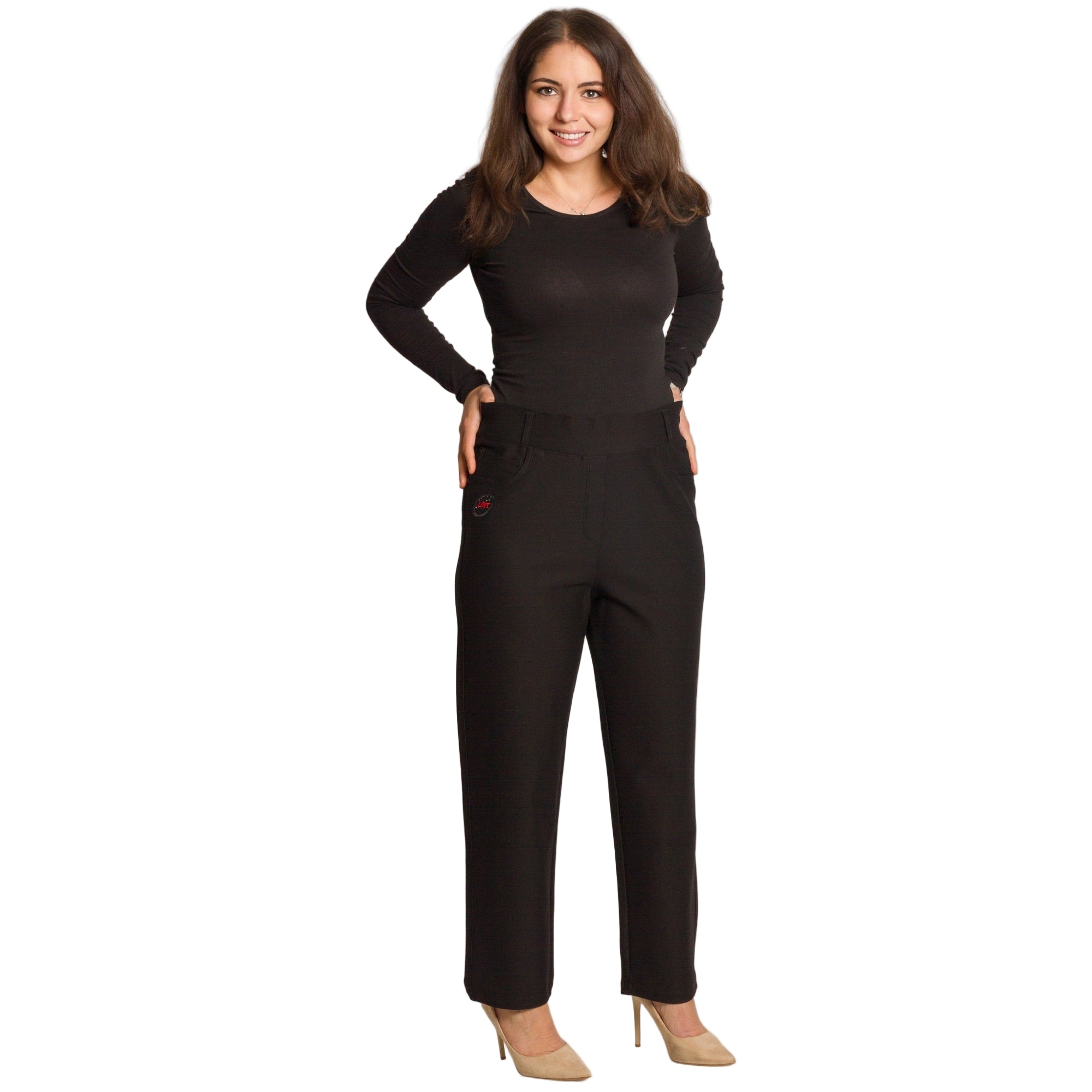 Елегантен черен панталон в големи размери, подходящ както за ежедневието, така и за официални поводи. Изработен е от мека и еластична вискозна материя, която осигурява комфорт и свобода на движение през целия ден. Високата талия и правата кройка подчертават силуета, а еластичният колан заменя нуждата от копчета и ципове, като гарантира удобно прилягане. Има практични джобове отпред и дискретен декоративен надпис LBT (Liberty).