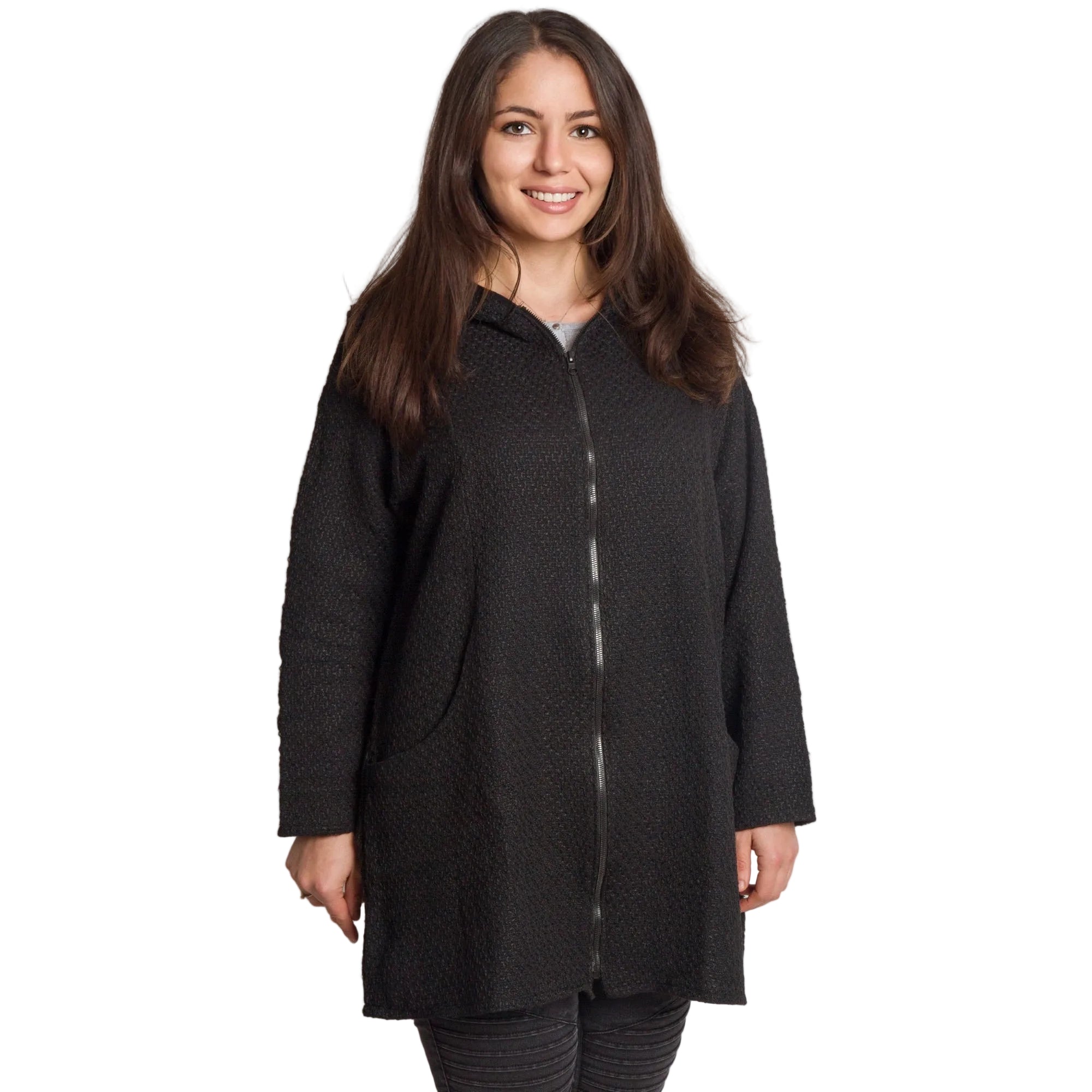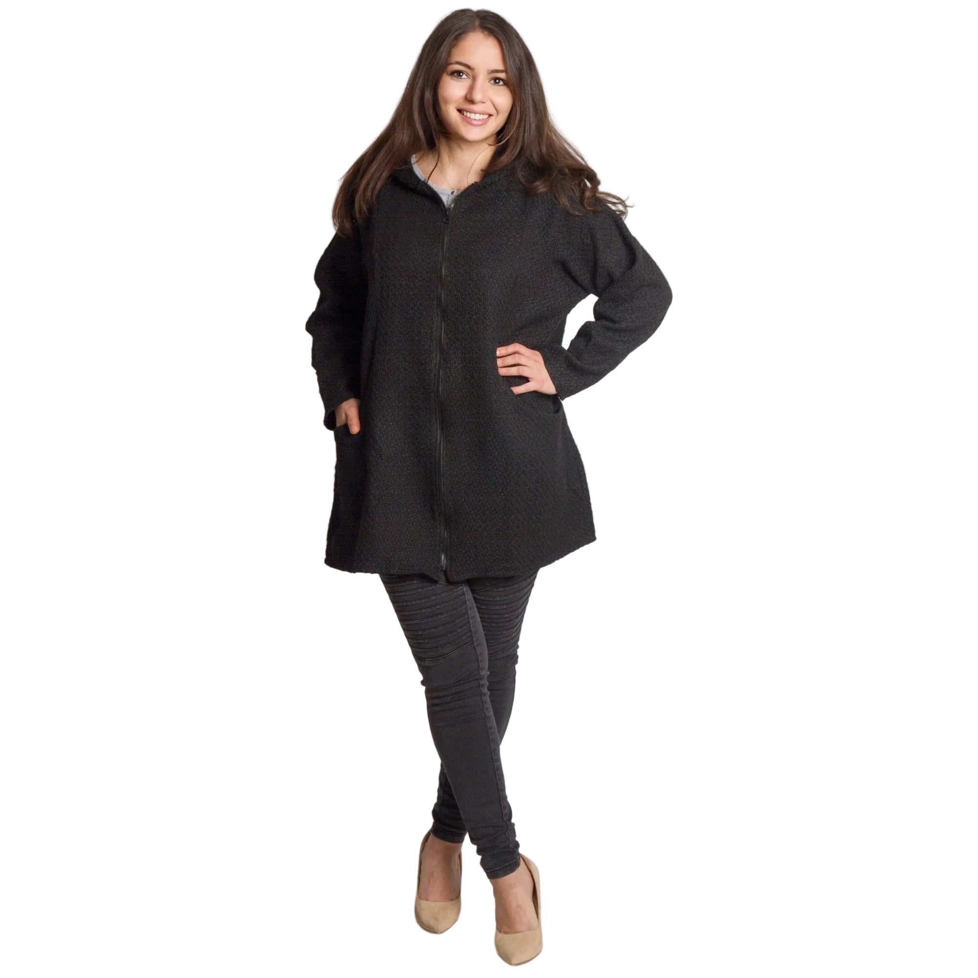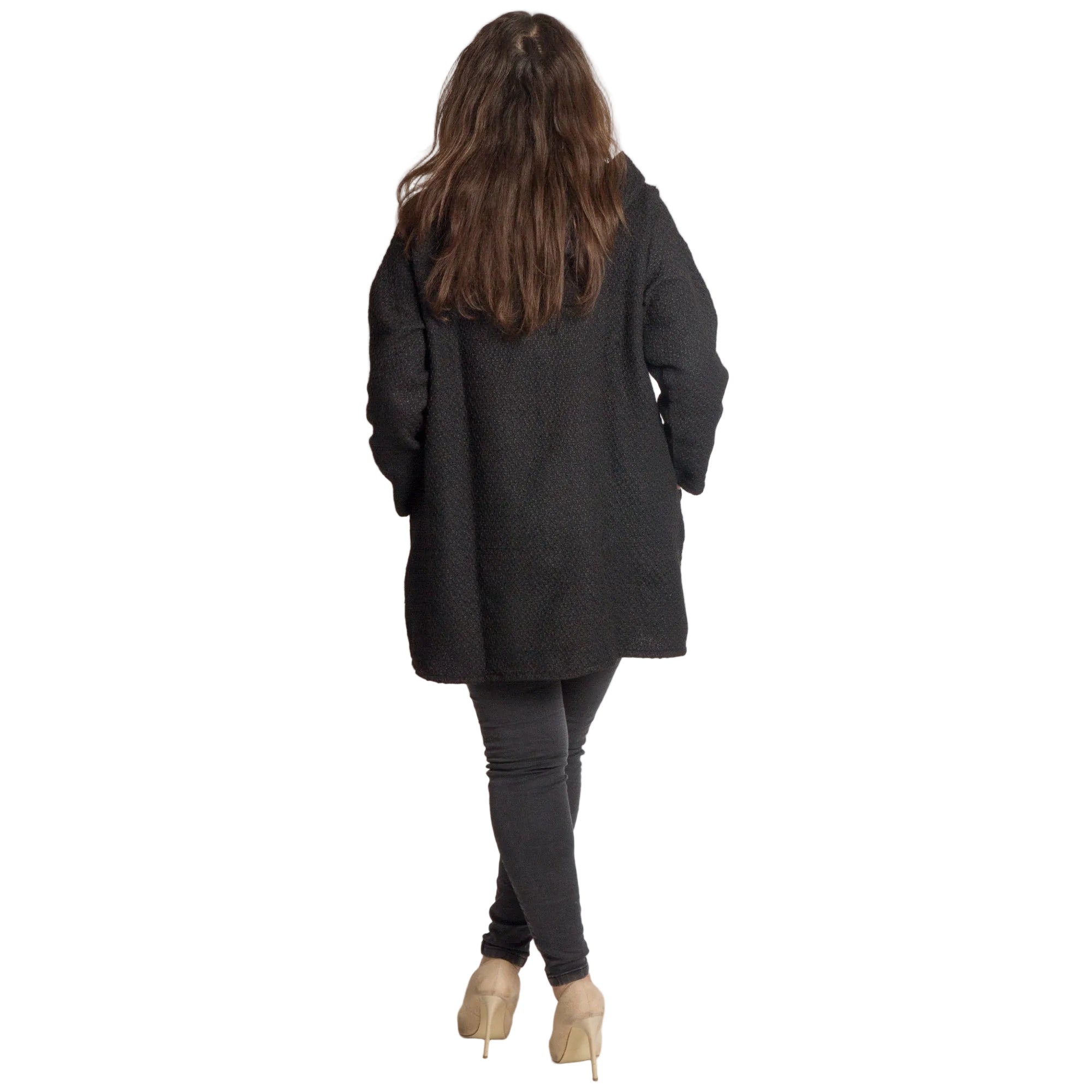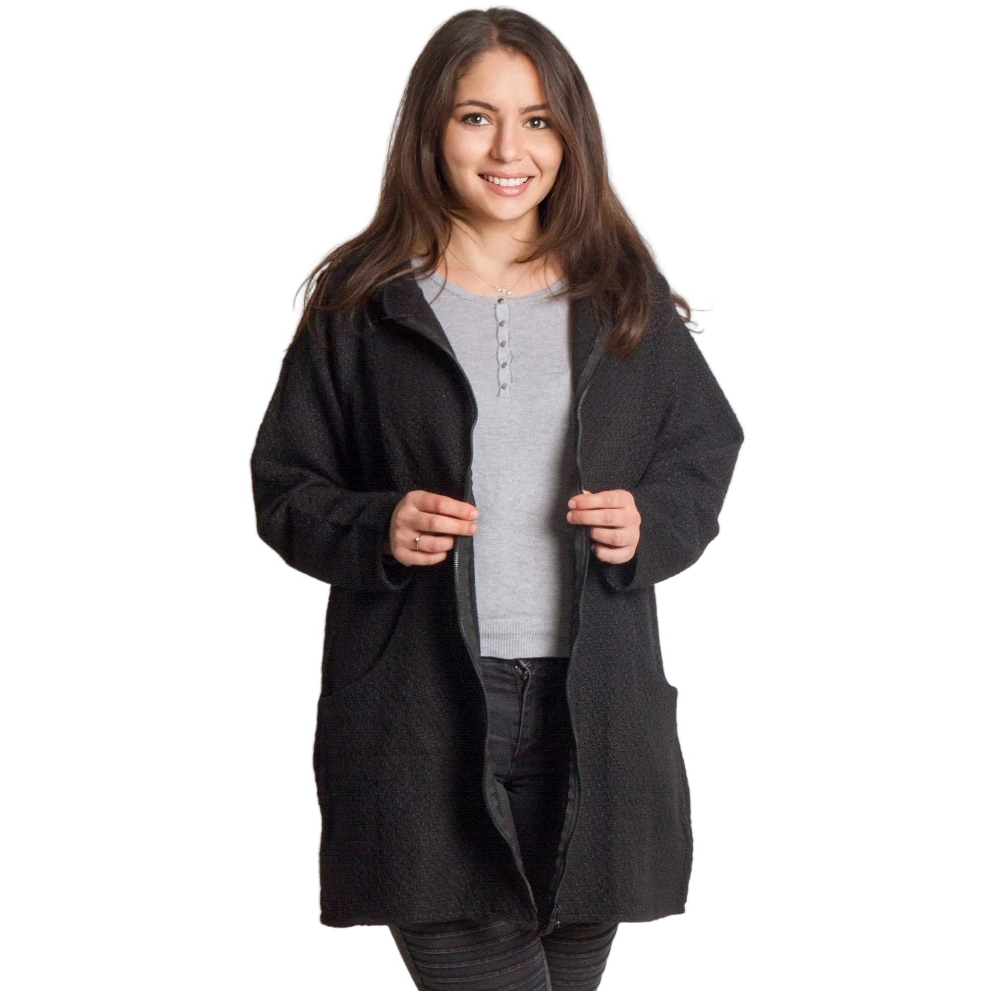 Елегантен жакет в черен цвят, подходящ за ежедневието и официални поводи. Изработен е от мека и топла материя с текстурирана повърхност, съчетаваща 50% памук и 50% акрил, което осигурява комфорт и издръжливост през студените дни.