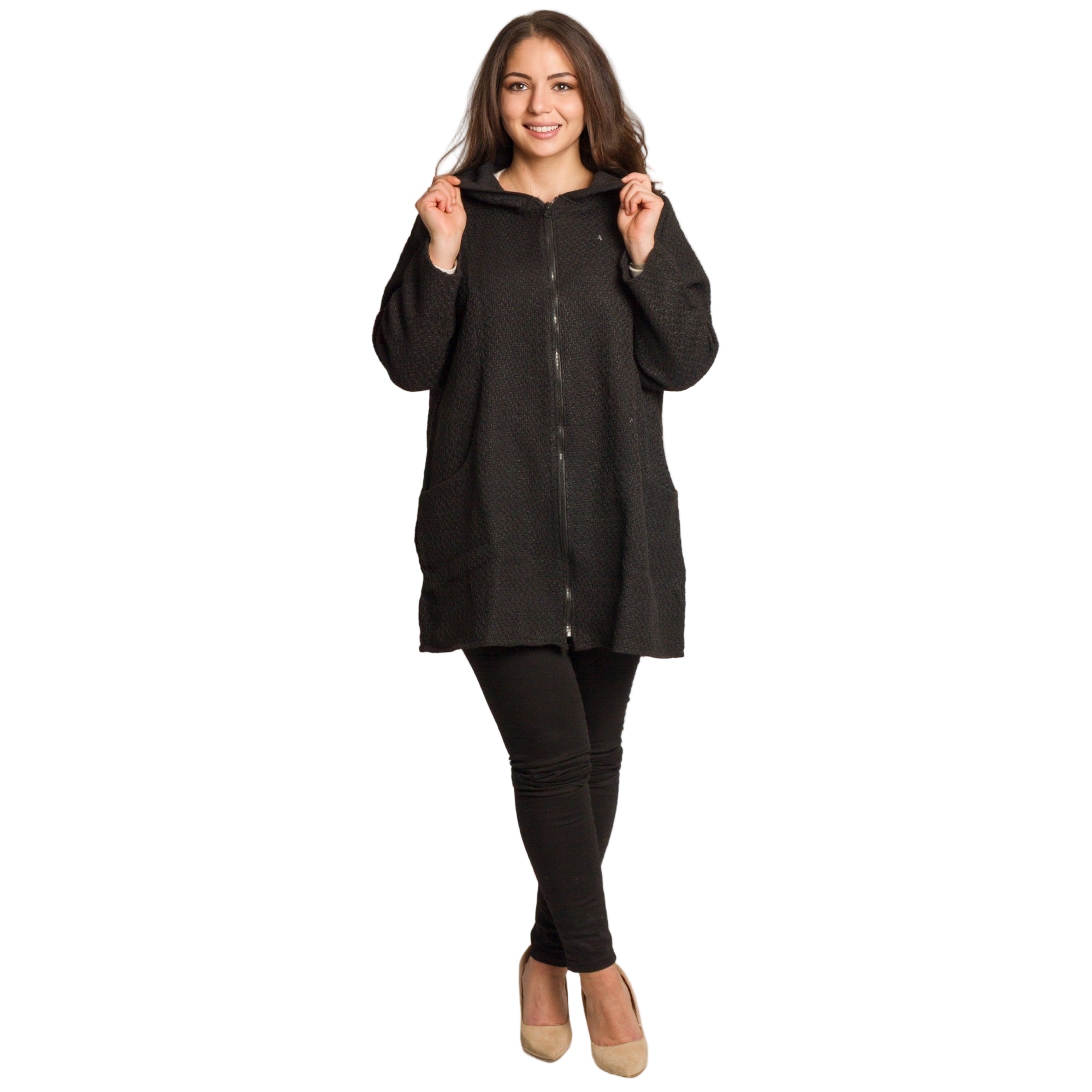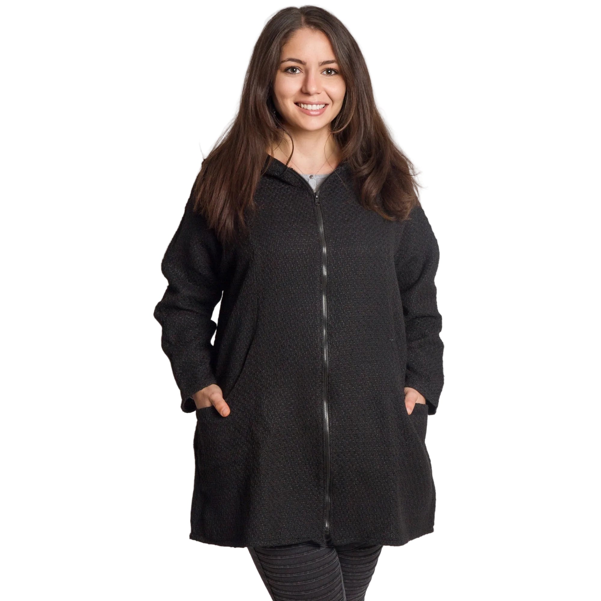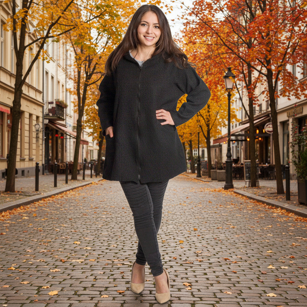 Елегантен жакет в черен цвят, подходящ за ежедневието и официални поводи. Изработен е от мека и топла материя с текстурирана повърхност, съчетаваща 50% памук и 50% акрил, което осигурява комфорт и издръжливост през студените дни.