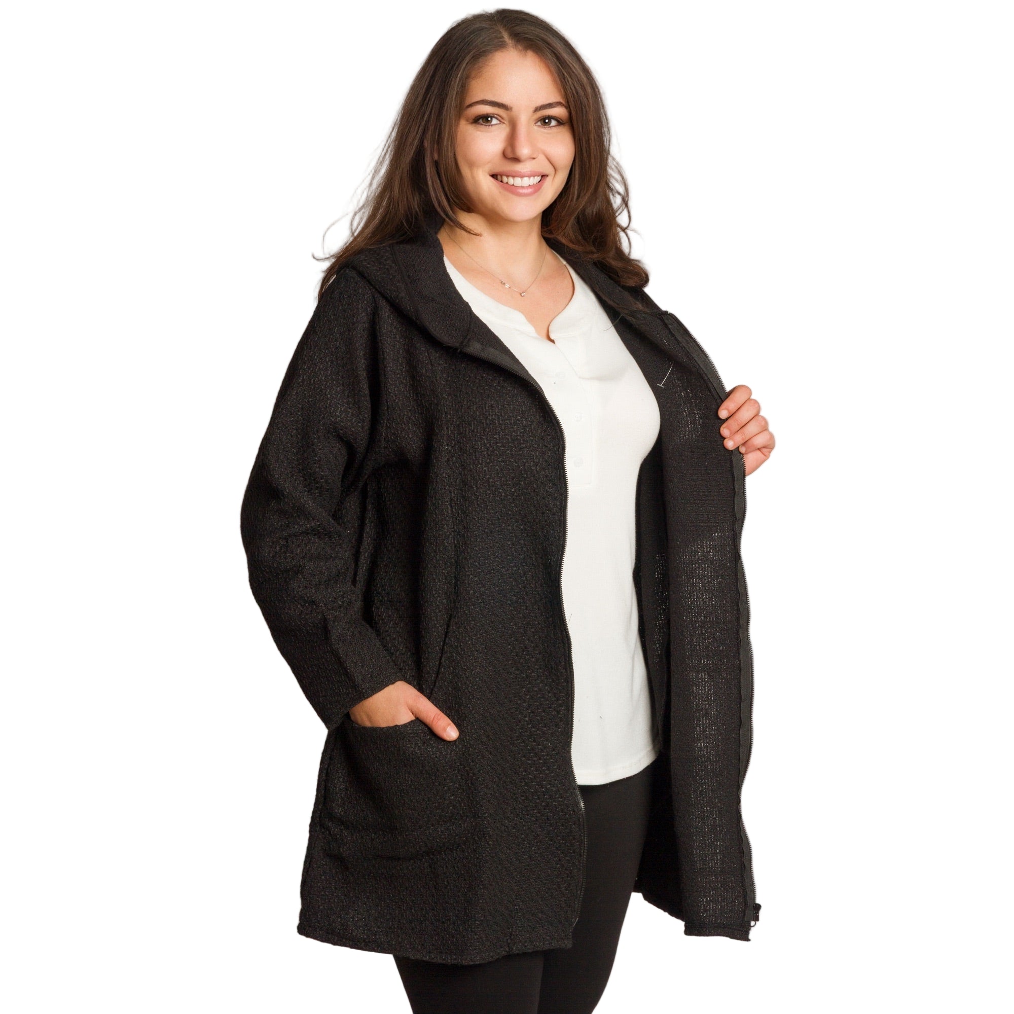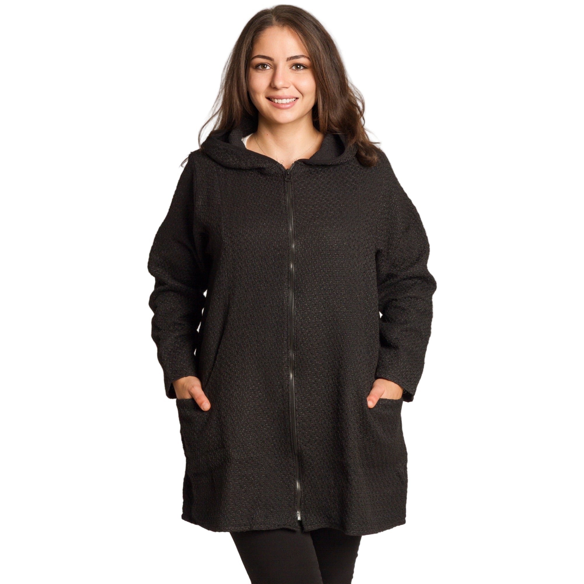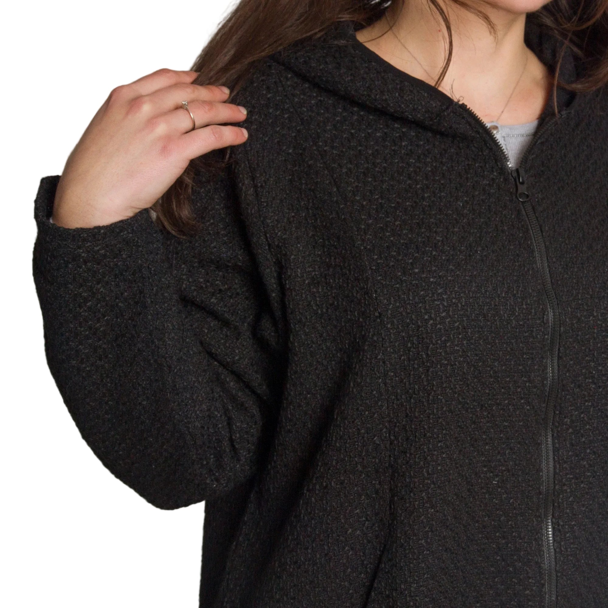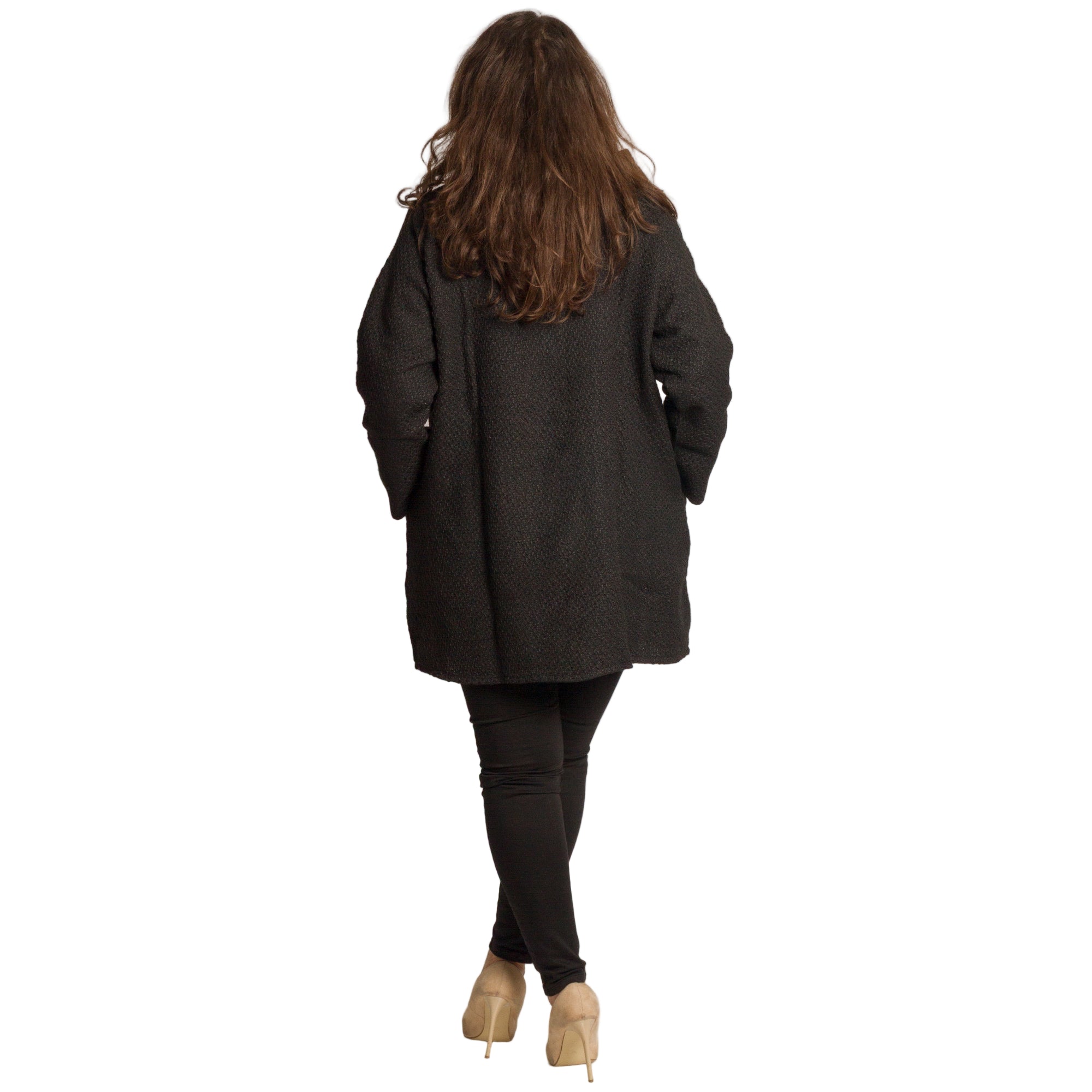 Елегантен жакет в черен цвят, подходящ за ежедневието и официални поводи. Изработен е от мека и топла материя с текстурирана повърхност, съчетаваща 50% памук и 50% акрил, което осигурява комфорт и издръжливост през студените дни.