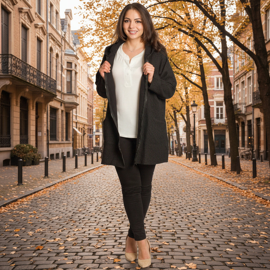 Моделът е с разкроена кройка, която подчертава фигурата, и е снабден с удобен цип по цялата дължина и практични джобове от двете страни. Качулката добавя модерен акцент и защита от вятър.