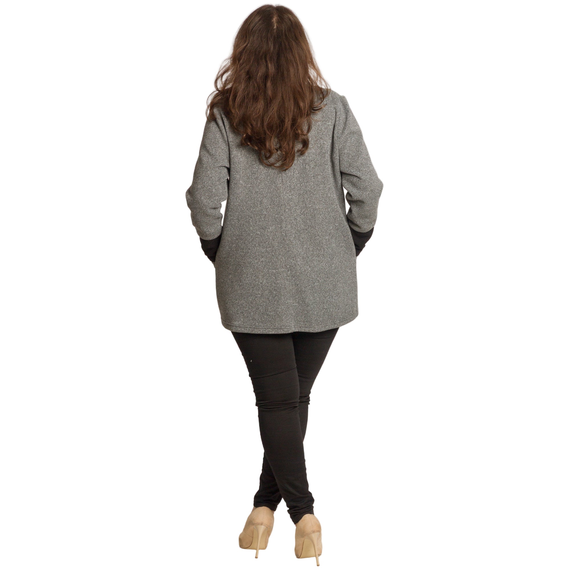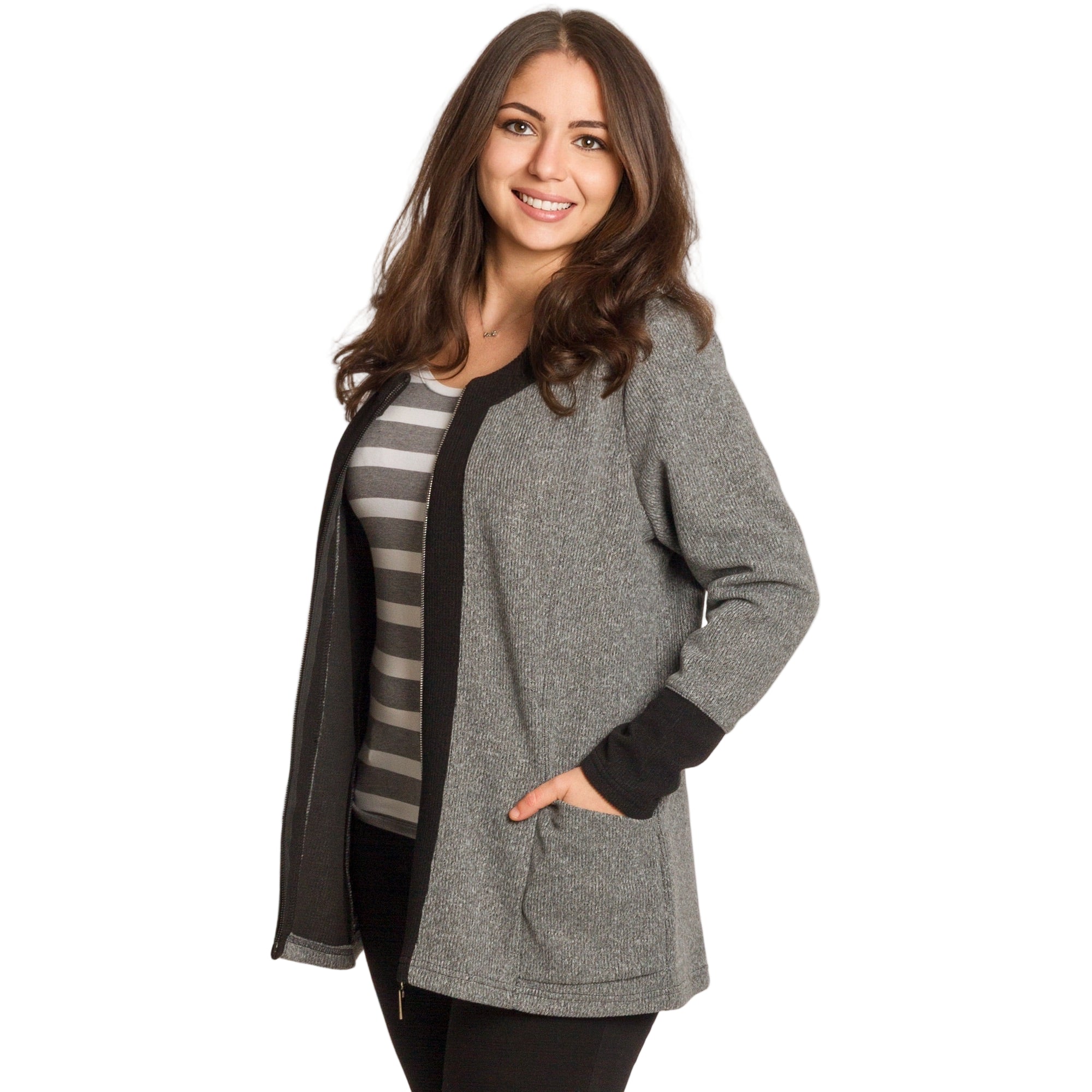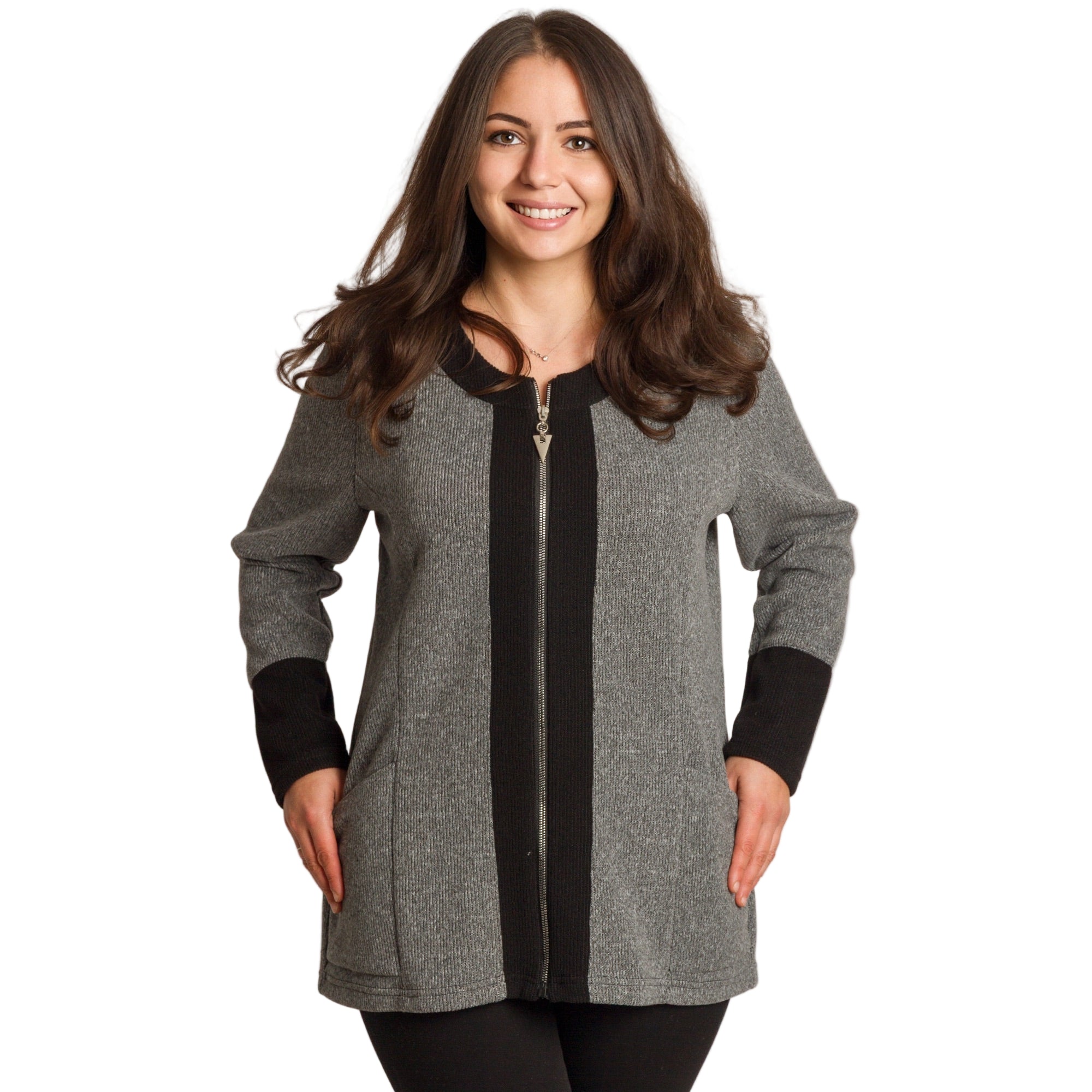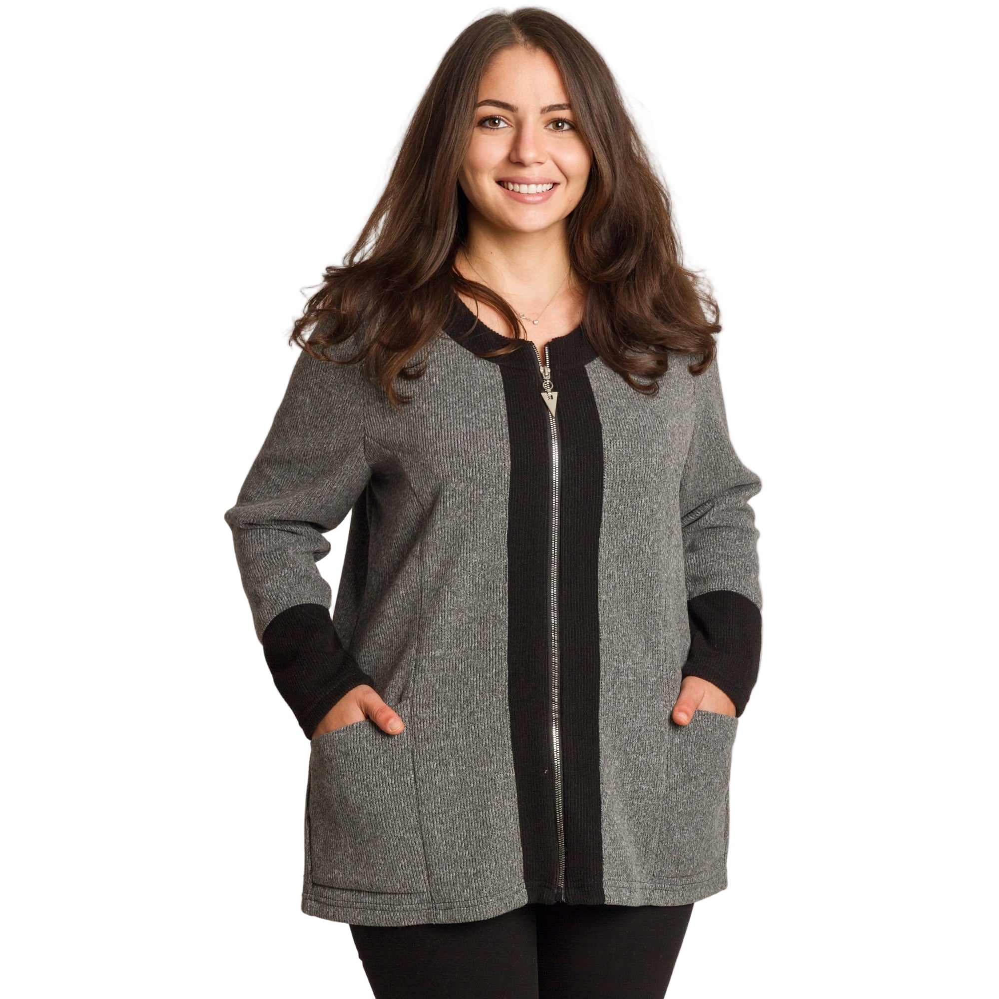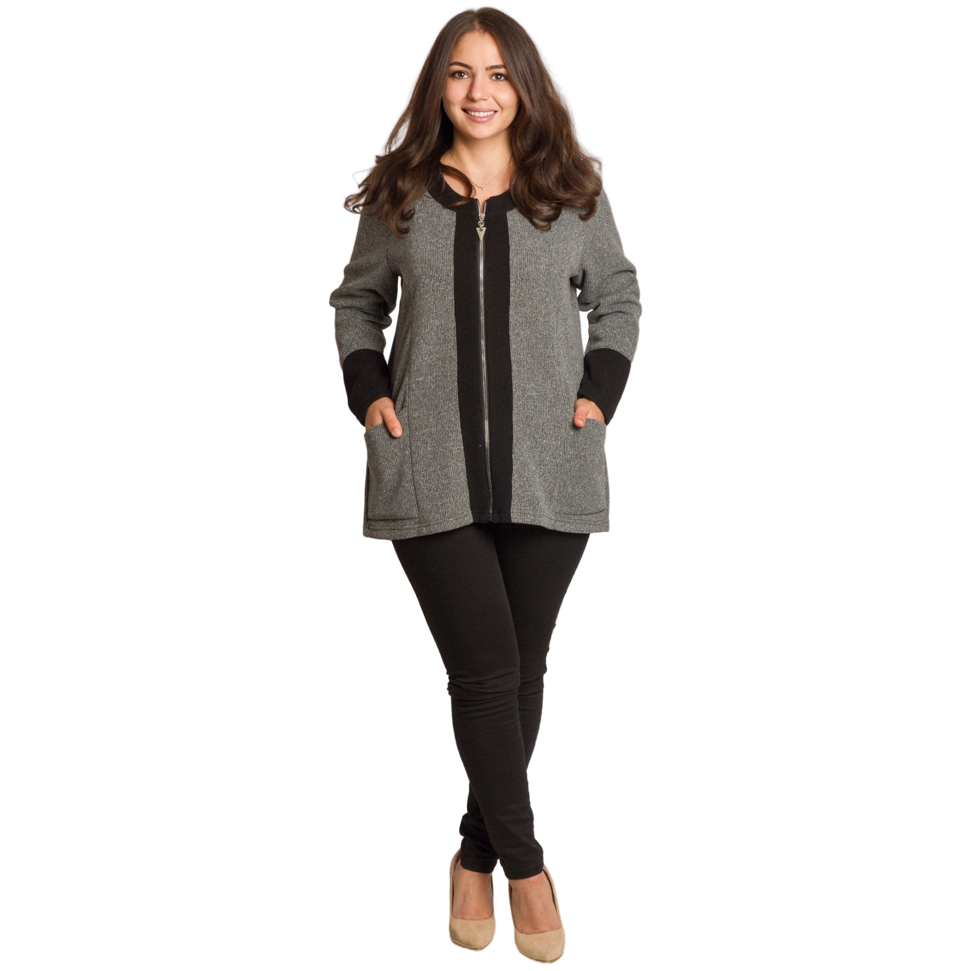 Елегантен дамски жакет в неутрален сив цвят, подходящ както за ежедневни, така и за официални поводи. Моделът е с дълги ръкави и удобна права кройка, осигуряваща комфорт и свобода на движение. Черните кантове около деколтето, ръкавите и по дължината на ципа създават изискан контраст и издължават силуета. Материята е мека, еластична и приятна на допир, идеална за есенно-зимния сезон. Джобовете отпред добавят функционалност и стил.