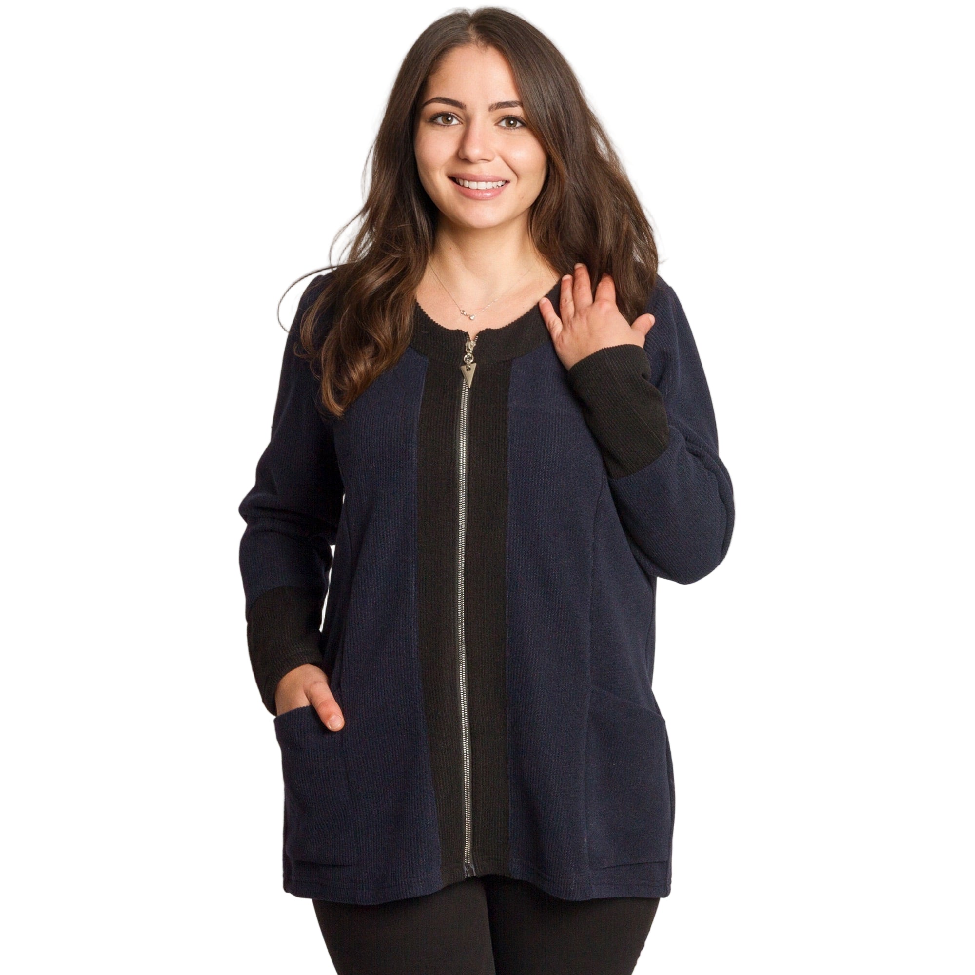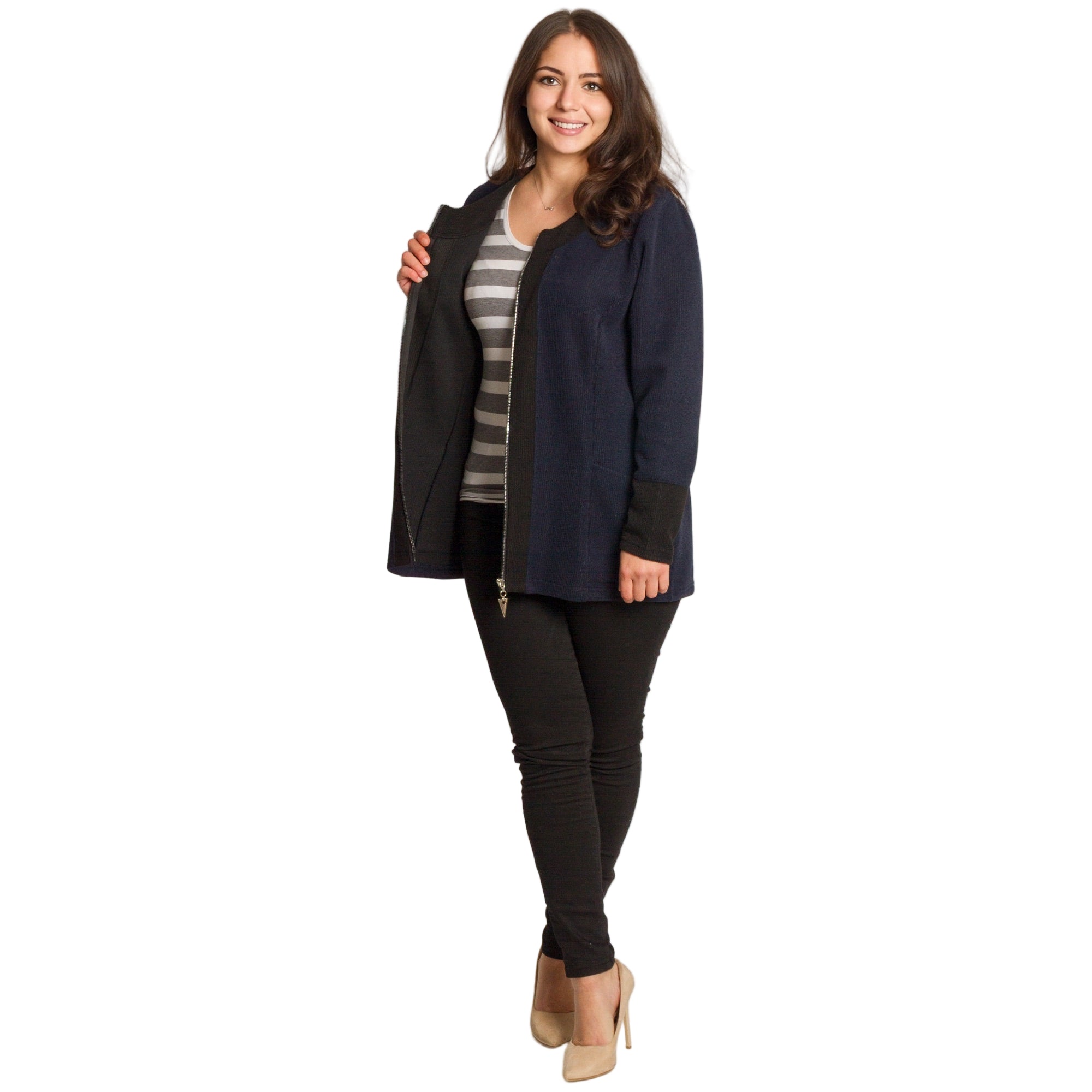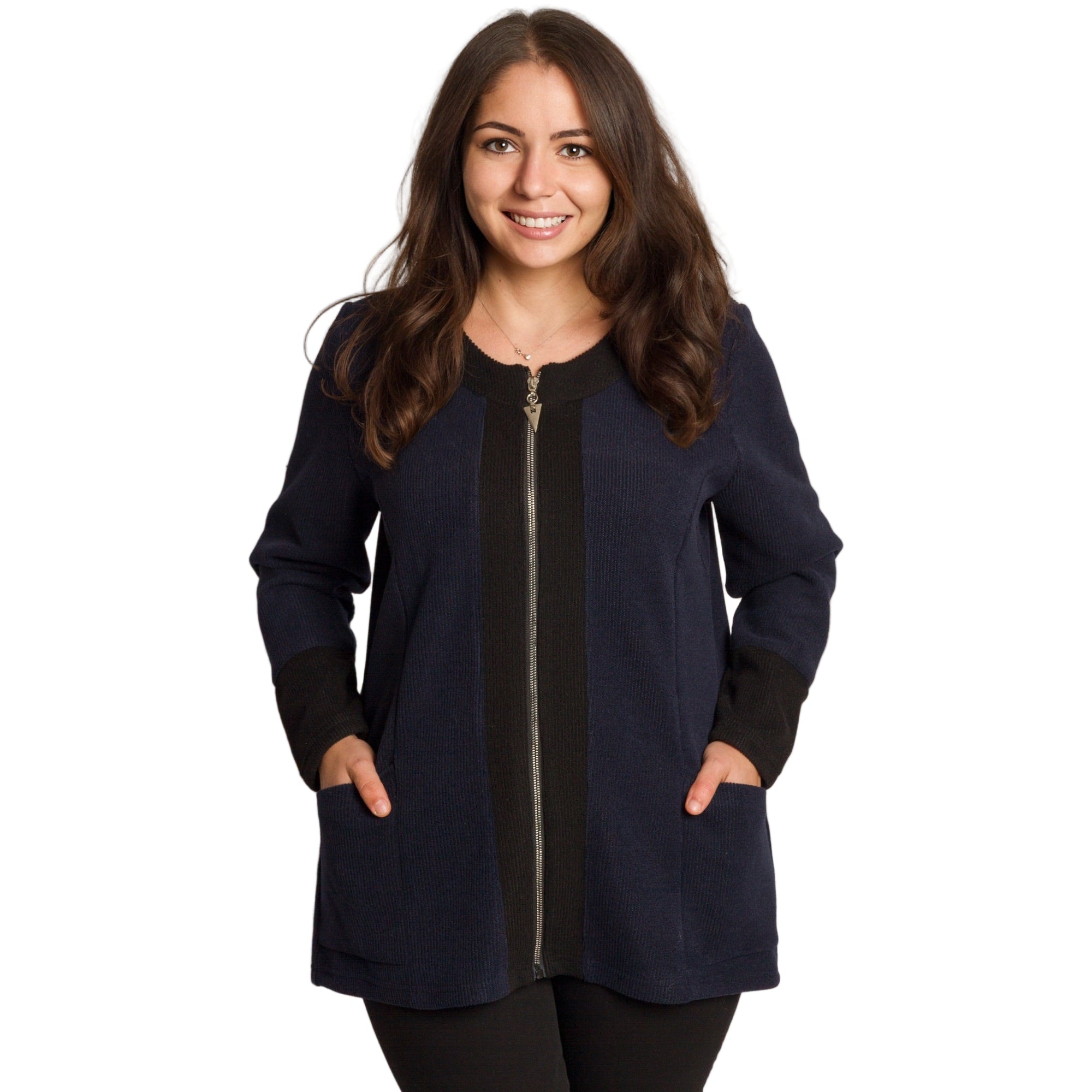 Елегантен дамски жакет в тъмносиньо, подходящ за ежедневието и за по-официални поводи. Моделът е с дълги ръкави и права кройка, осигуряваща комфорт и свобода на движение. Изработен е от мека, еластична материя, която приляга красиво към фигурата. Черните кантове около деколтето, ръкавите и по дължината на ципа създават изискан контраст и визуално издължават силуета. Практичните джобове придават удобство и функционалност.