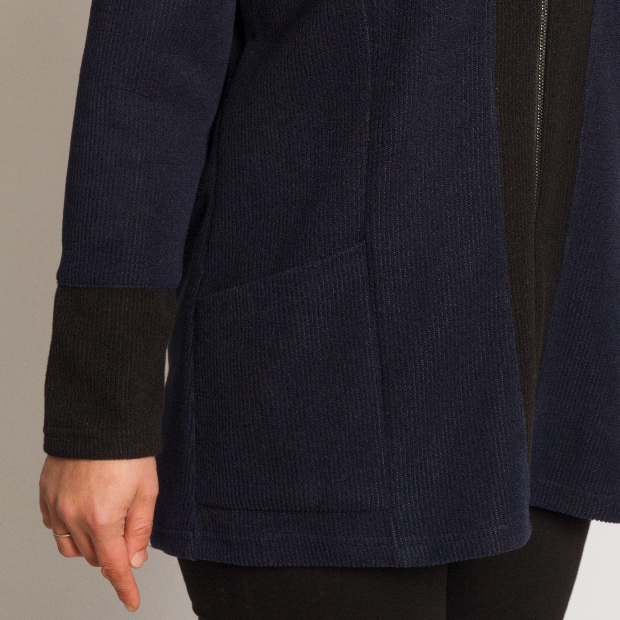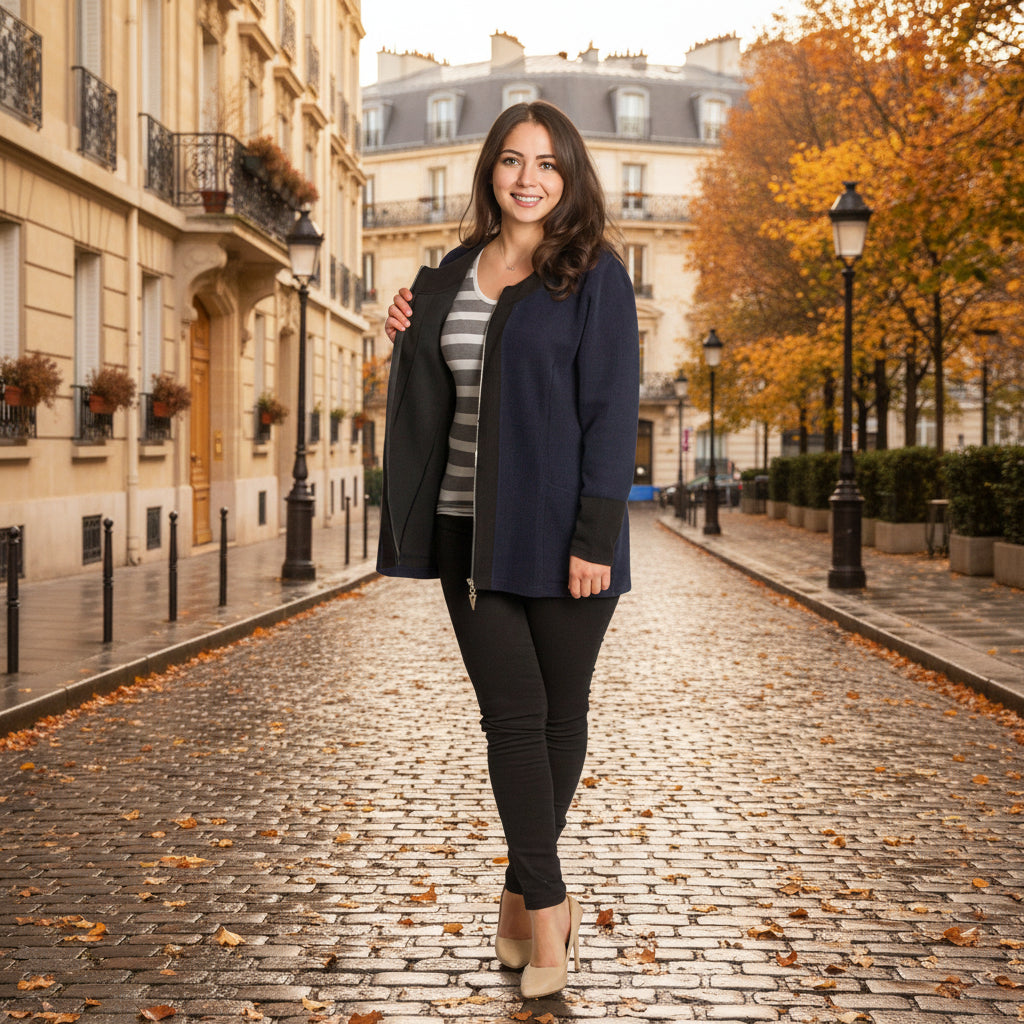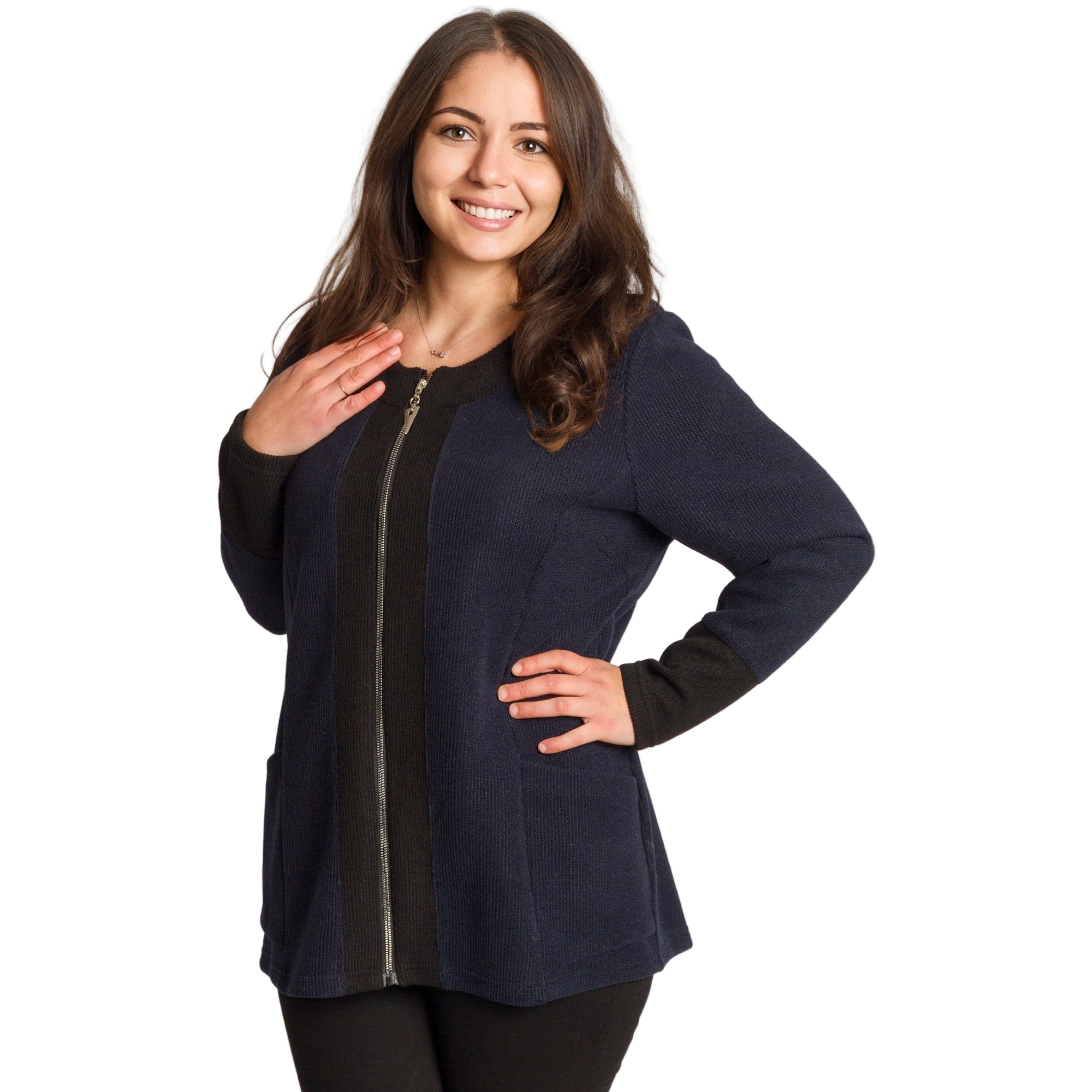 Елегантен дамски жакет в тъмносиньо, подходящ за ежедневието и за по-официални поводи. Моделът е с дълги ръкави и права кройка, осигуряваща комфорт и свобода на движение. Изработен е от мека, еластична материя, която приляга красиво към фигурата. Черните кантове около деколтето, ръкавите и по дължината на ципа създават изискан контраст и визуално издължават силуета. Практичните джобове придават удобство и функционалност.
