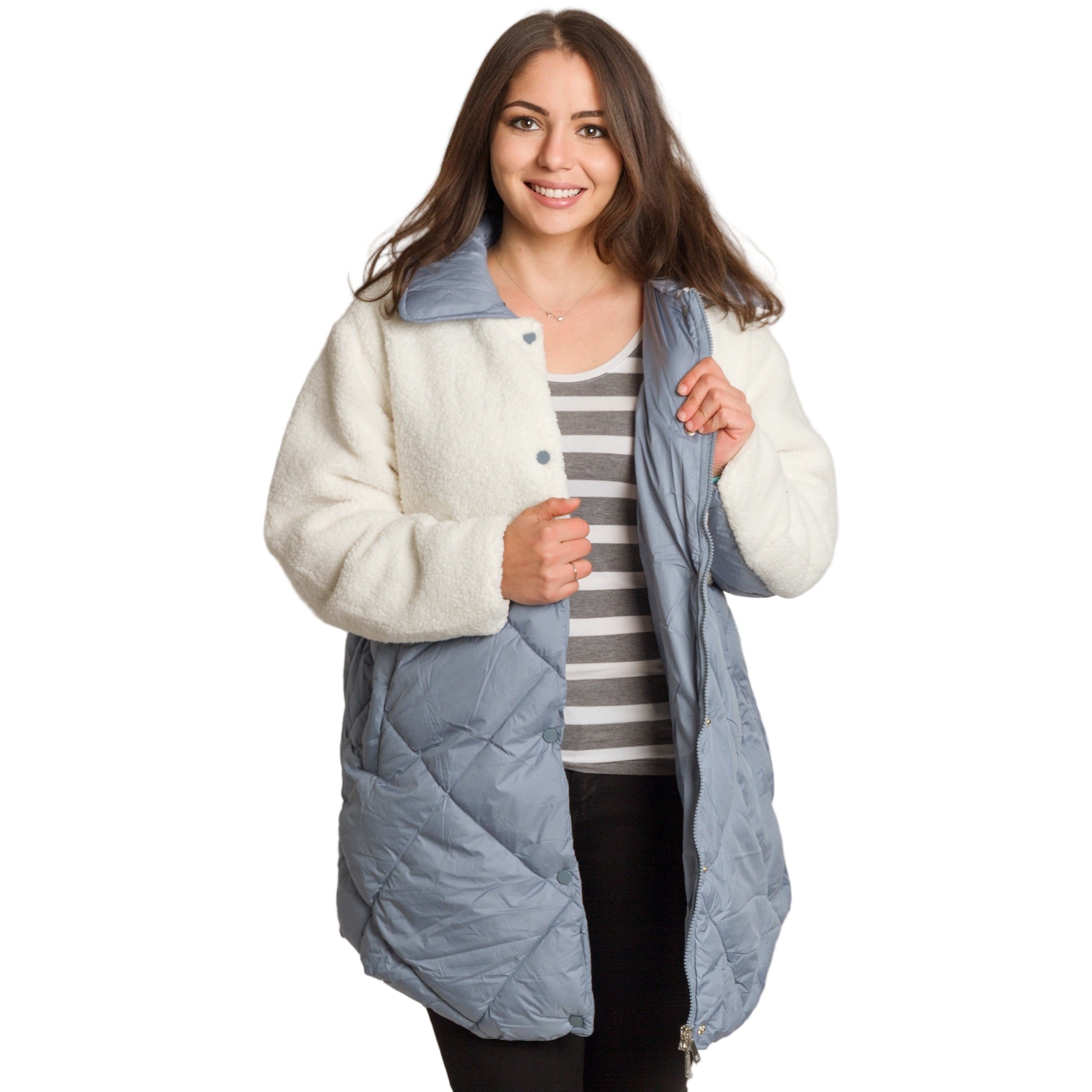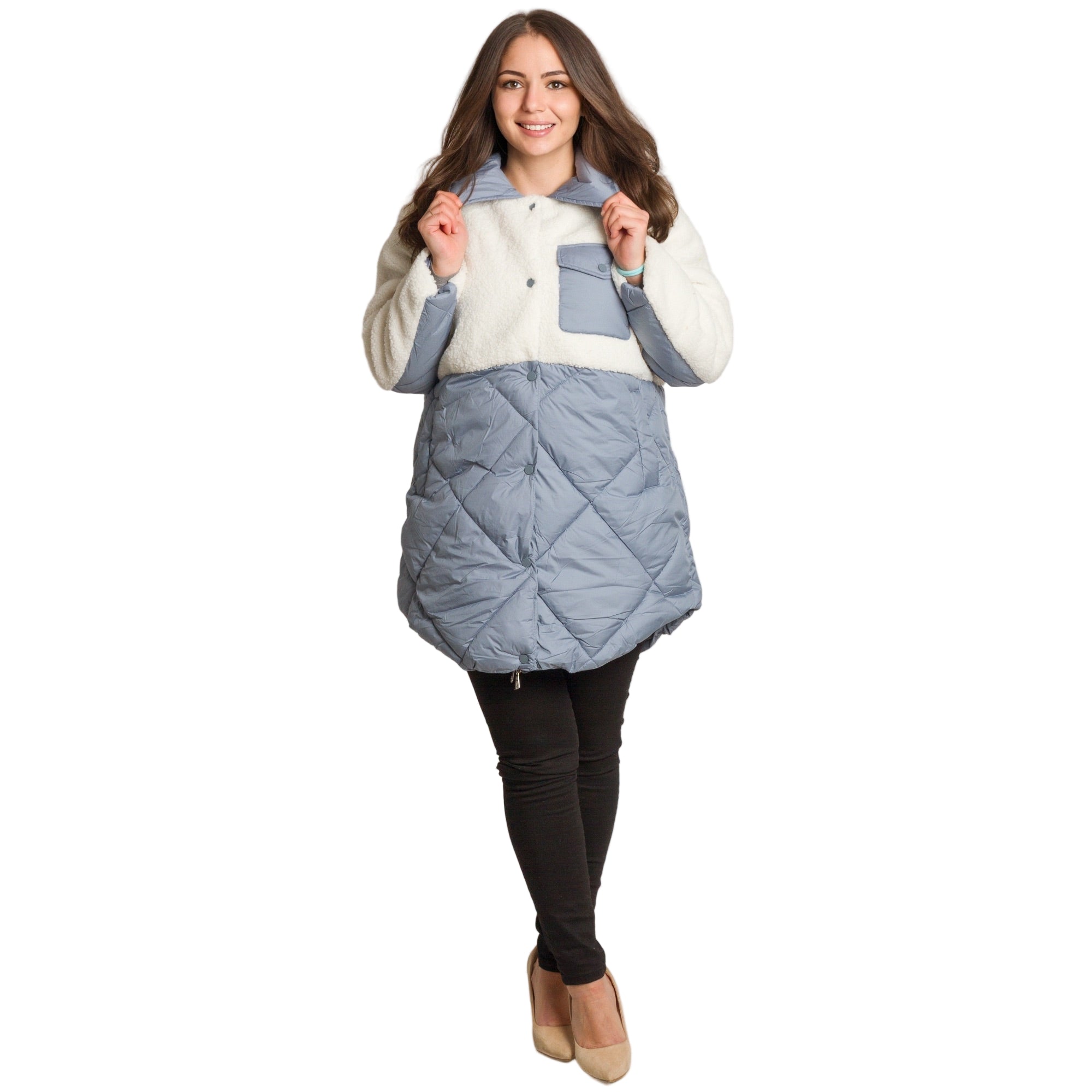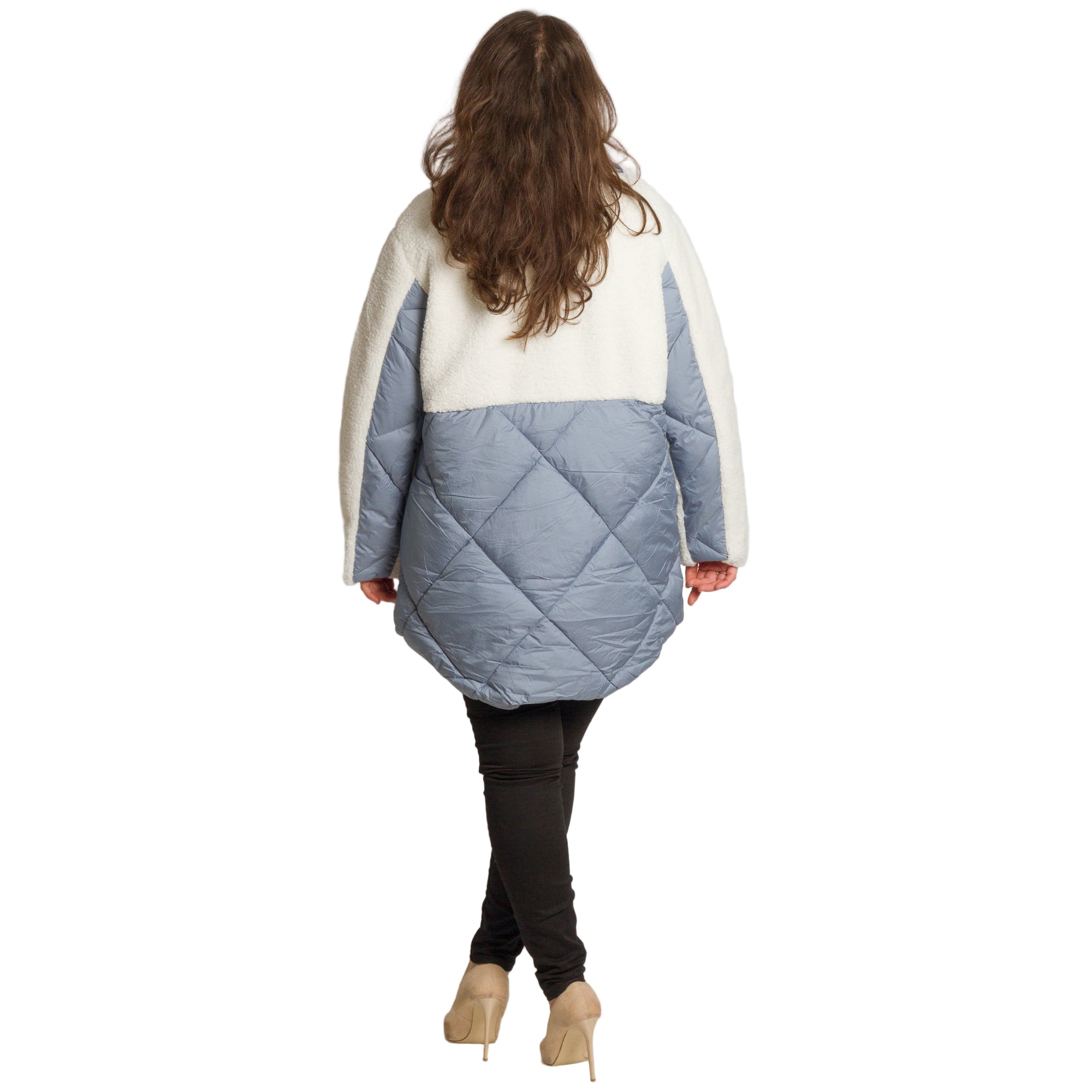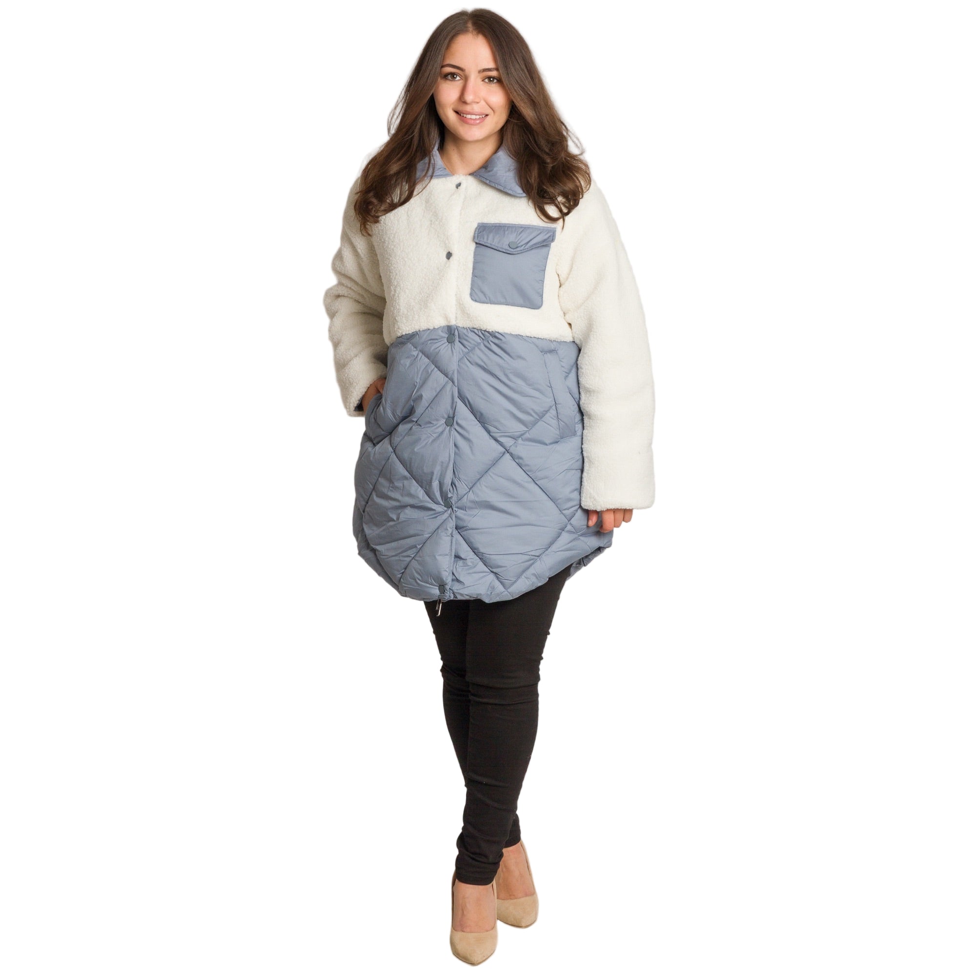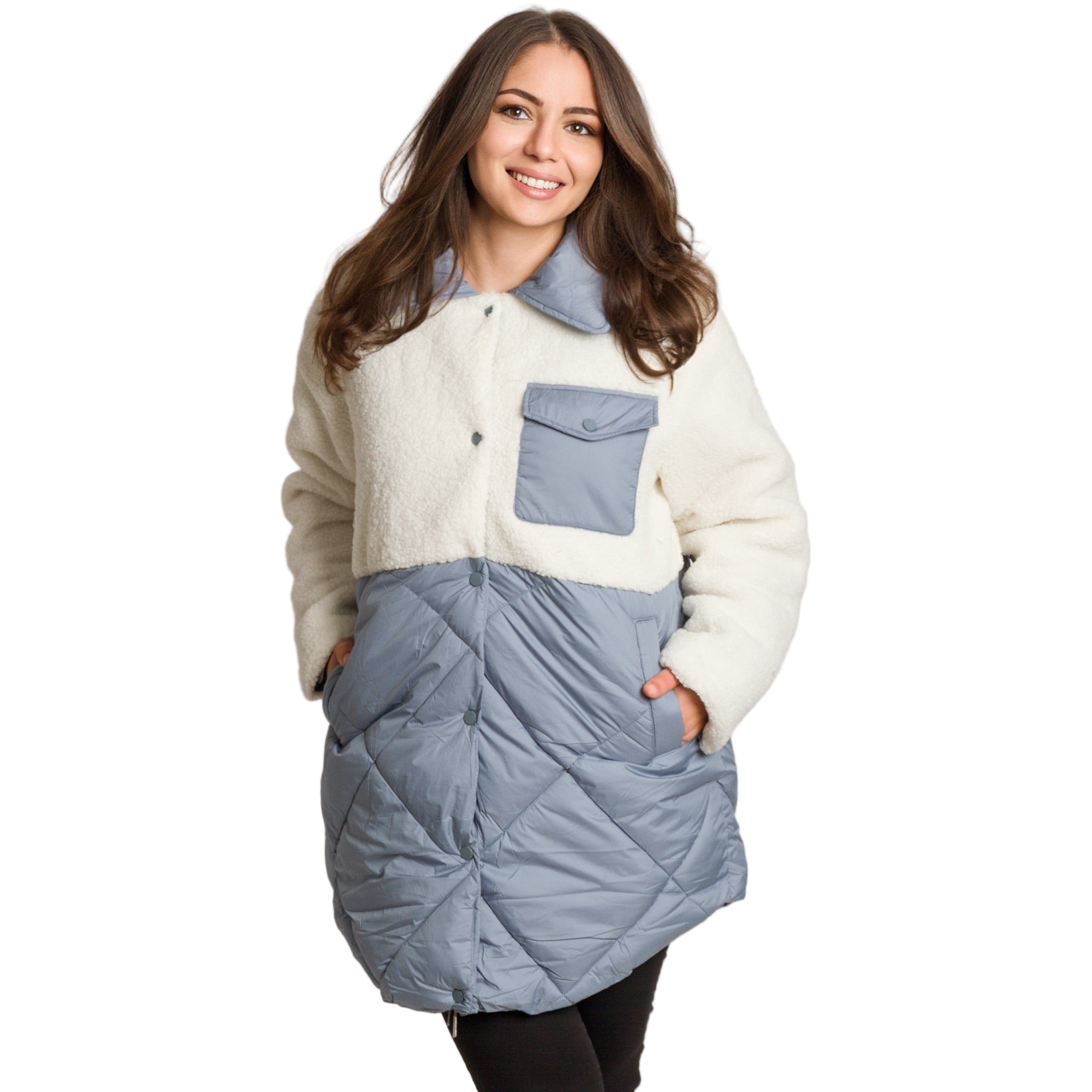 Стилно и модерно дамско яке в двуцветна комбинация от светлосиво и бяло. Горната част е изработена от мек и пухкав плат, който осигурява топлина и комфорт, а долната част е капитонирана и придава модерен вид и допълнителна защита от студа. Якето е с удобна свободна кройка, джобове от двете страни и едър декоративен джоб отпред. Закопчаването е с копчета, а дизайнът е подходящ както за ежедневието, така и за по-официални поводи през студените есенно-зимни дни.