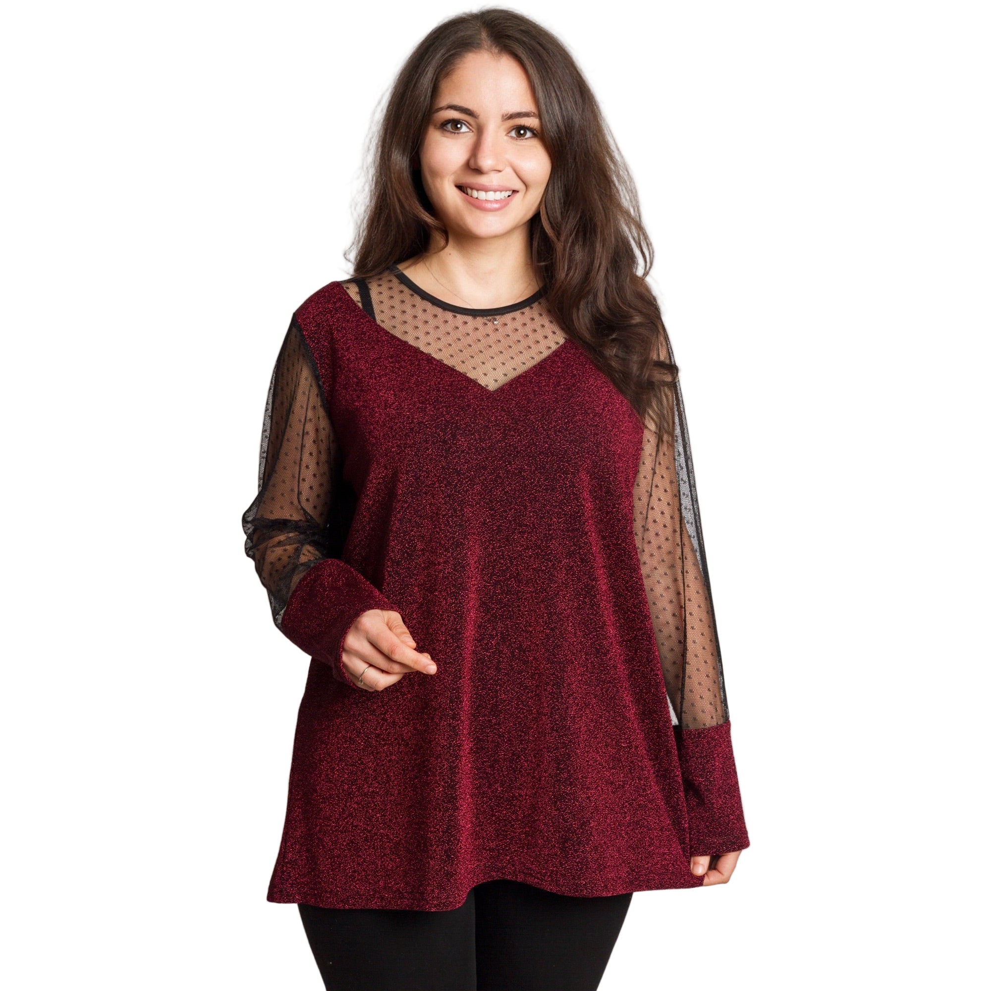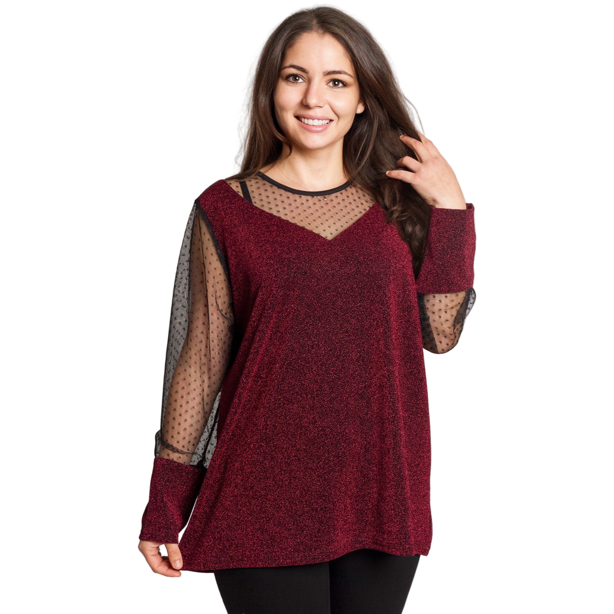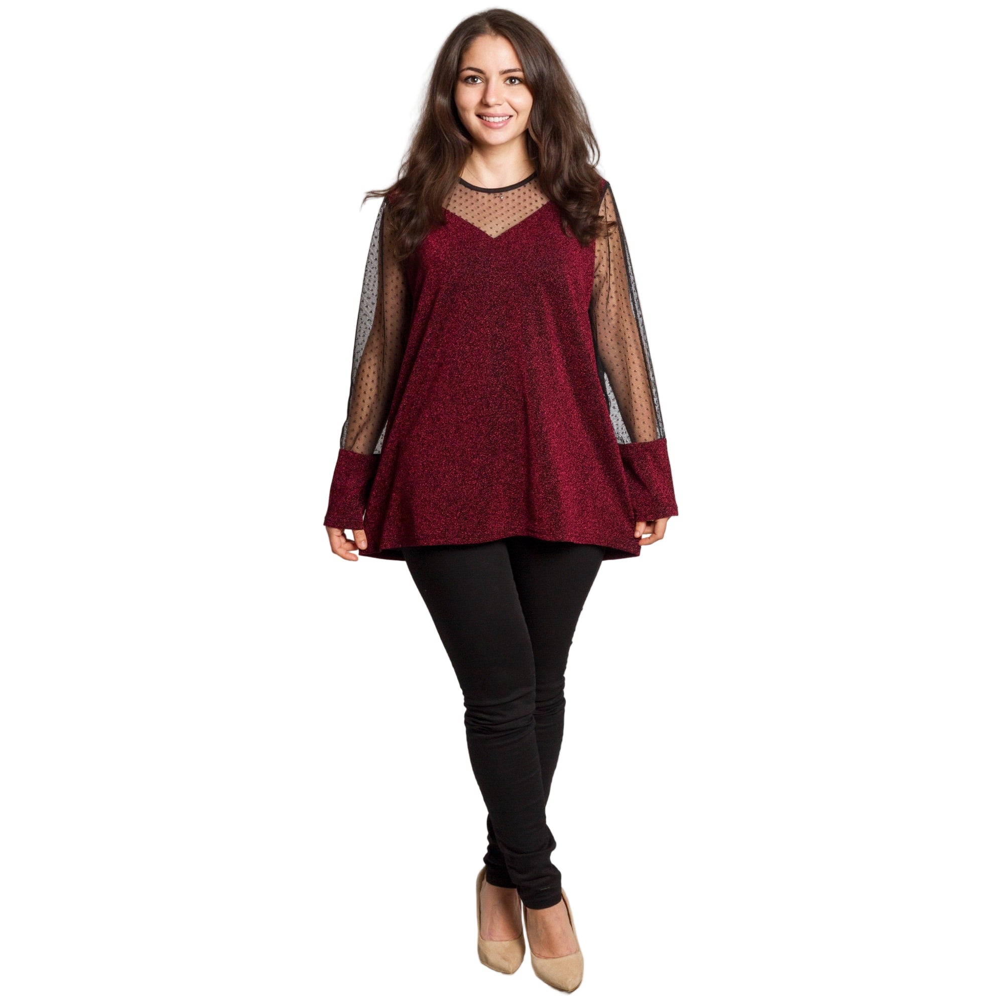 Стилна и модерна туника в бордо, създадена специално за дами в големи размери, които искат да се чувстват елегантни и уверени. Моделът впечатлява с тюлени ръкави и горна част с нежни точки, които придават празничен и женствен вид. Материята е лека, еластична и удобна, със слабо лъскав ефект, подходяща за официални събития през есенно-зимния сезон. Кройката е права и пада свободно по тялото, като прикрива зоните, които не желаем да се подчертават.