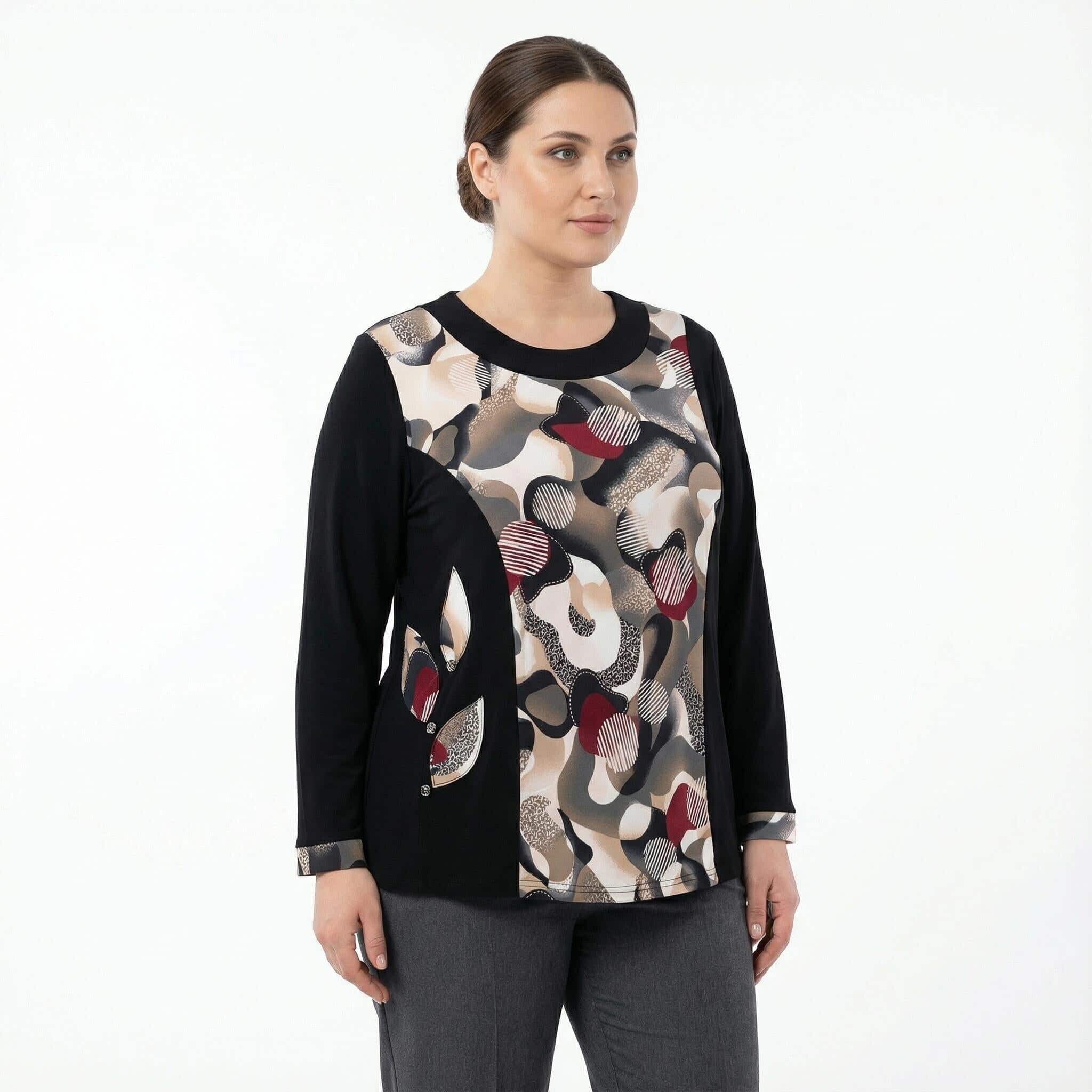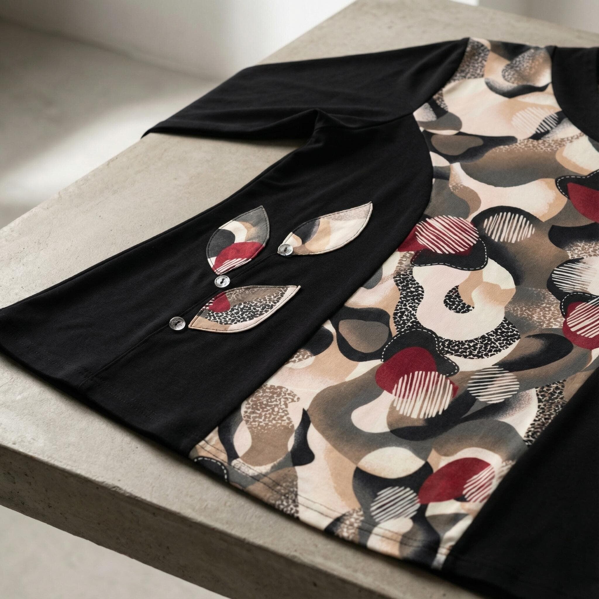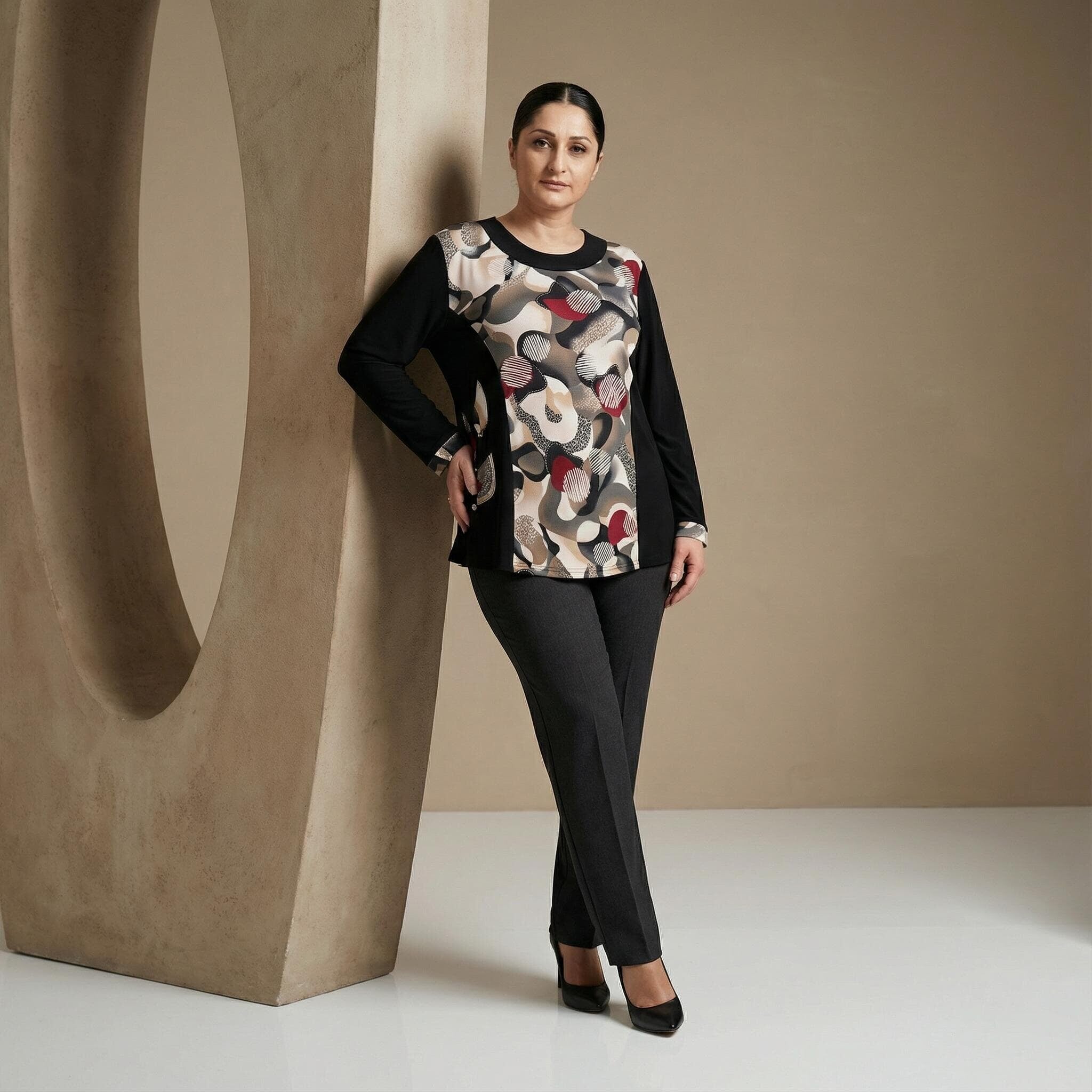 Открийте перфектния баланс между изискан стил и изключителен комфорт с тази елегантна туника от новата колекция на MaxiMarket. Създадена да гали кожата, тя е изработена от висококачествено вискозно трико с фина матова текстура, което пада тежко и красиво, без да описва излишно. Вместо стандартните решения, моделът залага на модерен, артистичен подход – централният цветен акцент с абстрактен принт в бежово, червено и сиво не само привлича погледа, но и визуално издължава силуета. Практичните странични джобове с деликатно копче и маншетите в същия десен добавят завършеност на визията. Тази туника е вашето „тайно оръжие“ за увереност – напълно подходяща както за деловата среда, така и за уютен уикенд обяд.