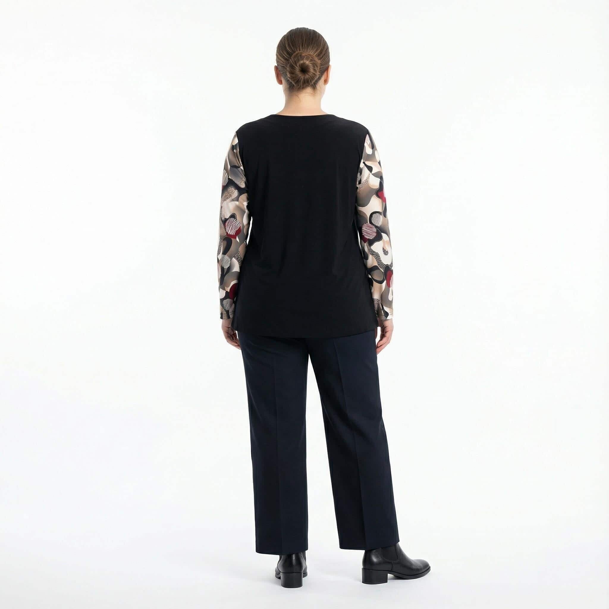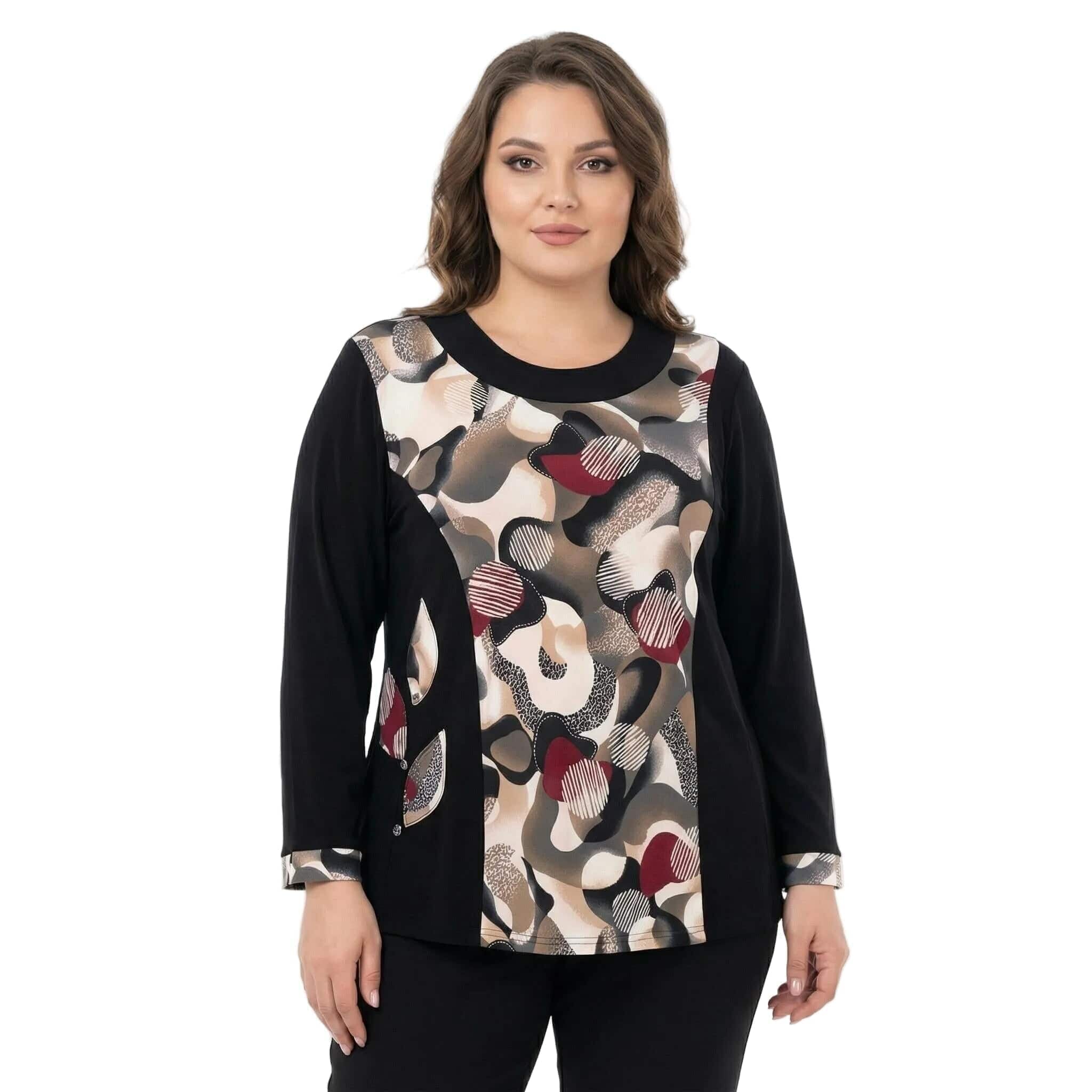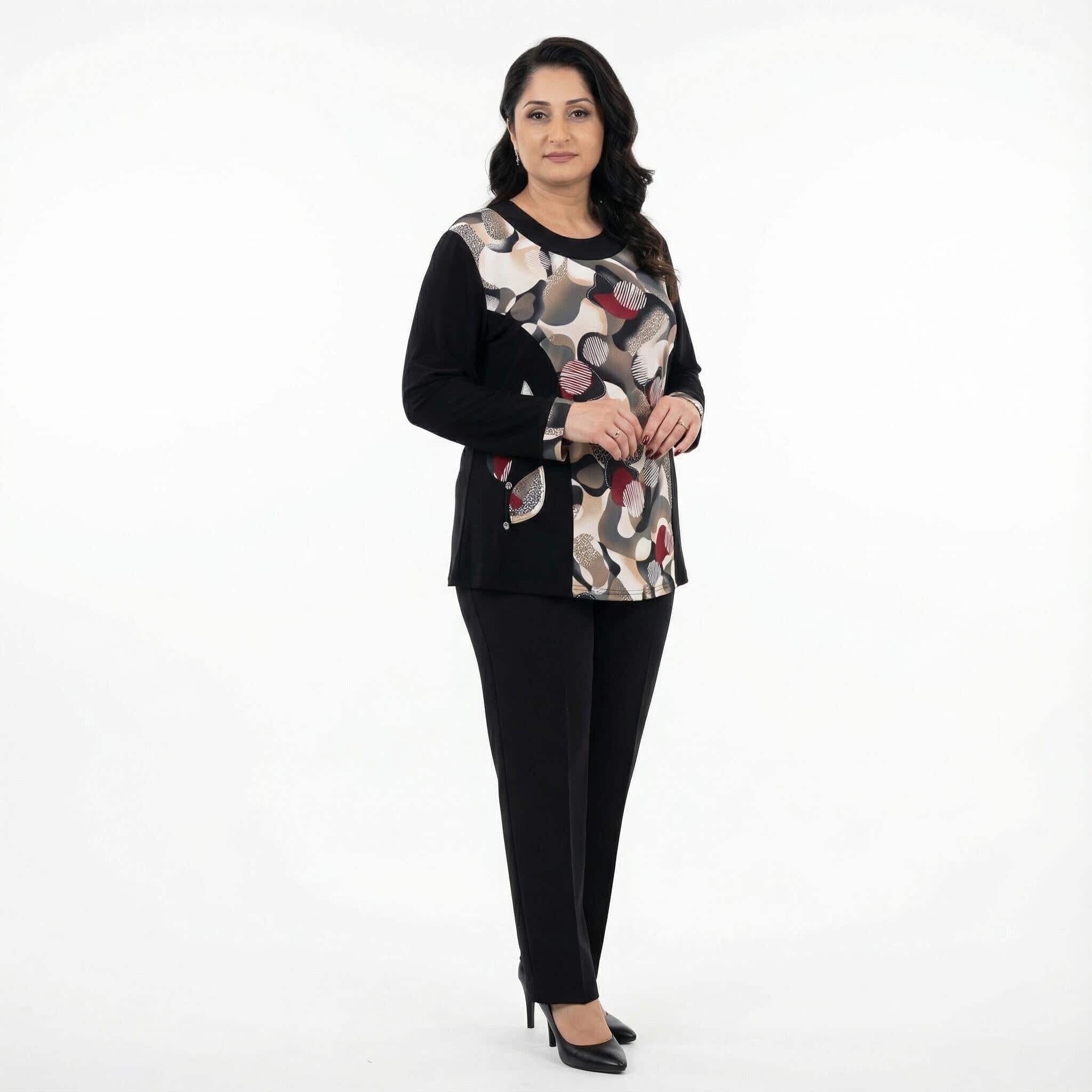Открийте перфектния баланс между изискан стил и изключителен комфорт с тази елегантна туника от новата колекция на MaxiMarket. Създадена да гали кожата, тя е изработена от висококачествено вискозно трико с фина матова текстура, което пада тежко и красиво, без да описва излишно. Вместо стандартните решения, моделът залага на модерен, артистичен подход – централният цветен акцент с абстрактен принт в бежово, червено и сиво не само привлича погледа, но и визуално издължава силуета. Практичните странични джобове с деликатно копче и маншетите в същия десен добавят завършеност на визията. Тази туника е вашето „тайно оръжие“ за увереност – напълно подходяща както за деловата среда, така и за уютен уикенд обяд.