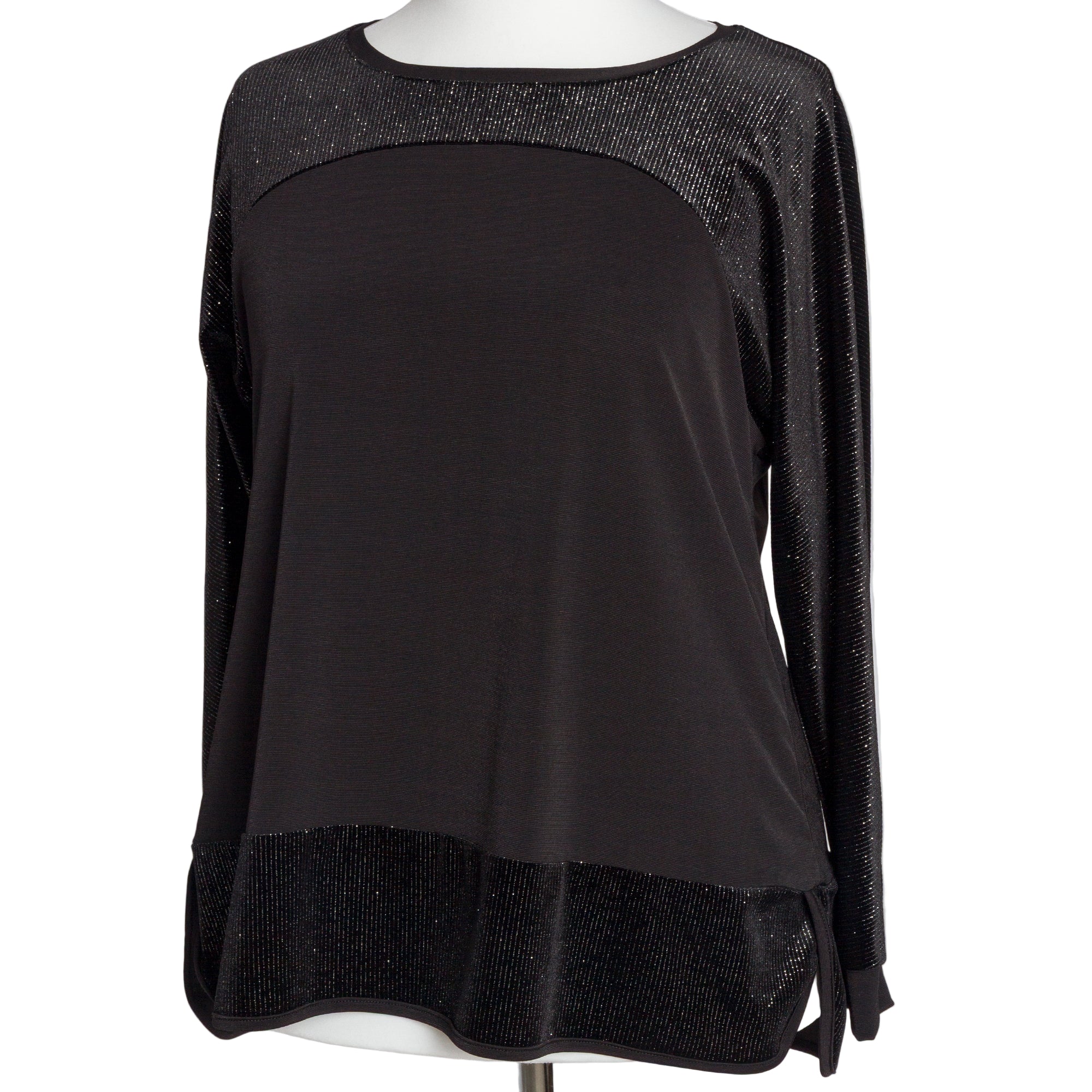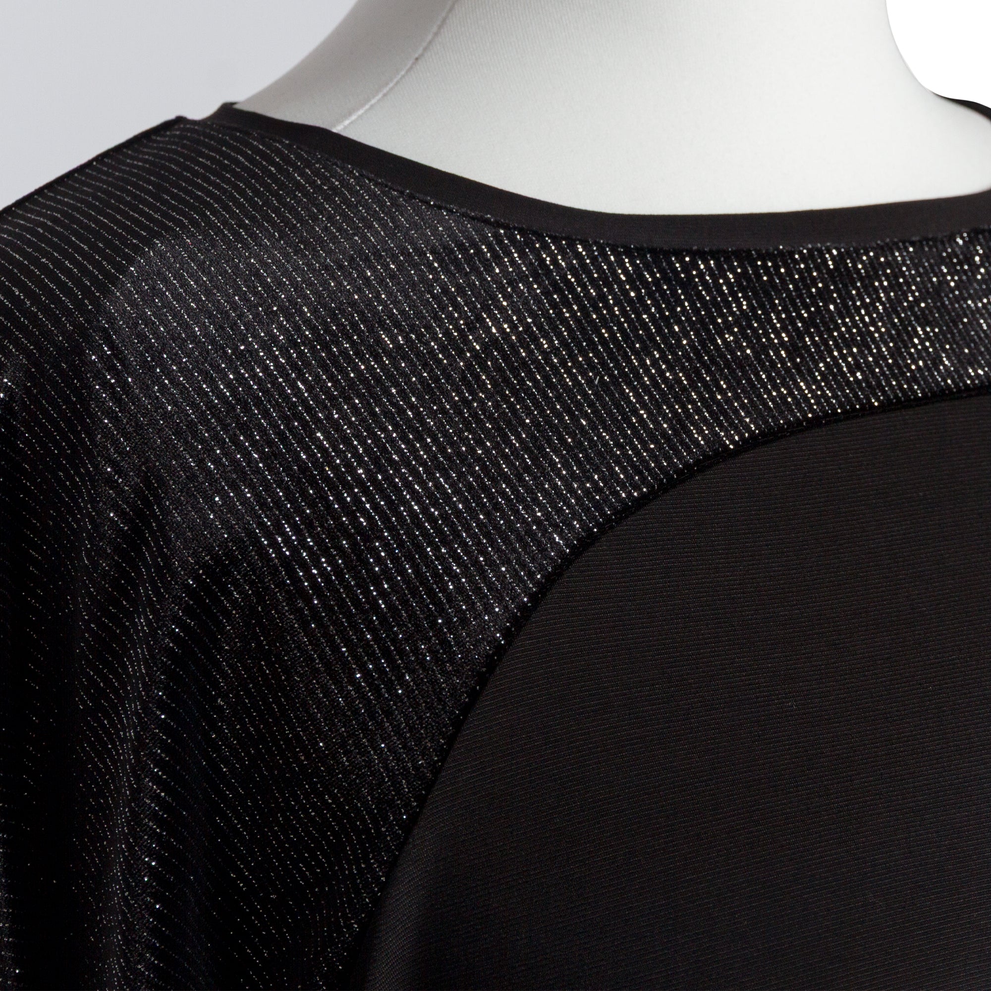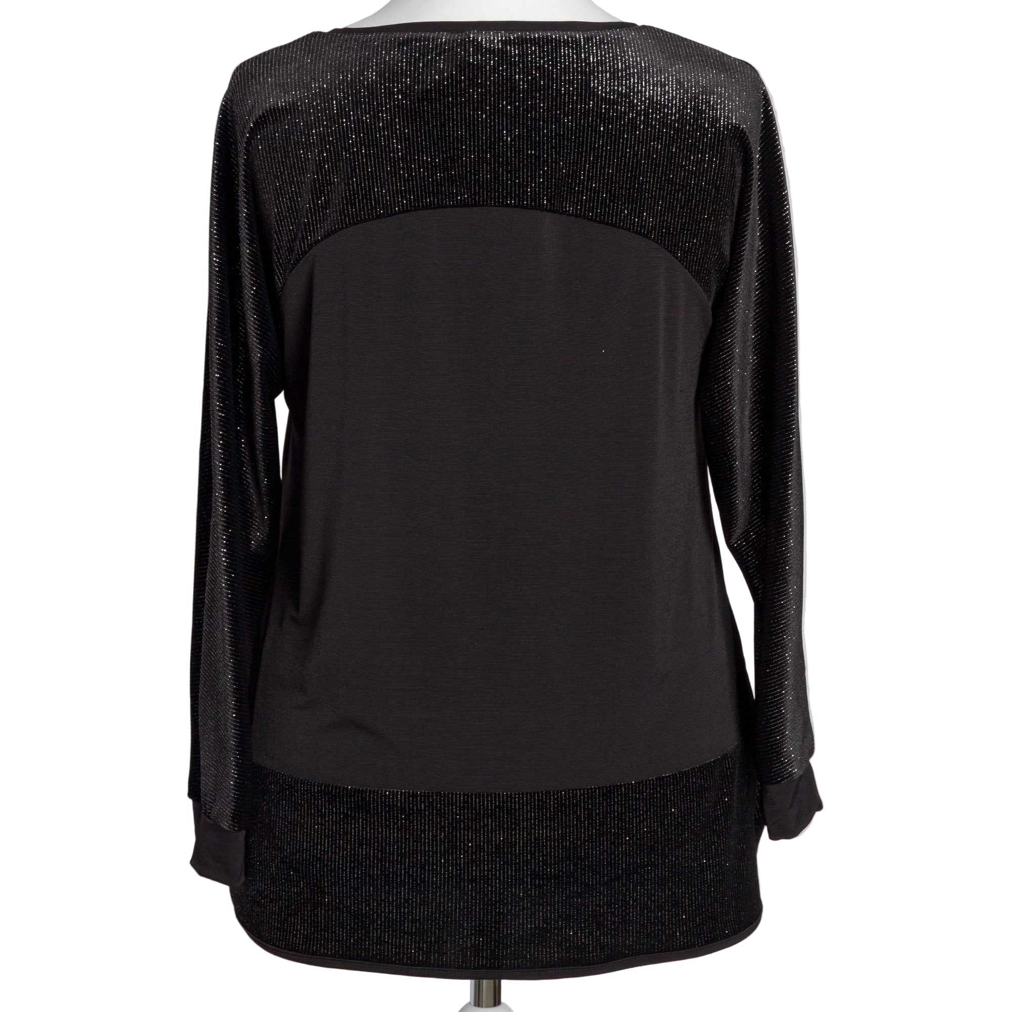 Тази елегантна черна туника в големи размери впечатлява с фин блясък и изискан дизайн. Горната част, ръкавите и долният кант са изработени от плат с деликатен блестящ ефект, който придава празнично и модерно излъчване. Леката, еластична материя осигурява комфорт и свобода на движение, а лодка деколтето подчертава елегантно линията на шията. Идеална за официални поводи, празнични събития и стилни вечери през есенно-зимния сезон.
