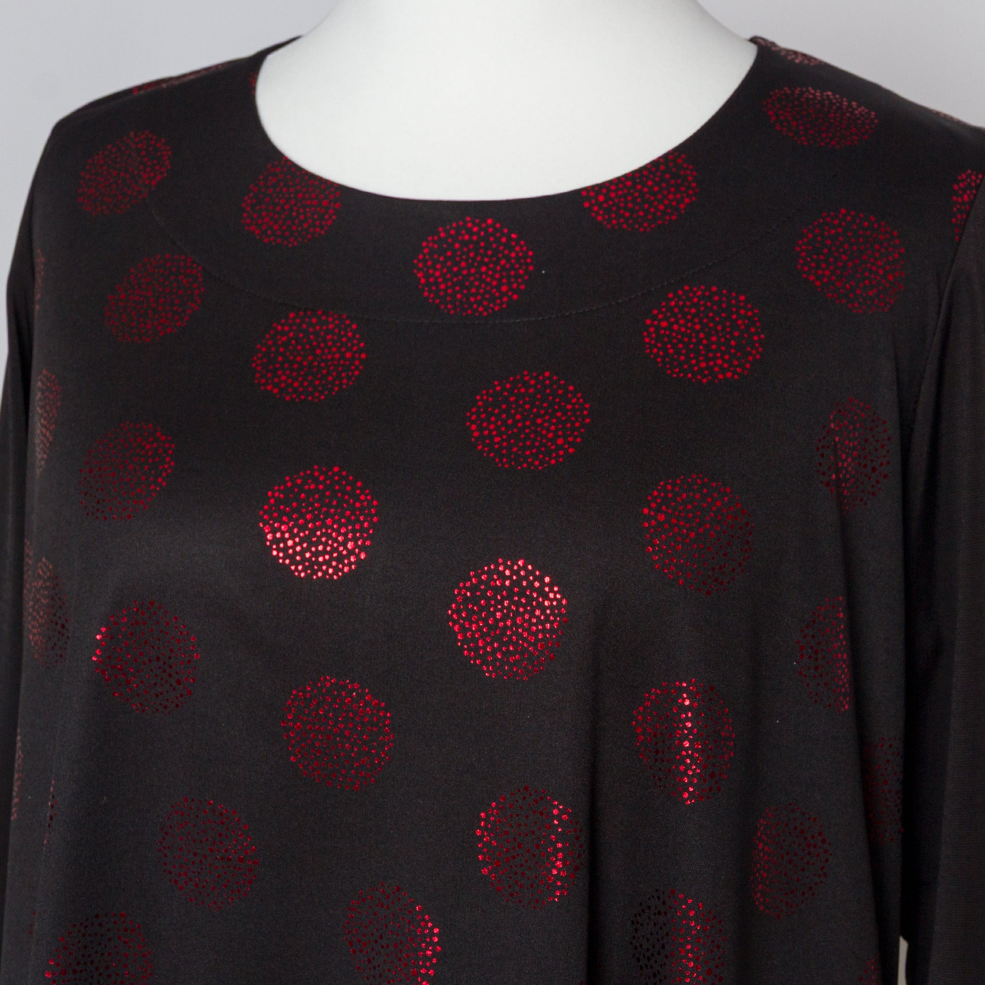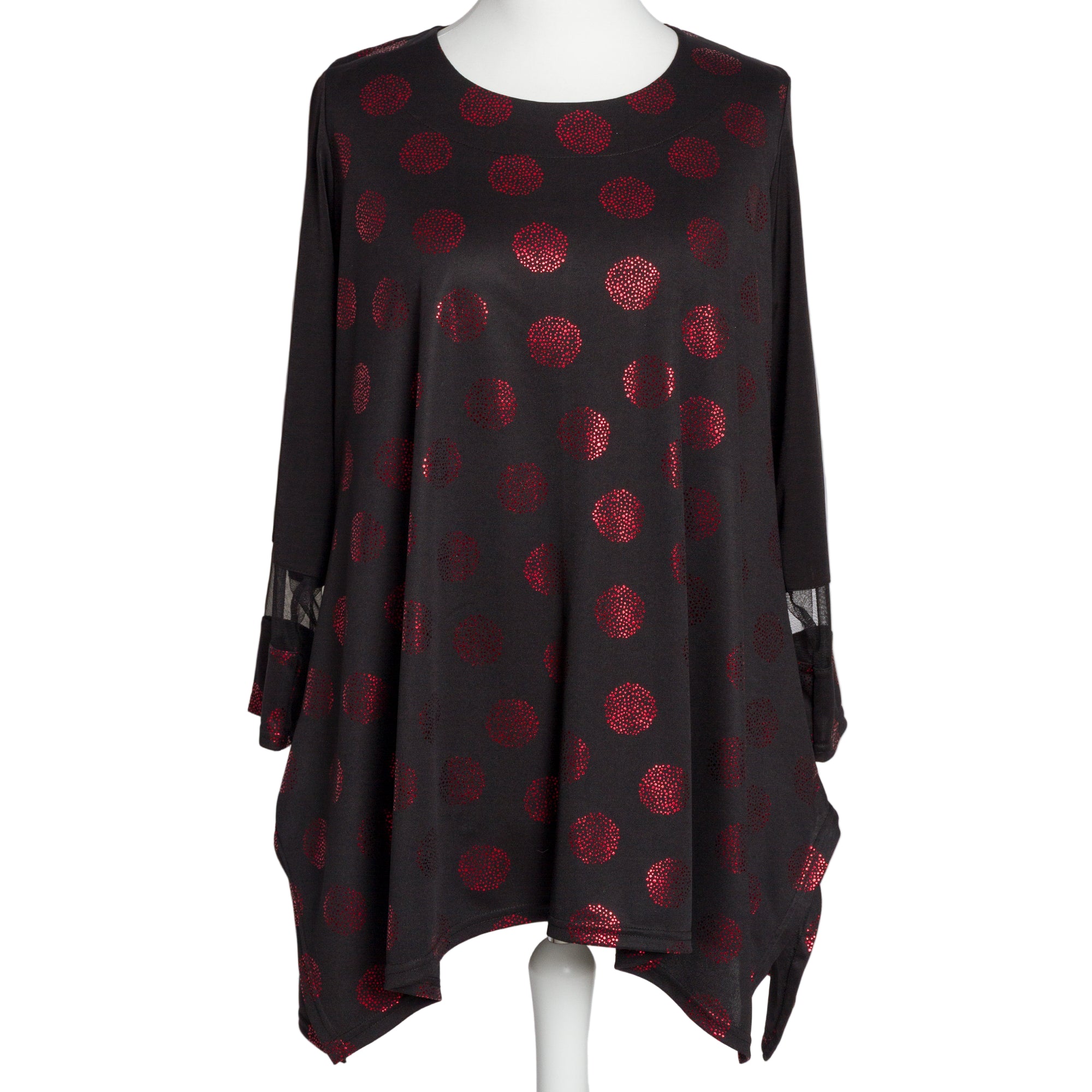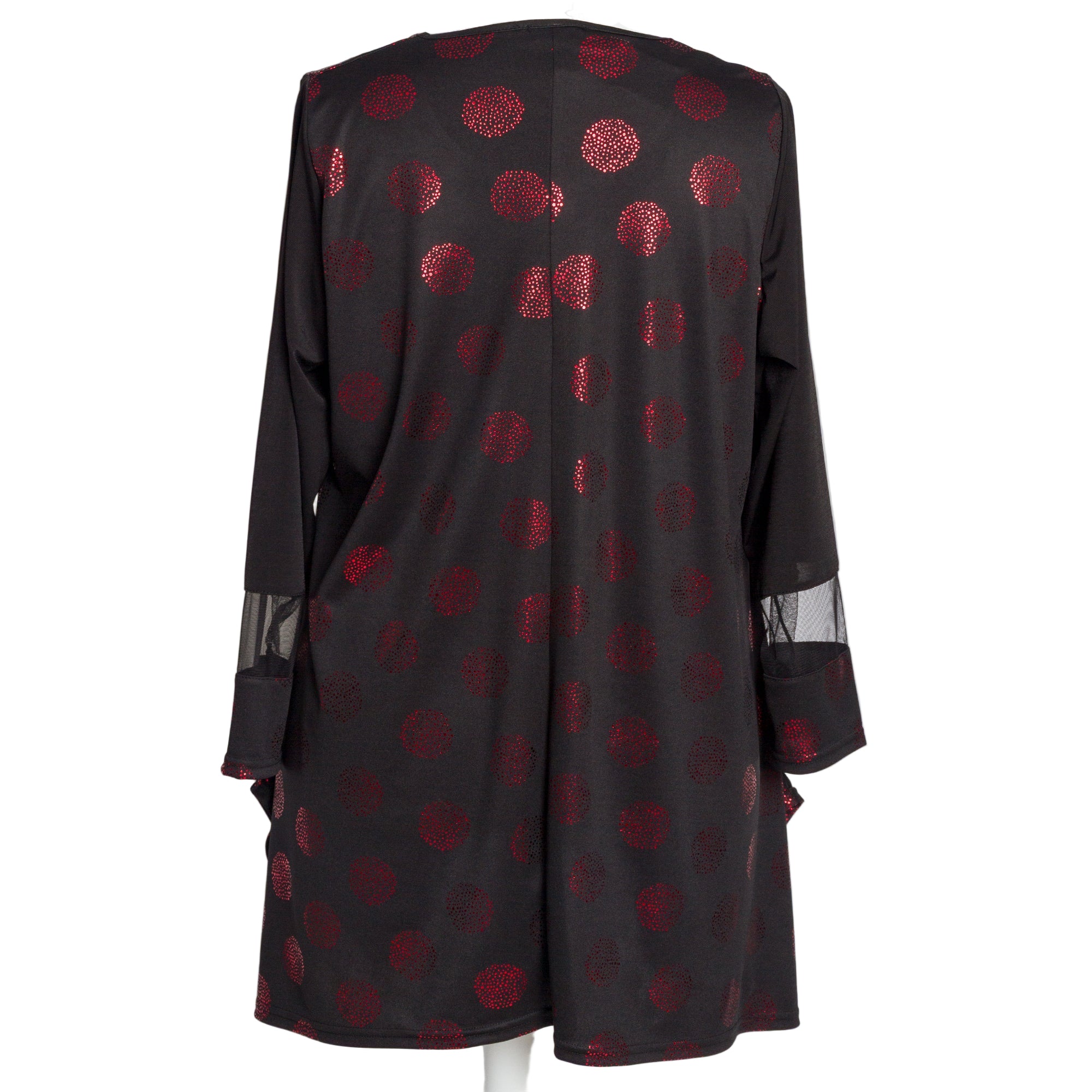 Тази впечатляваща черна туника в големи размери съчетава класически силует с ефектен модерен десен. Декорирана с червени лъскави точки, тя придава празнично и женствено излъчване, подходящо за официални събития и специални поводи. Разкроената кройка пада свободно по тялото и осигурява комфорт, докато облото деколте и дългите ръкави с декоративни прозрачни елементи добавят изискан детайл. Перфектен избор за елегантна визия през есенно-зимния сезон.