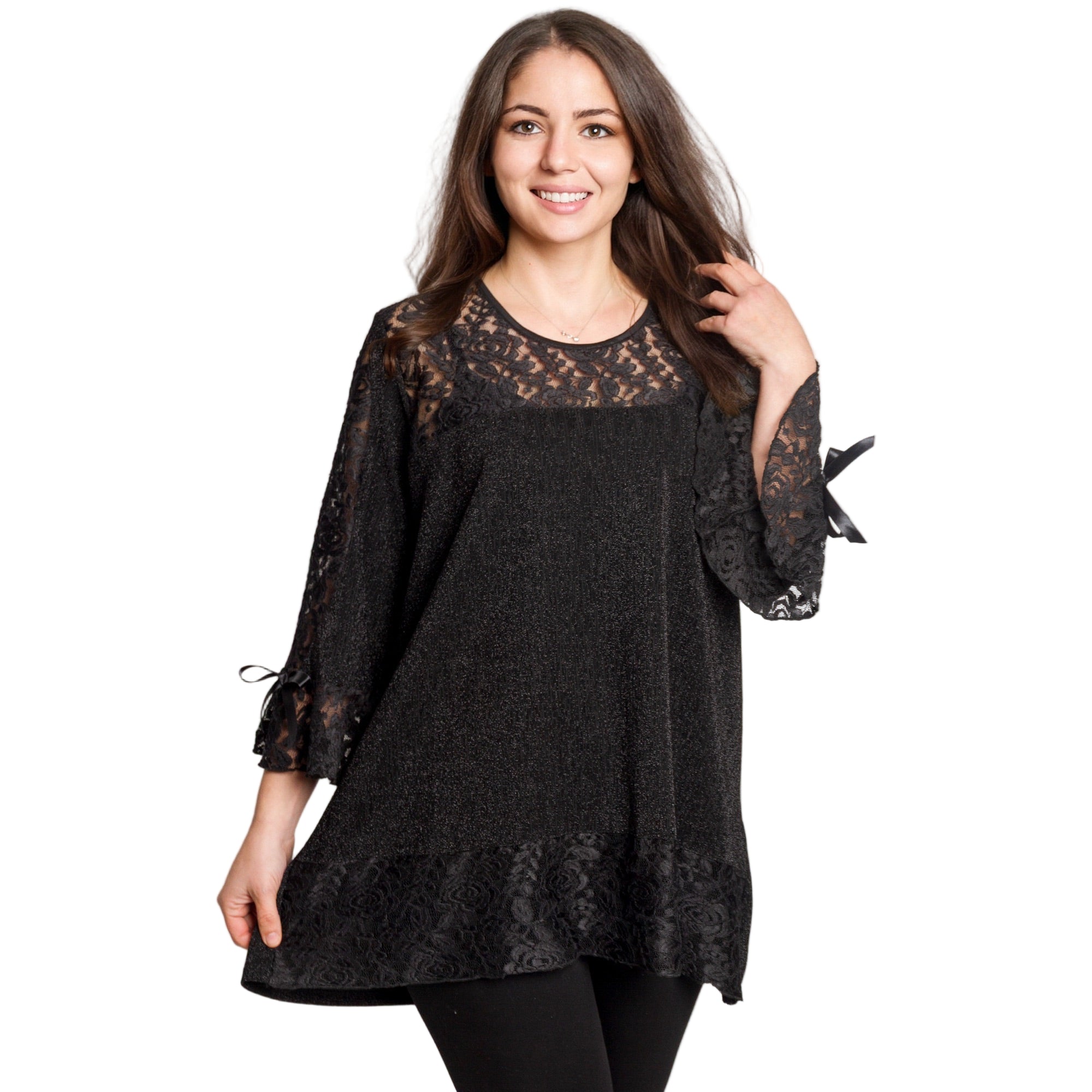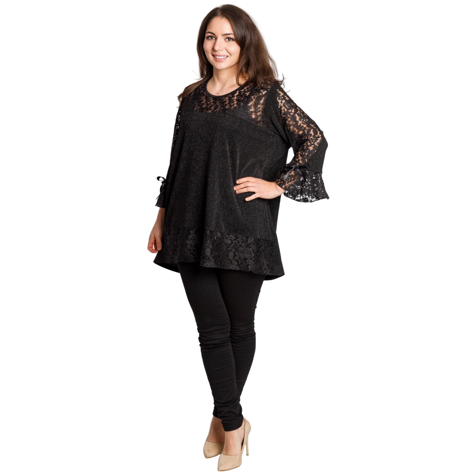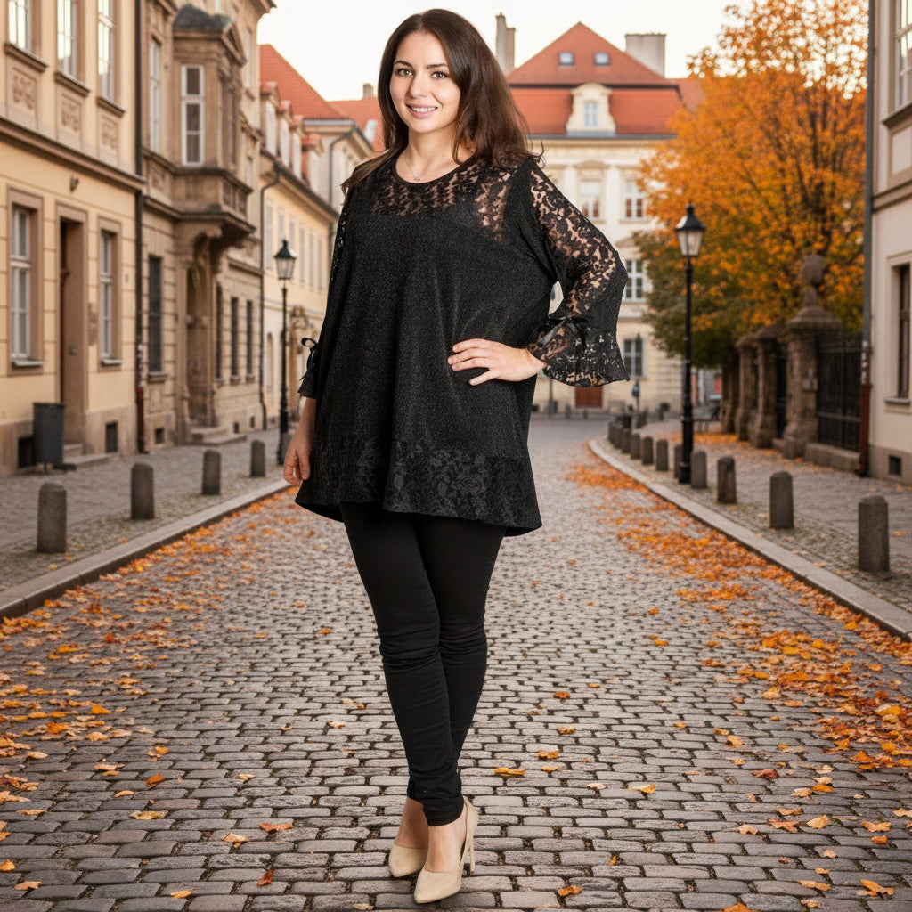 Луксозна черна туника, създадена за дами в големи размери, които искат да изглеждат впечатляващо и елегантно. Горната част и ръкавите са изработени от фина дантела с красив флорален мотив и лека прозрачност, която придава изтънчен и празничен вид. Материята е еластична и удобна, с деликатен брокатен отблясък, който подчертава женствеността. Свободната кройка пада плавно по тялото и прикрива нежеланите зони, като осигурява комфорт през целия ден или вечер. Подходяща за официални поводи през есенно-зимния сезон.