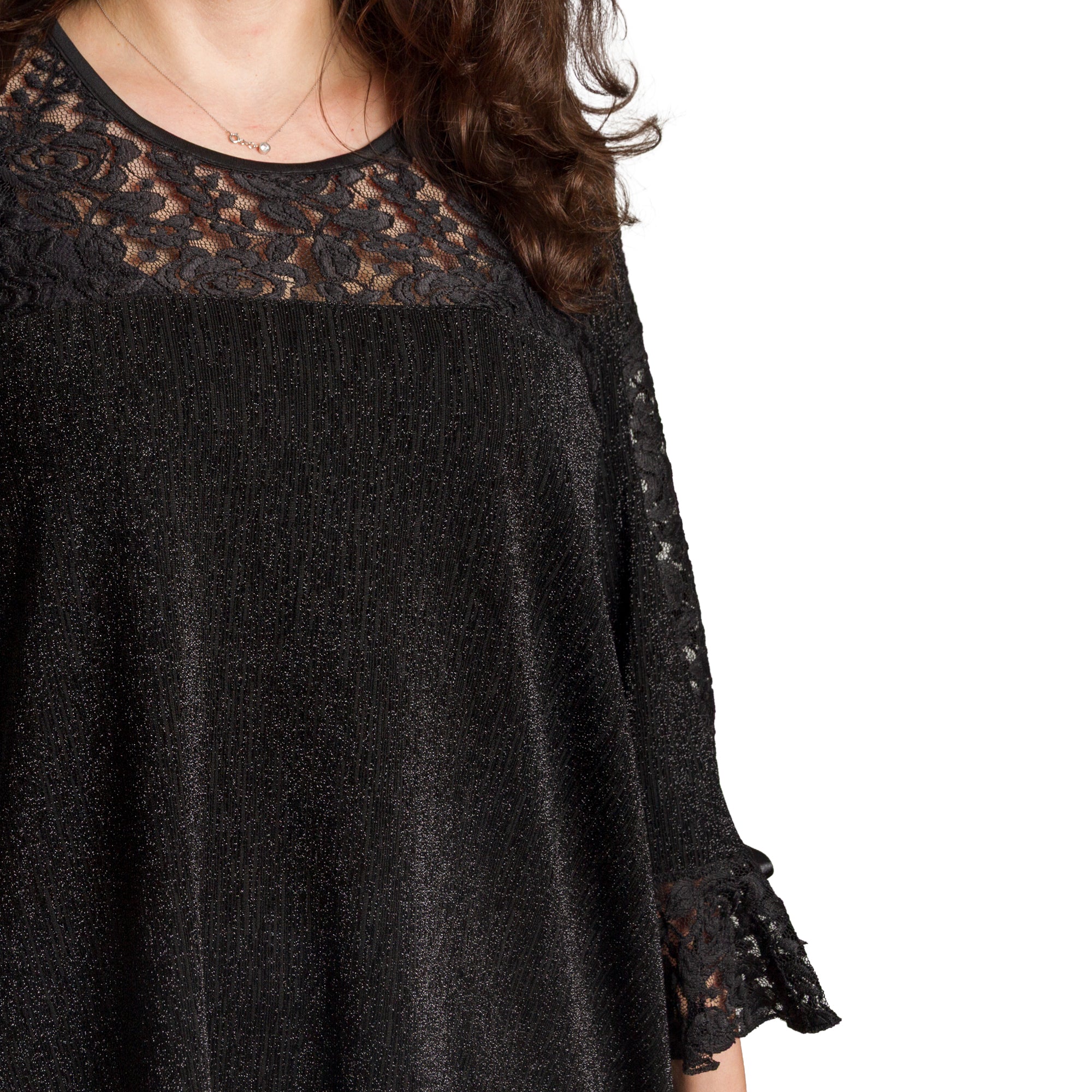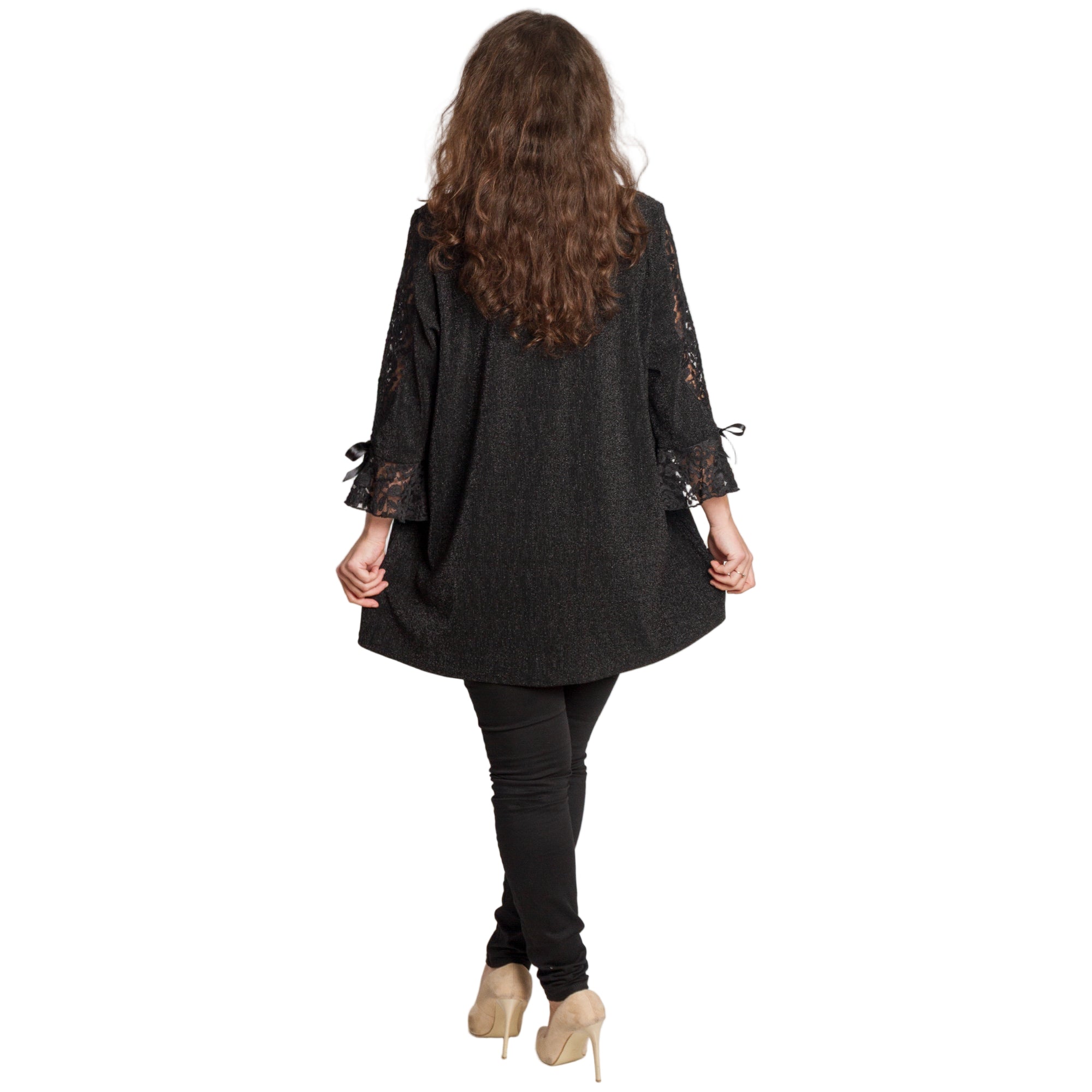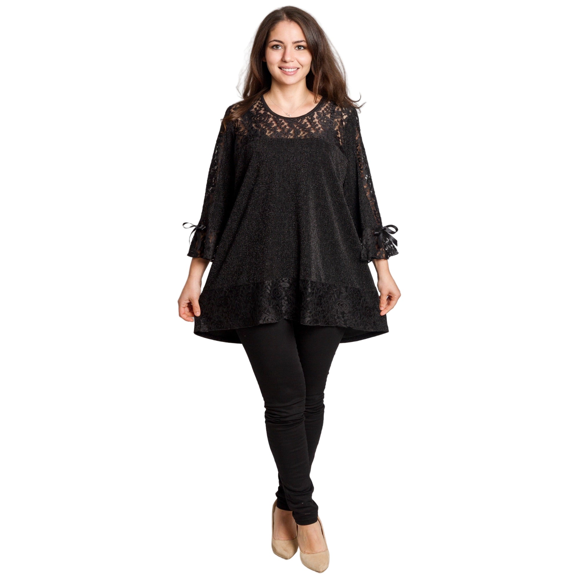 Луксозна черна туника, създадена за дами в големи размери, които искат да изглеждат впечатляващо и елегантно. Горната част и ръкавите са изработени от фина дантела с красив флорален мотив и лека прозрачност, която придава изтънчен и празничен вид. Материята е еластична и удобна, с деликатен брокатен отблясък, който подчертава женствеността. Свободната кройка пада плавно по тялото и прикрива нежеланите зони, като осигурява комфорт през целия ден или вечер. Подходяща за официални поводи през есенно-зимния сезон.