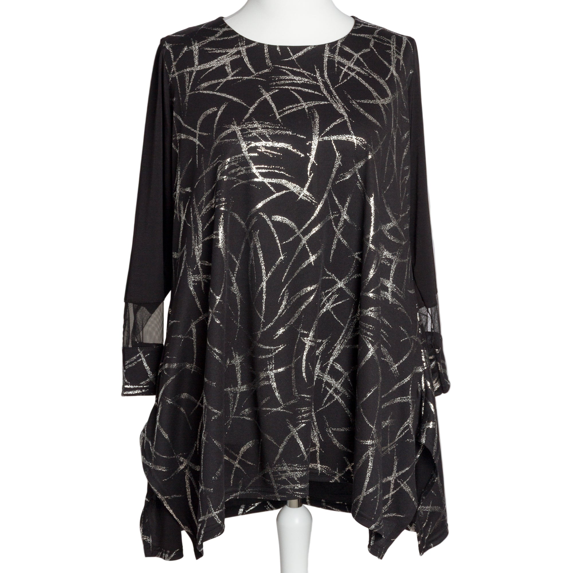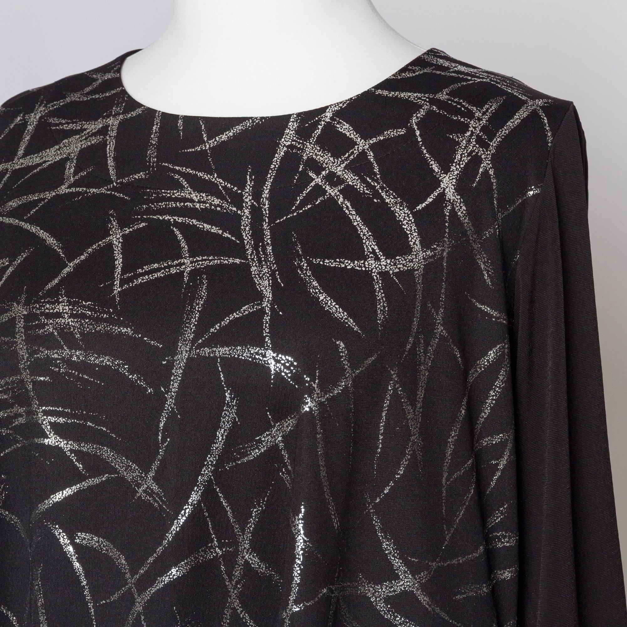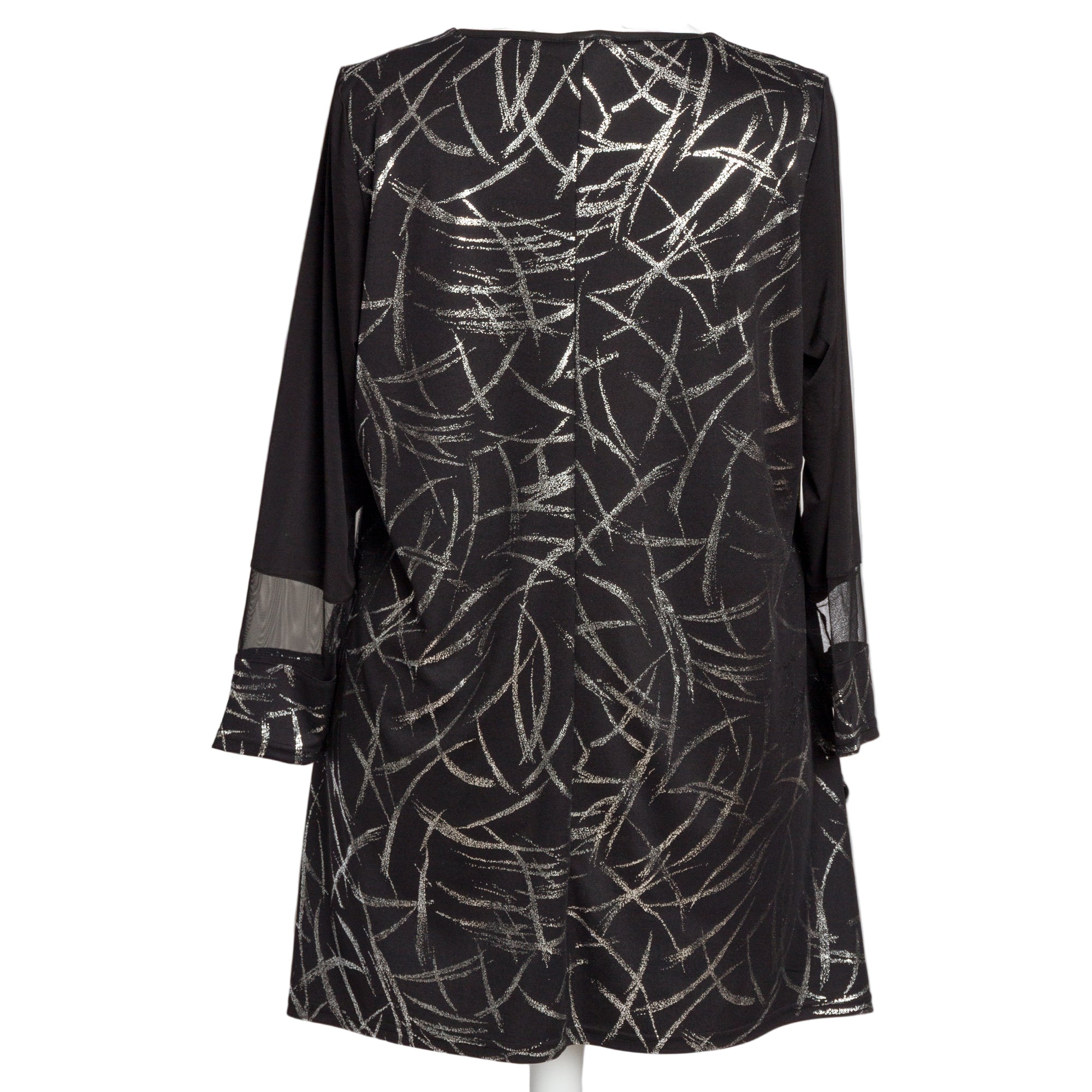 Тази елегантна черна туника в големи размери е перфектният избор за специални поводи през есенно-зимния сезон. Меката и еластична материя с фина лъскава нишка създава изискан вид, а свободната разкроена кройка осигурява комфорт и стил. Облото деколте и дългите ръкави с декоративни прозрачни елементи придават на модела допълнителна женственост и класа. Подходяща е за официални вечери, празнични събития или елегантна визия в ежедневието.