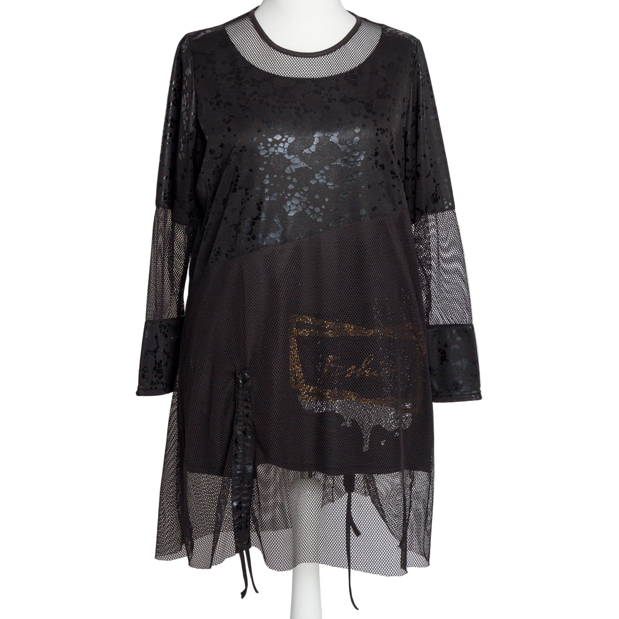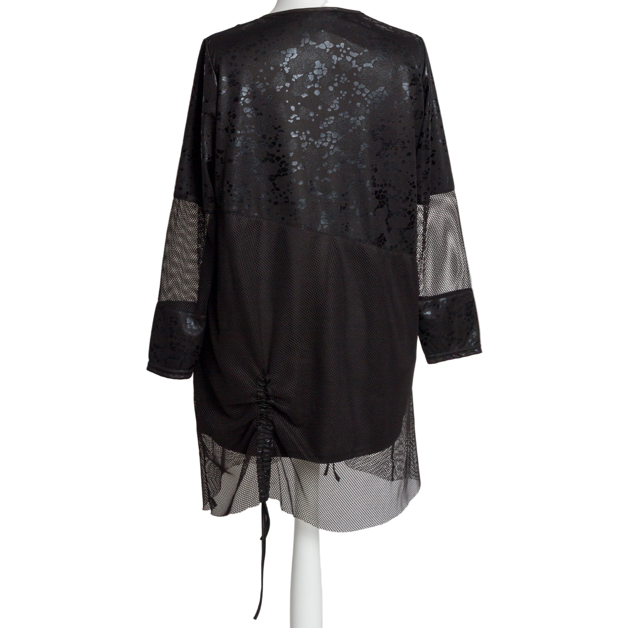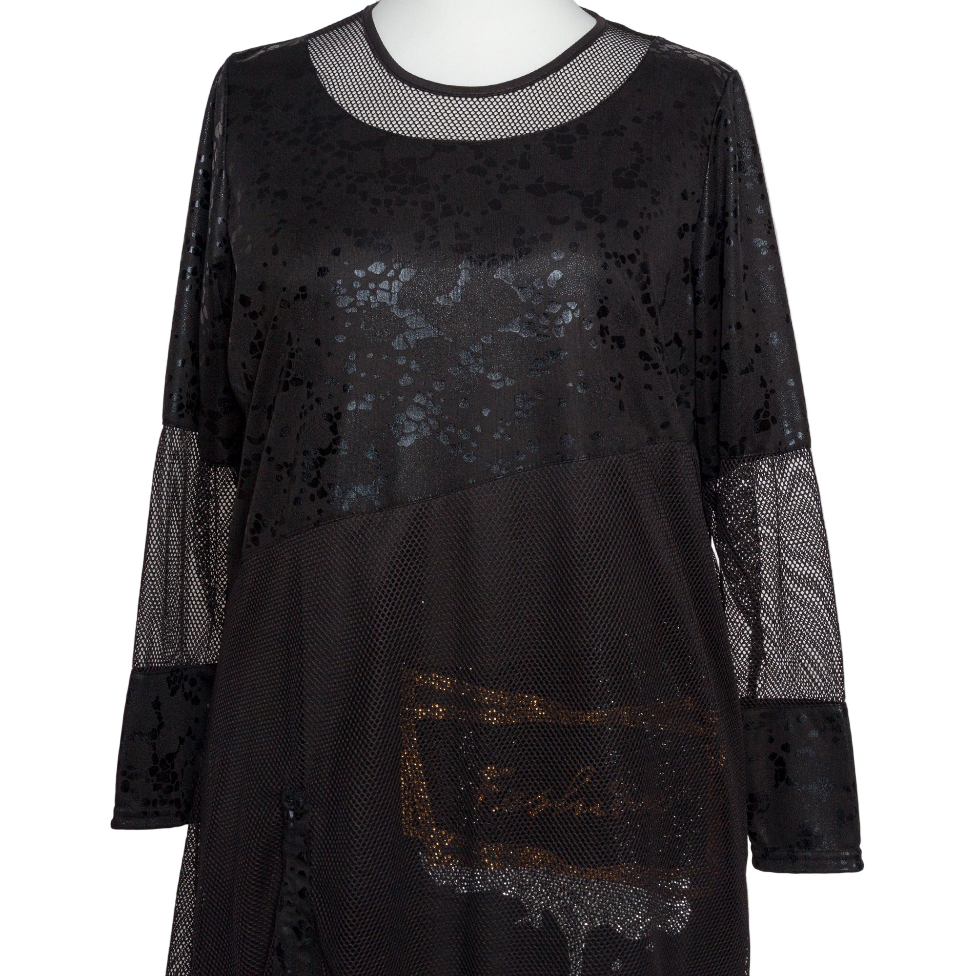 Тази модерна черна туника в големи размери впечатлява с уникален дизайн и интересна комбинация от материи. Горната част е изработена от гланцов плат с ефект на релефни петна, а долната – от фина мрежа, която придава лекота и съвременен вид. Дългите ръкави са частично прозрачни, а декоративните връзки отпред добавят стилен детайл. Разкроената кройка осигурява свобода на движение и комфорт, докато кръглото деколте подчертава елегантно шията. Подходяща е за официални поводи и вечерни излизания през есенно-зимния сезон.