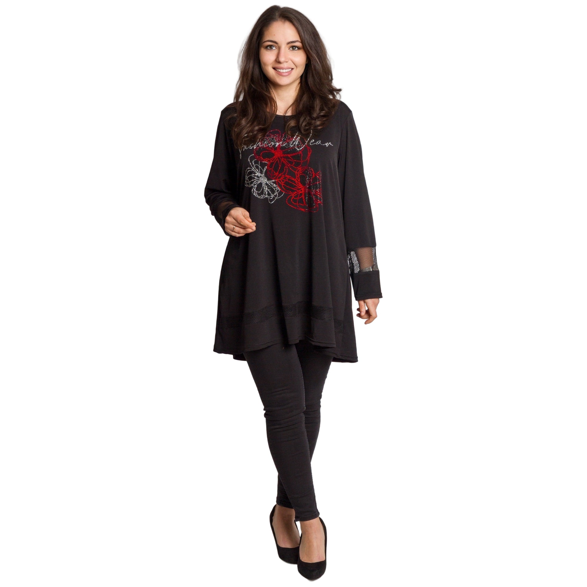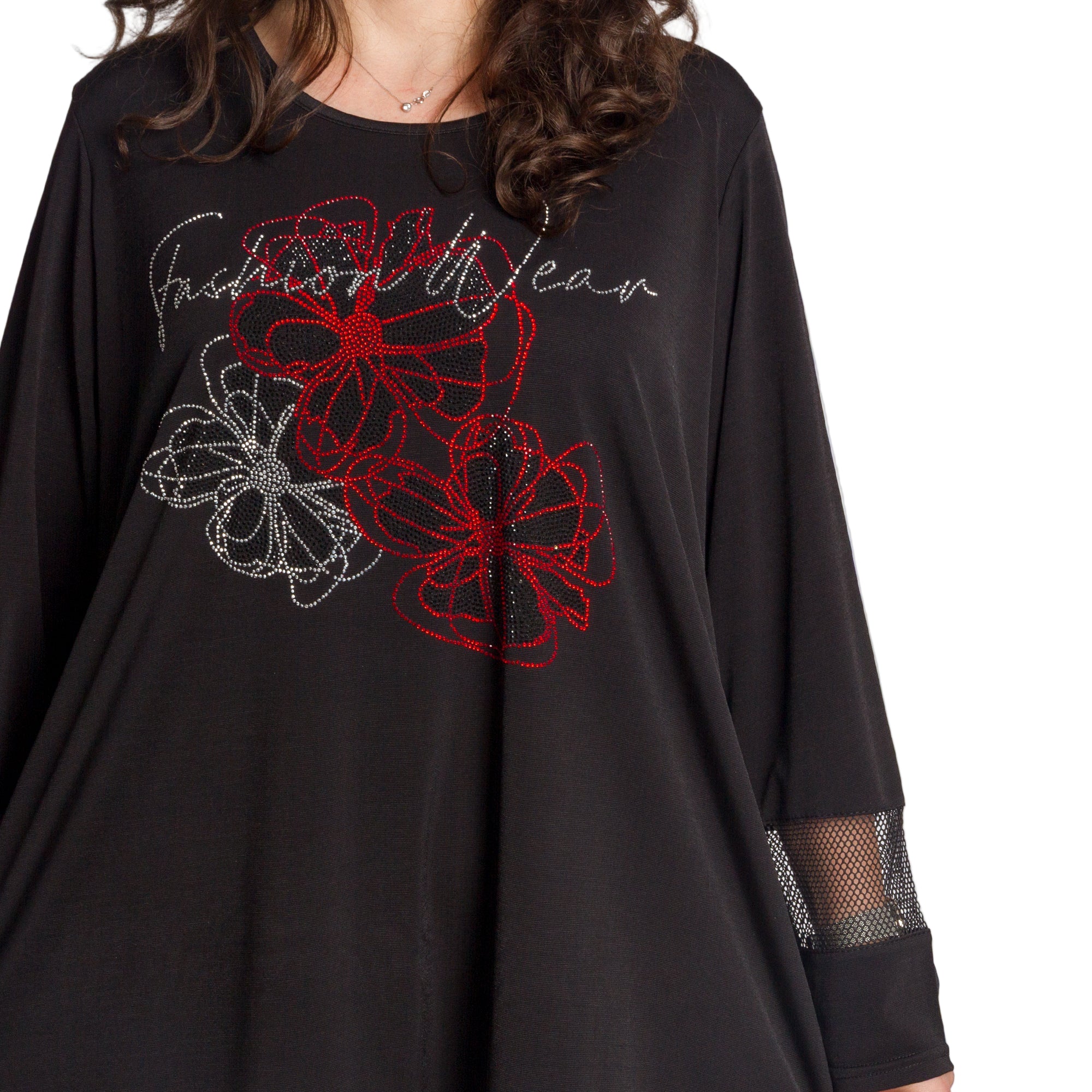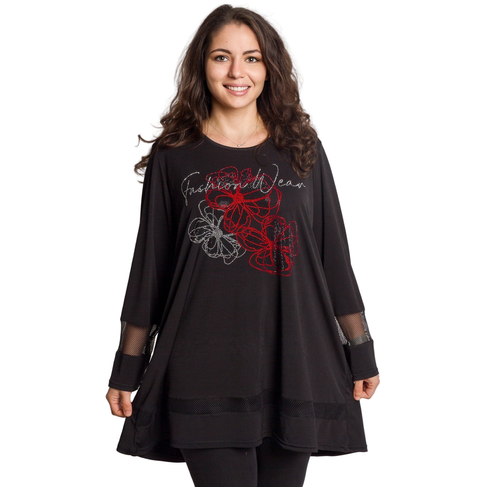 Тази елегантна черна туника е създадена специално за жени, които искат да съчетаят комфорт и стил. Меката и еластична материя пада красиво по силуета и осигурява свобода на движение през целия ден. Декоративните камъни отпред оформят стилен флорален мотив в червено и бяло, който придава изтънчена визия без излишна натрапчивост. Мрежестите декоративни елементи в долната част и по ръкавите добавят модерен и ефектен завършек. Моделът е подходящ както за ежедневието, така и за по-официални събития — достатъчно универсален, за да се комбинира с дънки, панталон или пола. Материята е с лека еластичност и е съобразена с нуждите на плюс сайз силуета, като пада свободно и не очертава.