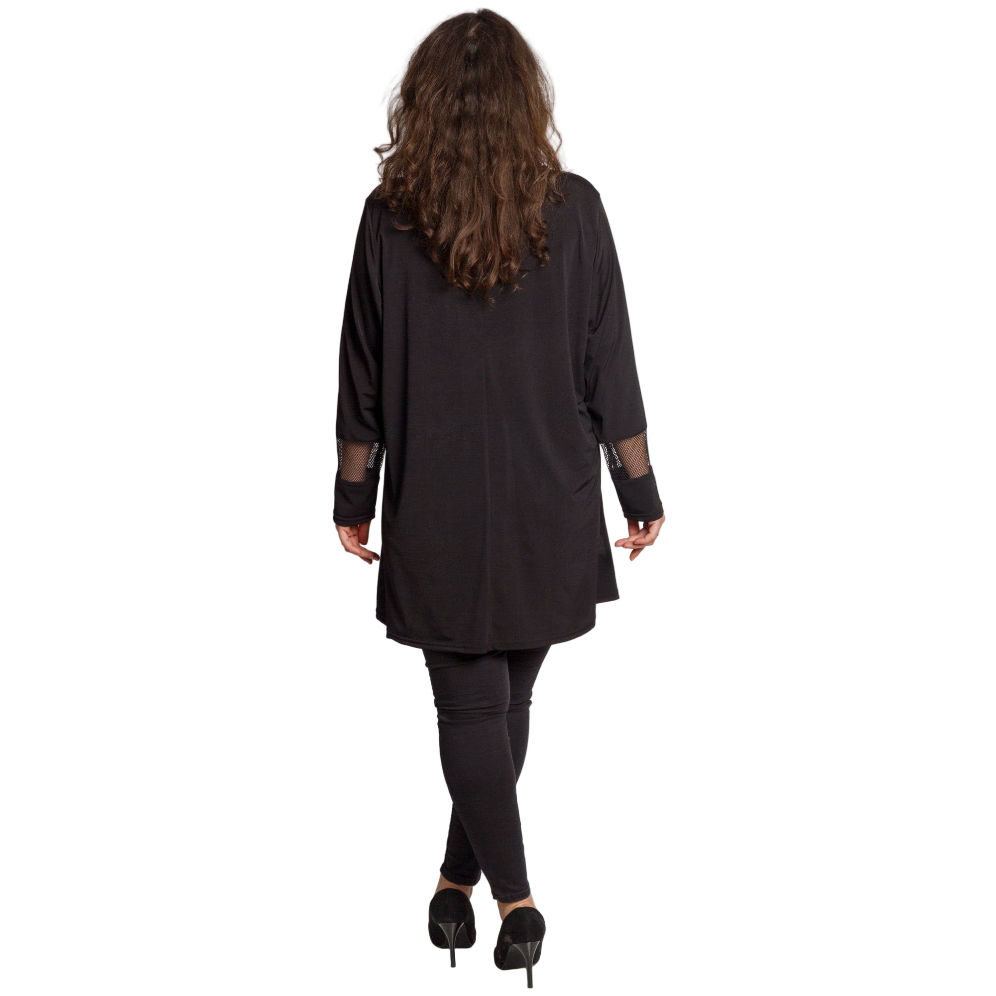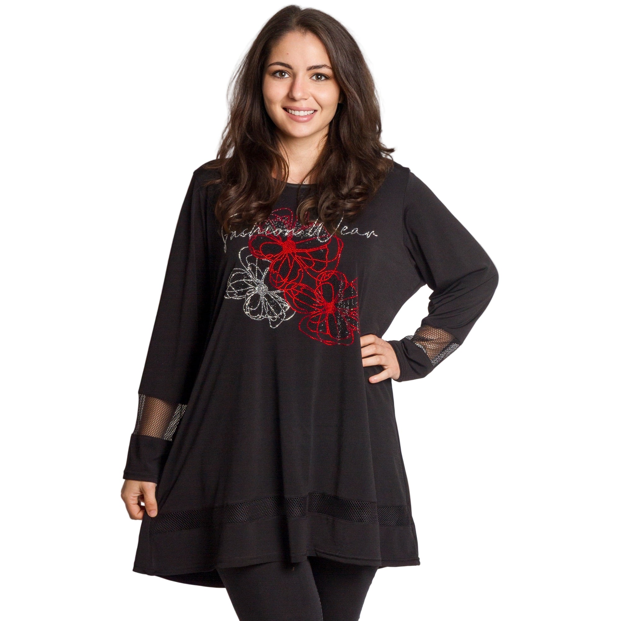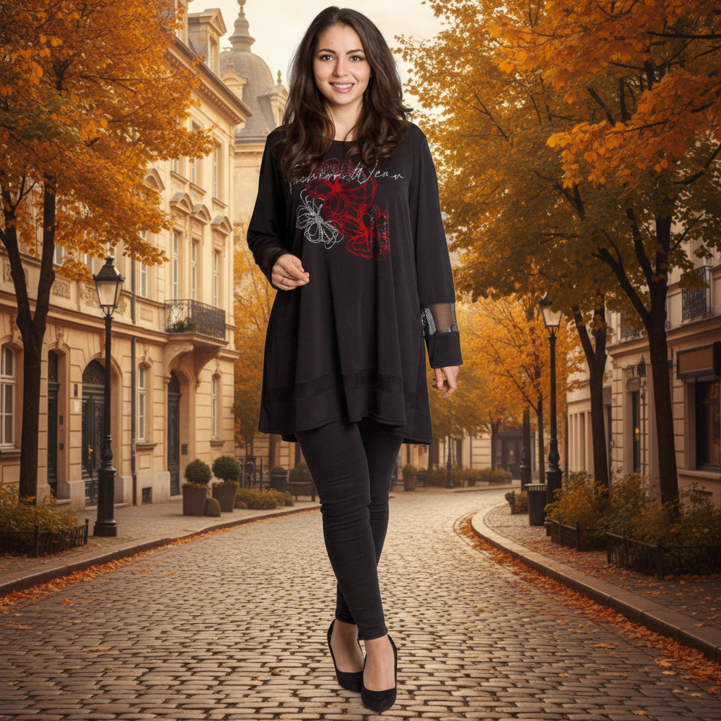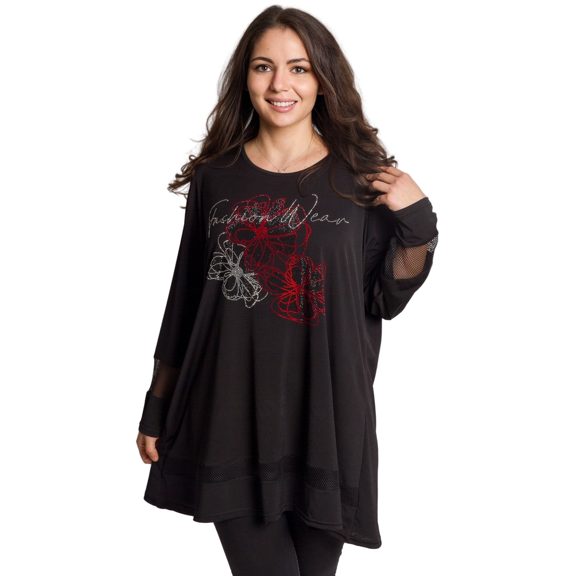 Тази елегантна черна туника е създадена специално за жени, които искат да съчетаят комфорт и стил. Меката и еластична материя пада красиво по силуета и осигурява свобода на движение през целия ден. Декоративните камъни отпред оформят стилен флорален мотив в червено и бяло, който придава изтънчена визия без излишна натрапчивост. Мрежестите декоративни елементи в долната част и по ръкавите добавят модерен и ефектен завършек. Моделът е подходящ както за ежедневието, така и за по-официални събития — достатъчно универсален, за да се комбинира с дънки, панталон или пола. Материята е с лека еластичност и е съобразена с нуждите на плюс сайз силуета, като пада свободно и не очертава.