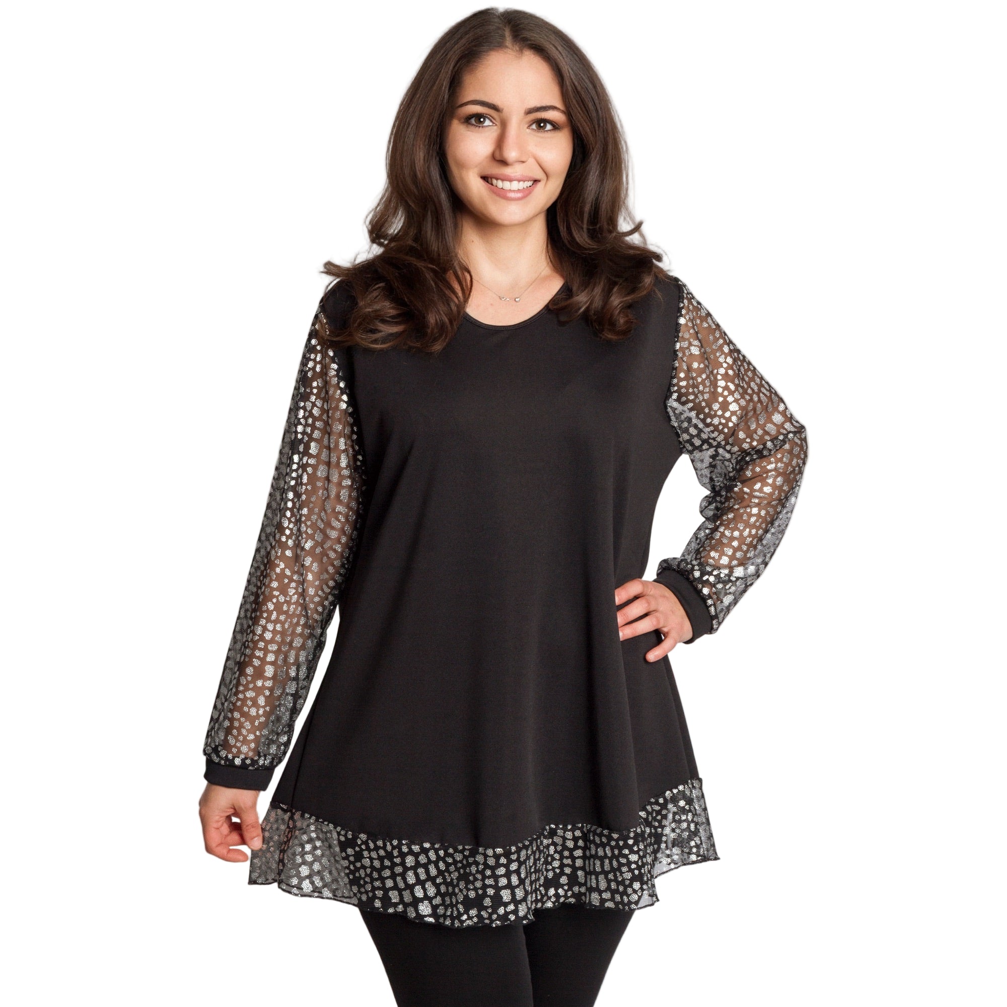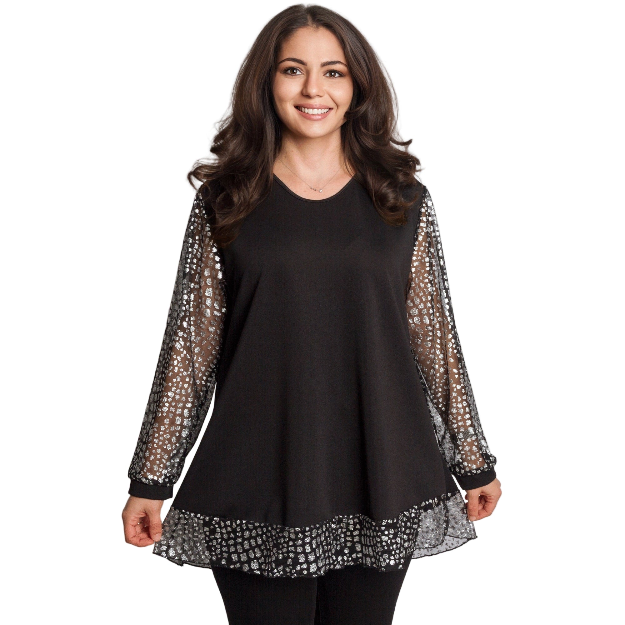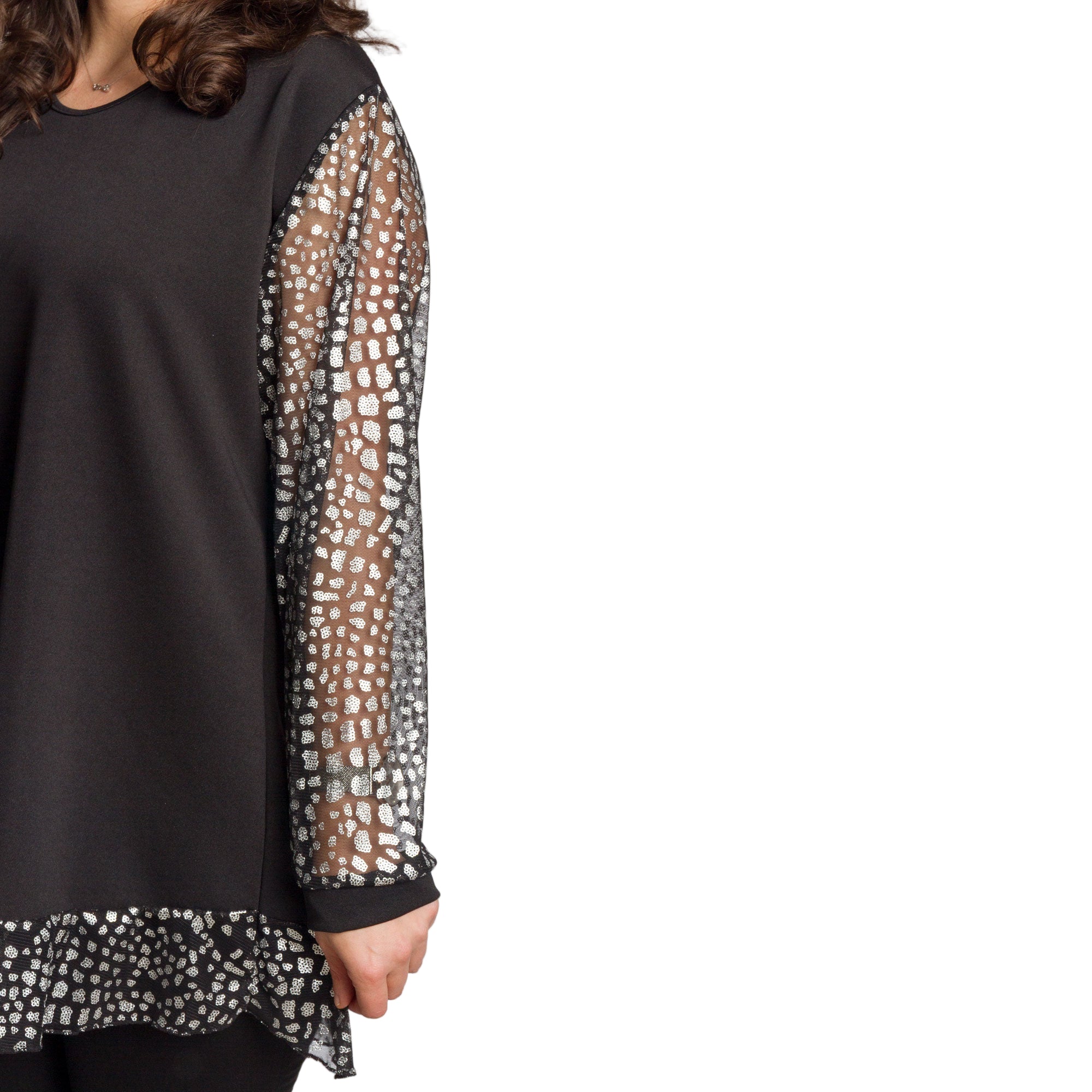 Елегантна черна туника, създадена за жени в големи размери, които търсят стил, комфорт и изисканост в една дреха. Основата е изчистена и свободно падаща, като осигурява лекота и прикрива коремната и ханшовата зона. Ръкавите и долният кант са изработени от ефирен тюл със сребрист декоративен принт, който придава луксозен акцент и прави модела подходящ за официални поводи, празнични вечери и специални събития. Облото деколте подчертава деликатно зоната на шията, а разкроената кройка създава красив и издължаващ силует. Туниката се комбинира лесно с панталон или клин и е страхотен избор за модерна и уверена визия.