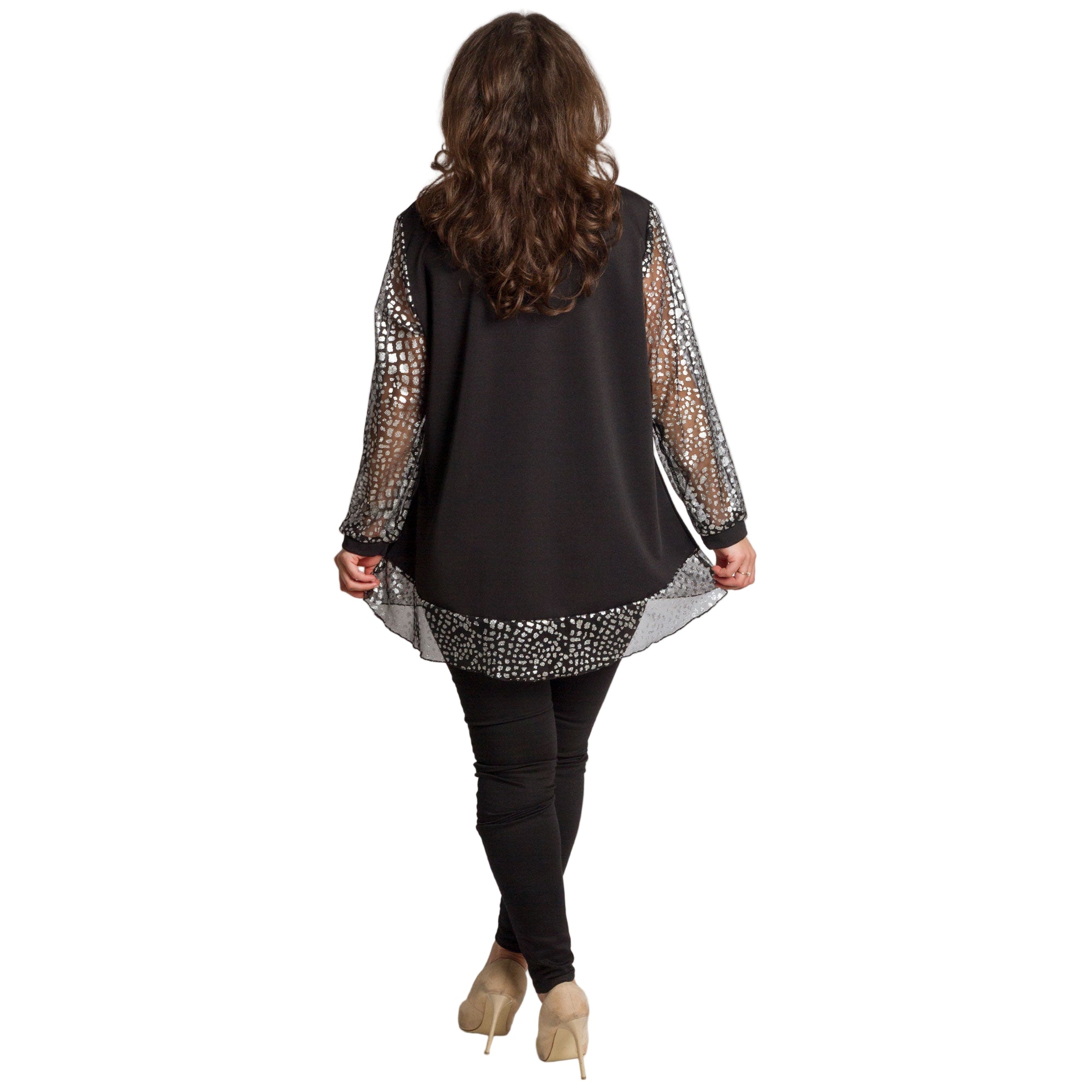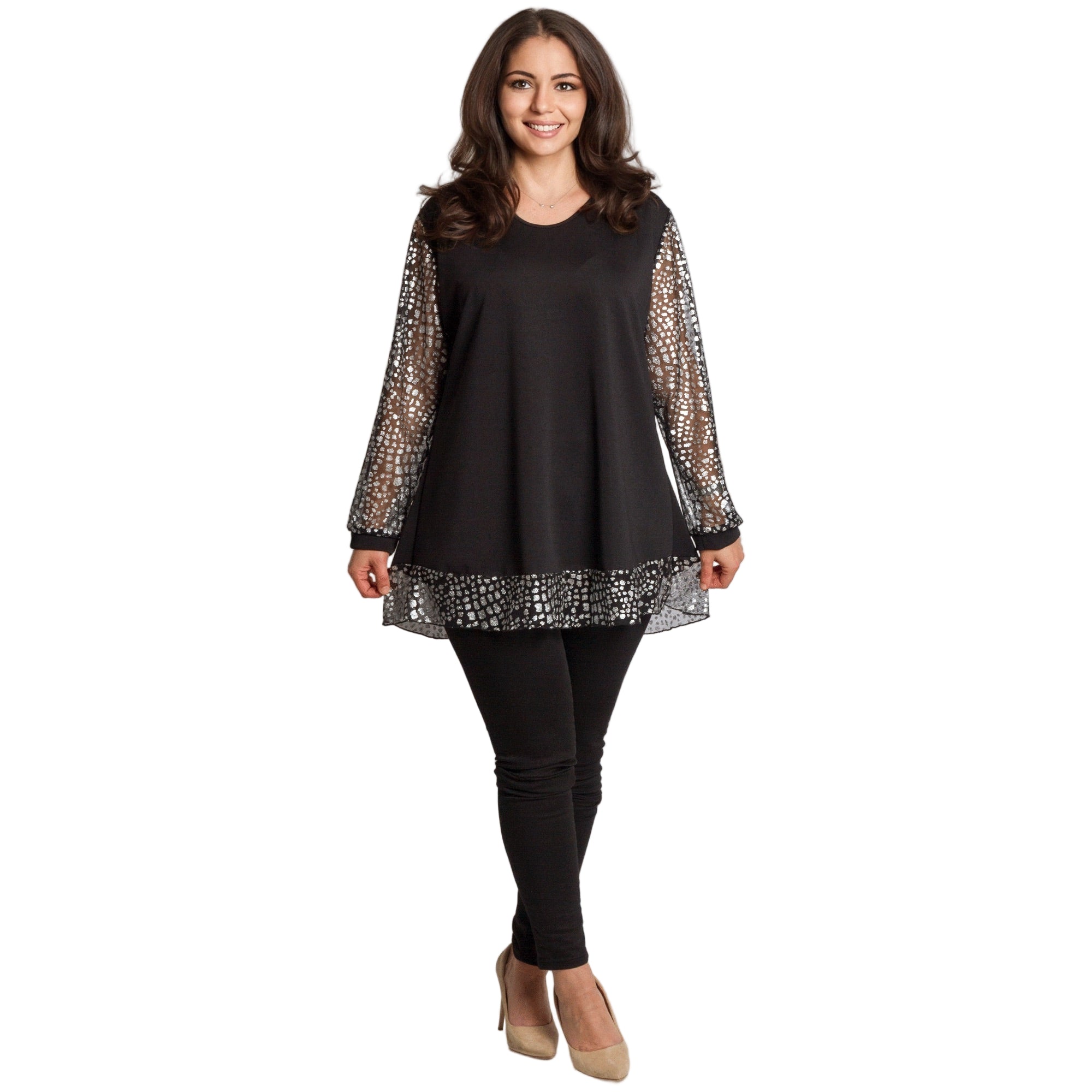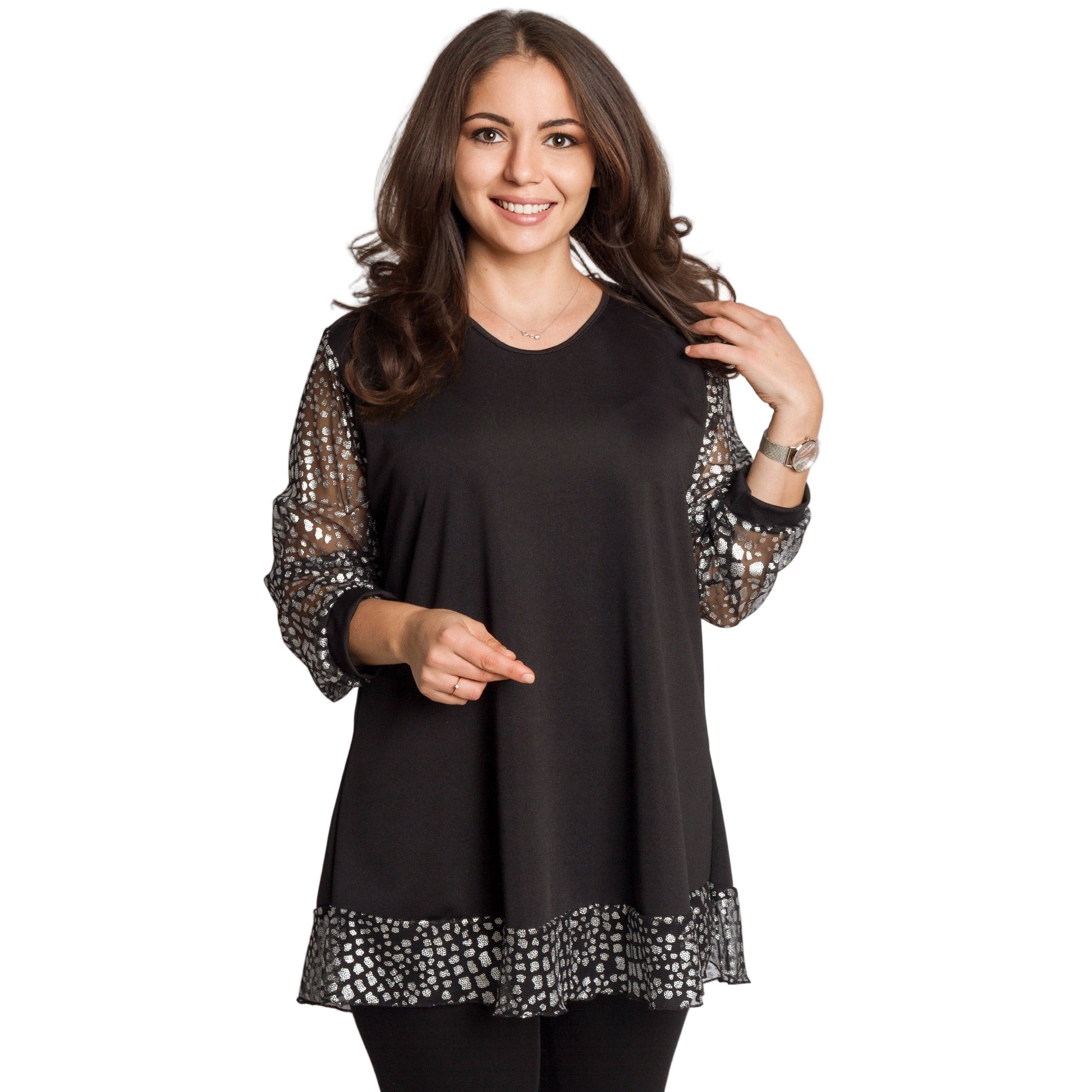 Елегантна черна туника, създадена за жени в големи размери, които търсят стил, комфорт и изисканост в една дреха. Основата е изчистена и свободно падаща, като осигурява лекота и прикрива коремната и ханшовата зона. Ръкавите и долният кант са изработени от ефирен тюл със сребрист декоративен принт, който придава луксозен акцент и прави модела подходящ за официални поводи, празнични вечери и специални събития. Облото деколте подчертава деликатно зоната на шията, а разкроената кройка създава красив и издължаващ силует. Туниката се комбинира лесно с панталон или клин и е страхотен избор за модерна и уверена визия.