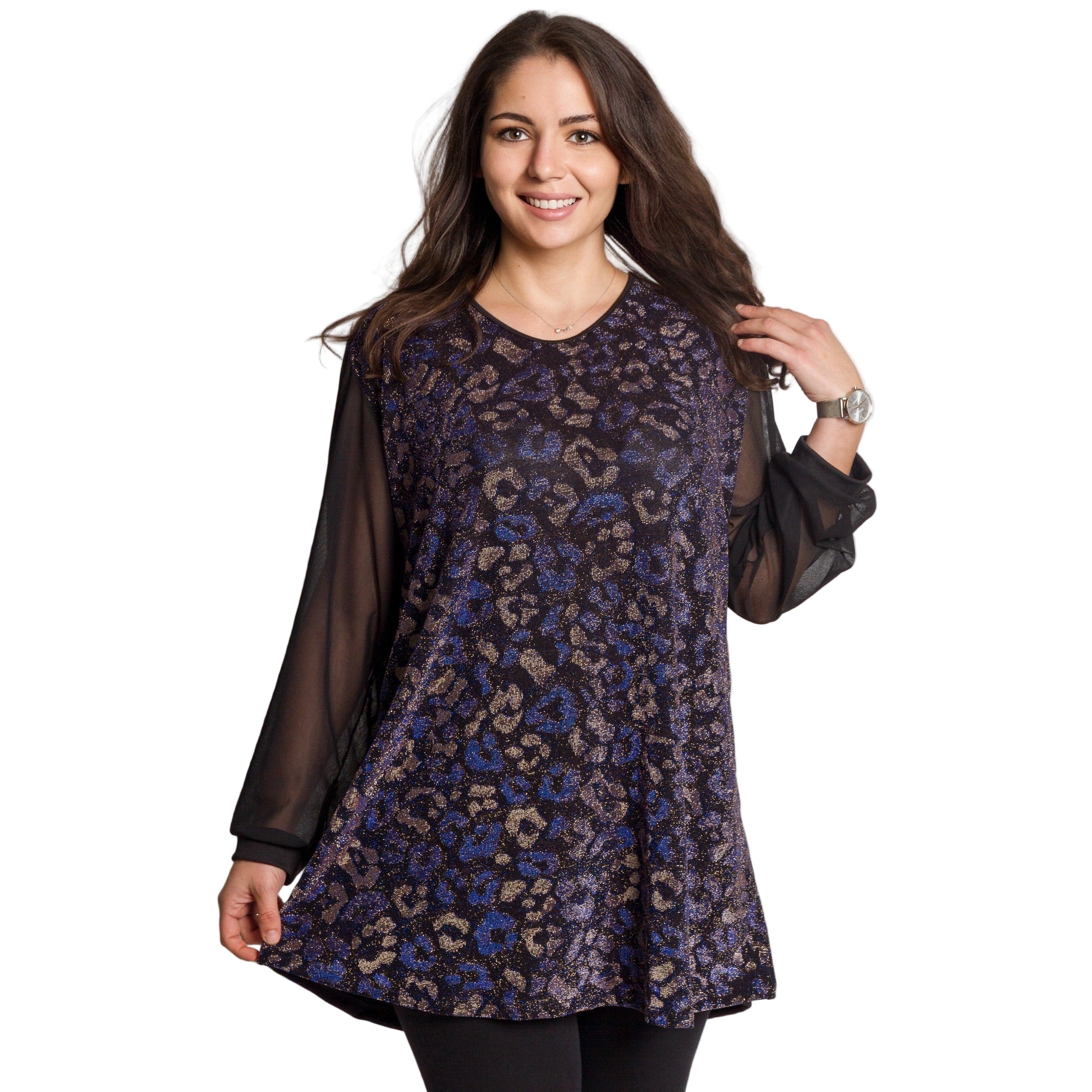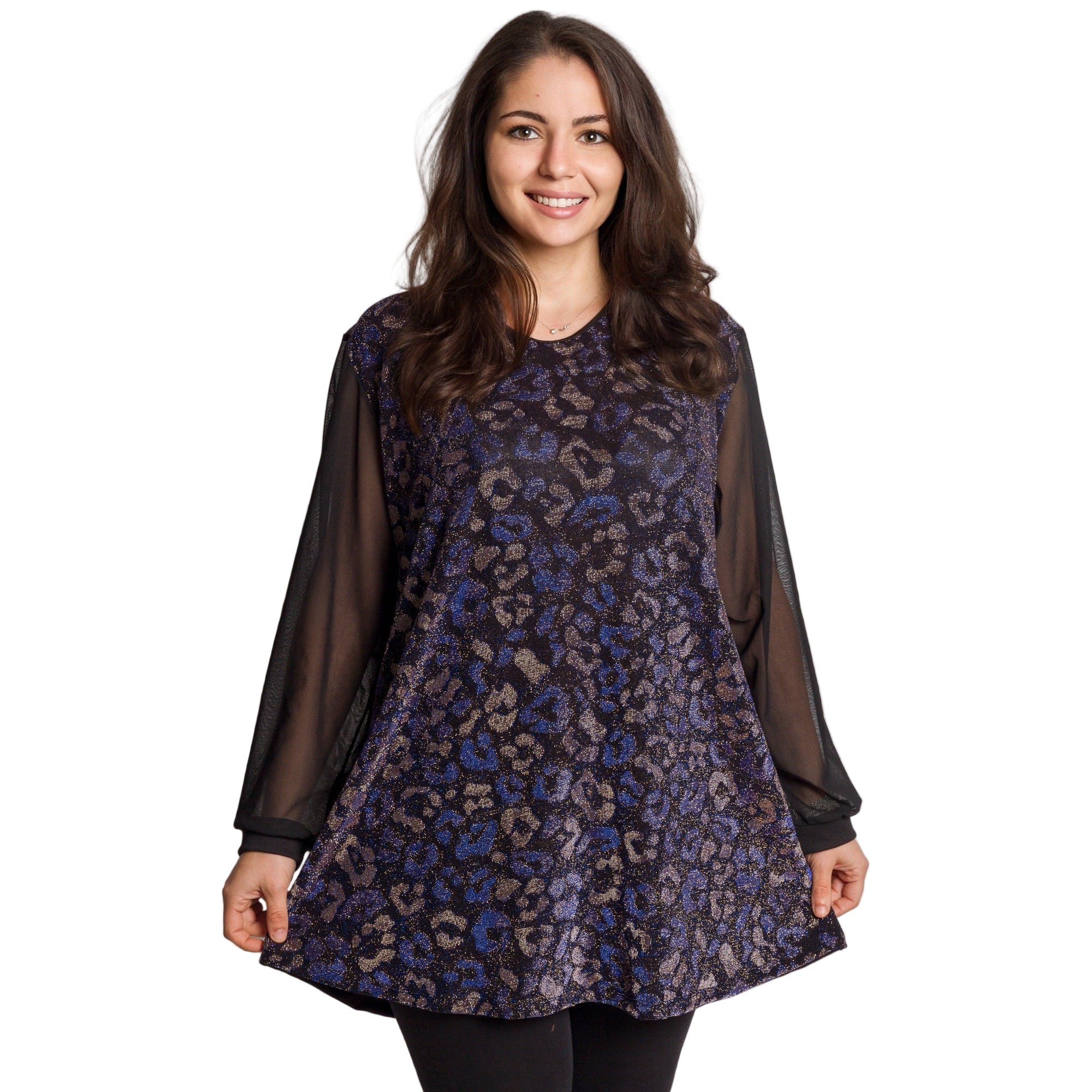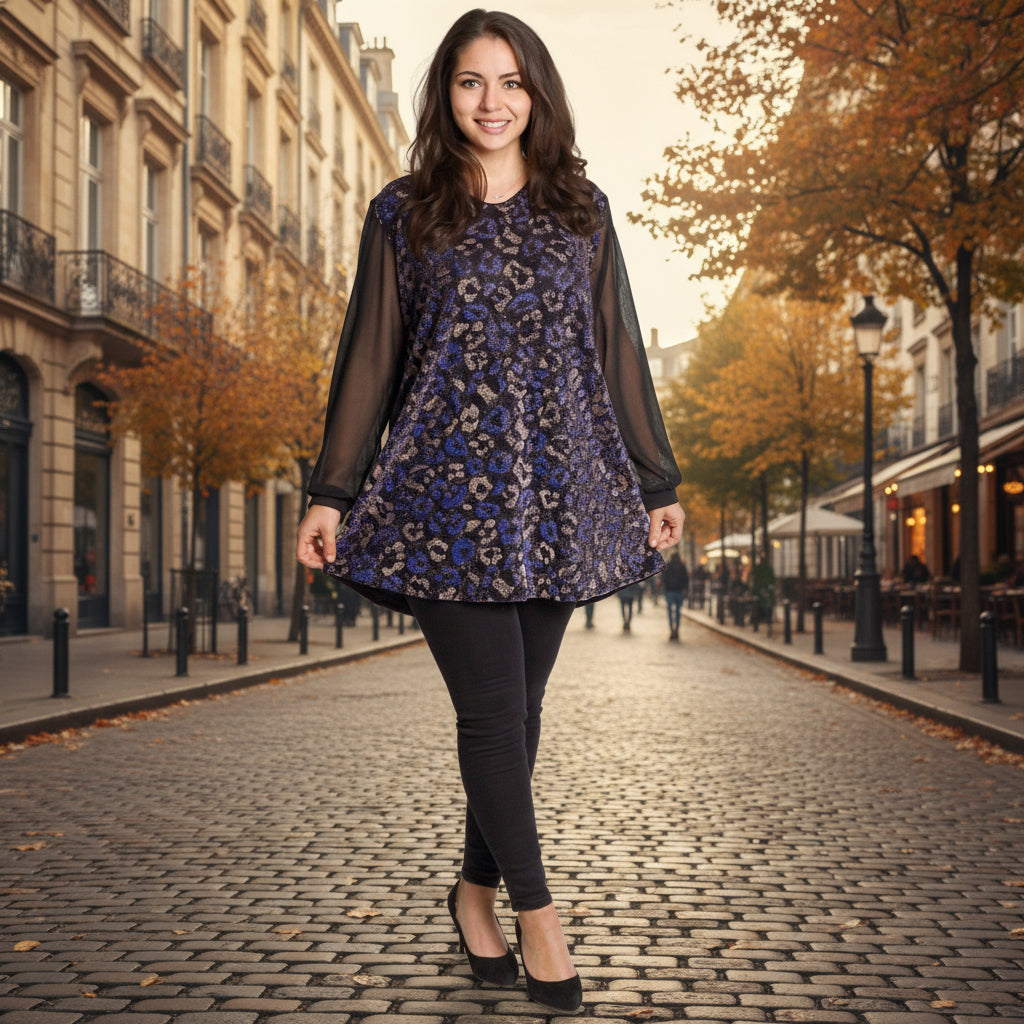 Тази елегантна туника в макси размери комбинира комфорт и изтънчен стил. Изработена от 100% вискоза, тя е лека, мека и приятно пада по тялото, без да очертава формите. Блестящият животински мотив в лилаво и бронзово добавя акцент, който прави модела подходящ както за ежедневието, така и за официални поводи. Свободната кройка осигурява леко и удобно усещане, а обло деколте визуално издължава силуета. Туниката може да се комбинира както с класически панталон, така и с клин или пола за по-елегантна визия.