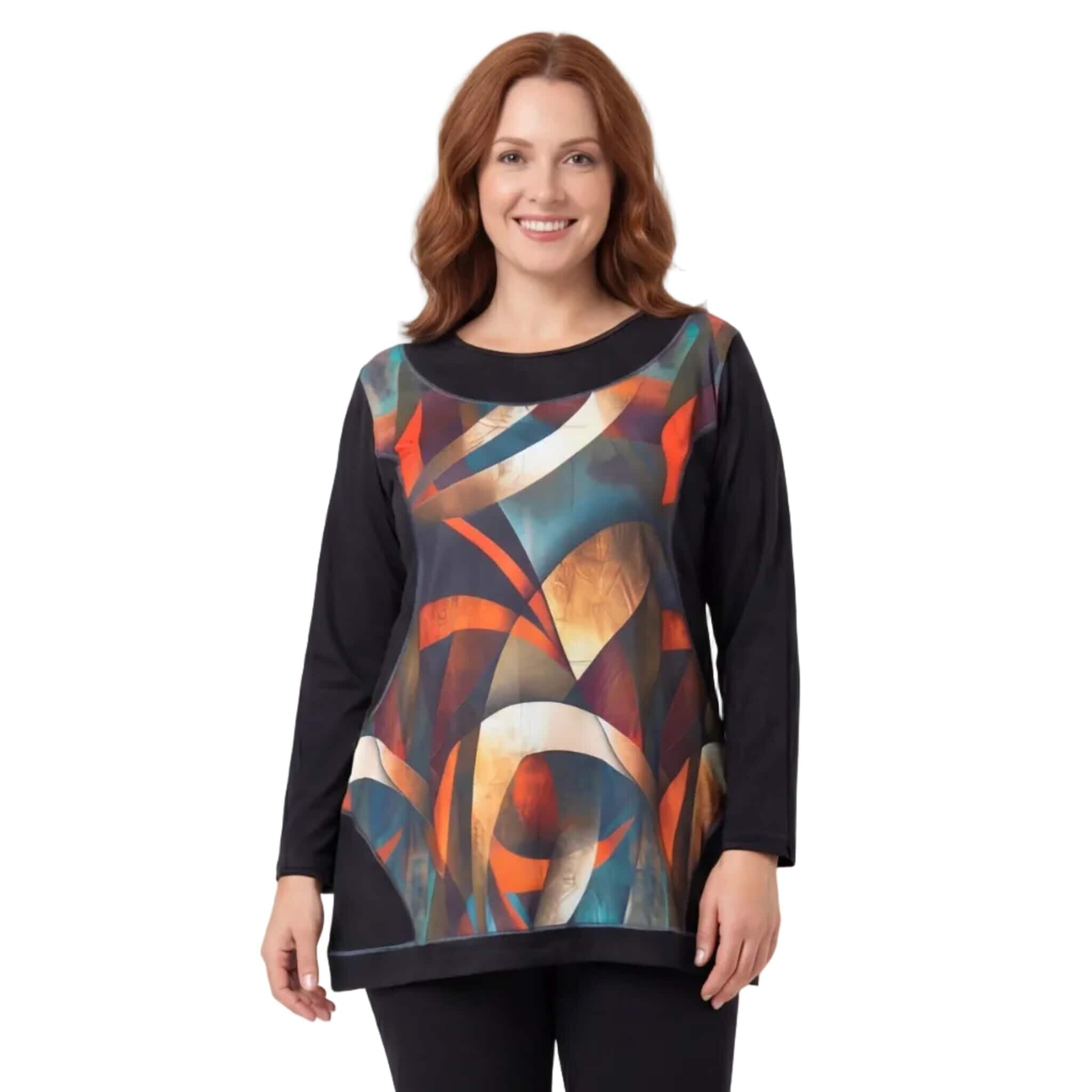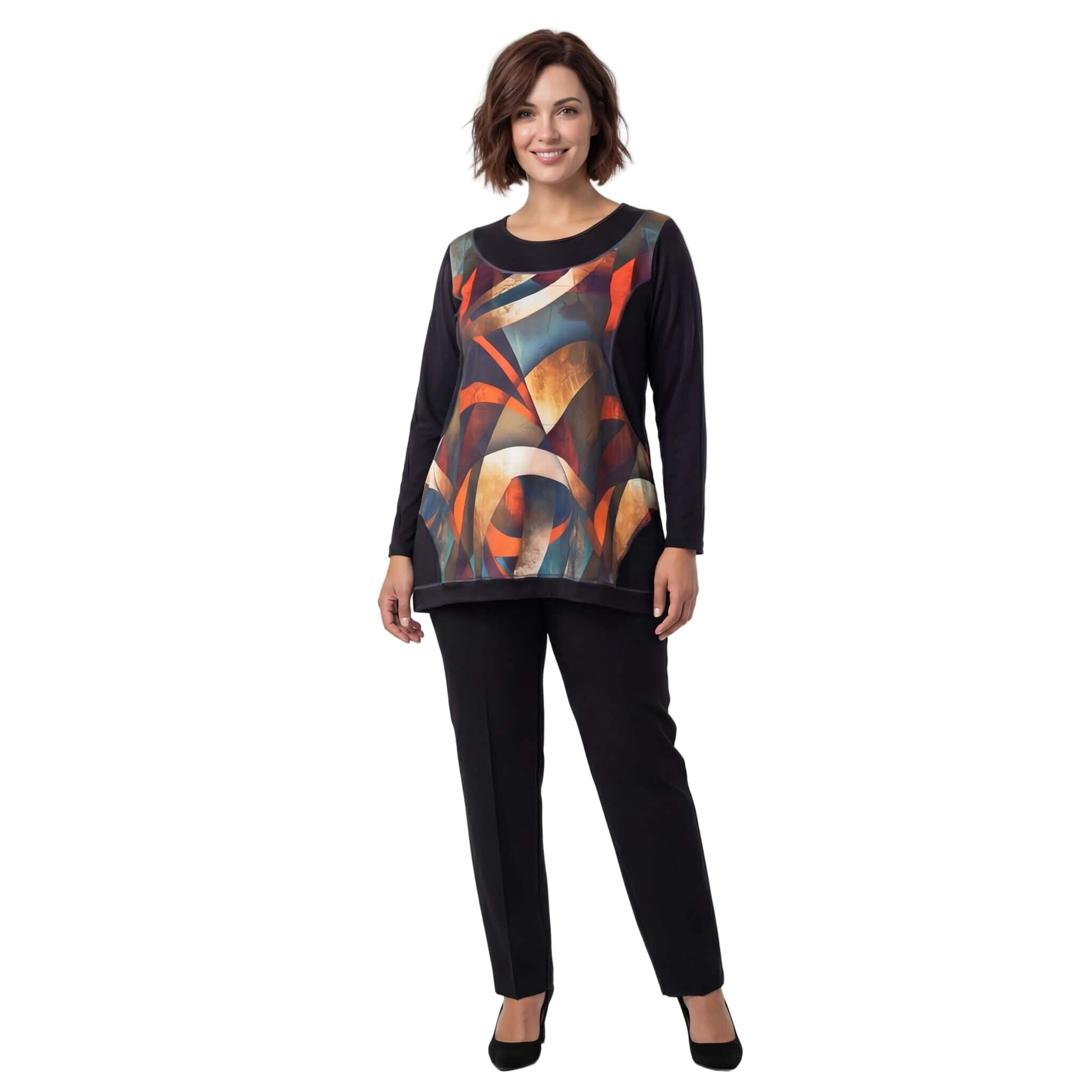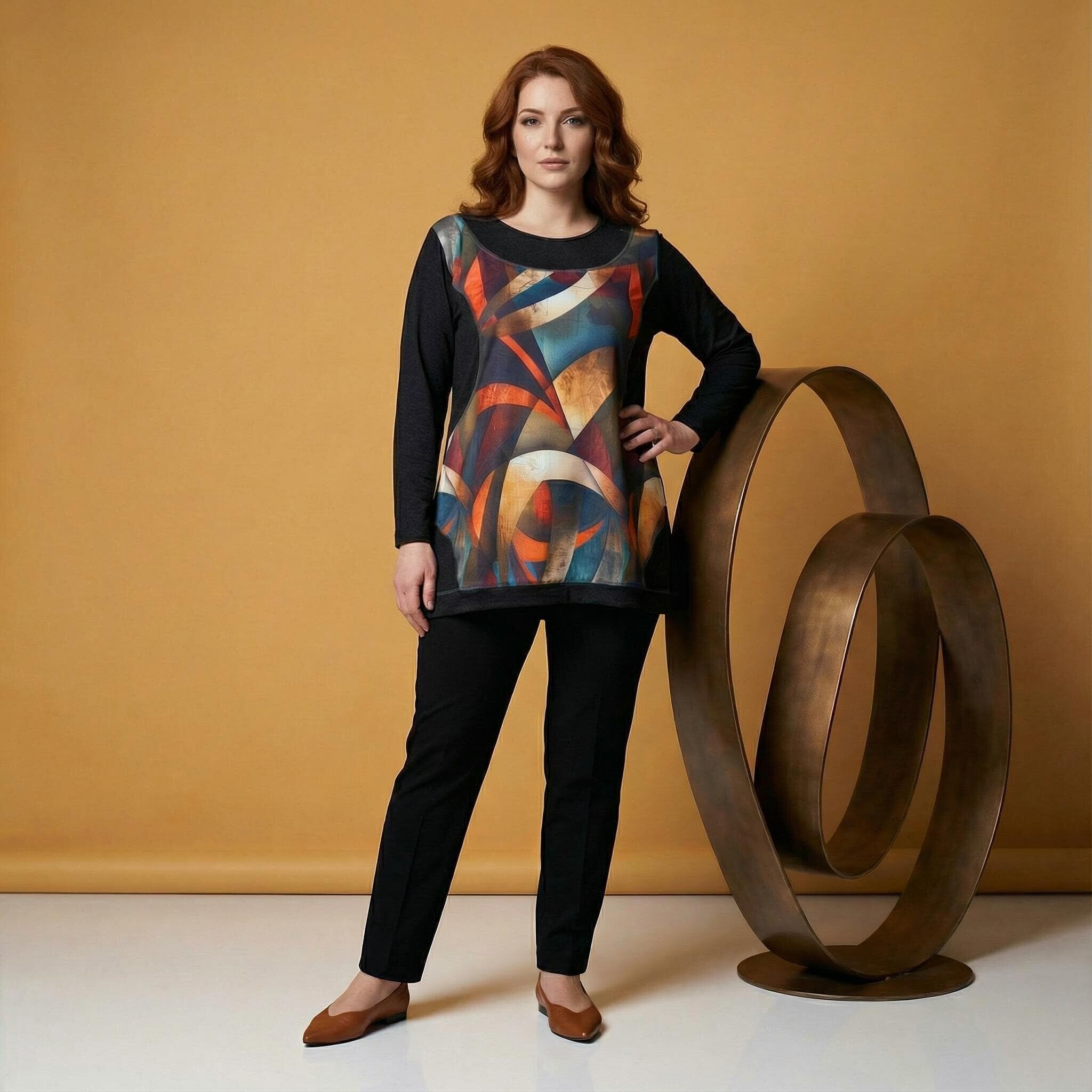 Открийте идеалния баланс между изкуство и мода с нашата нова есенна туника, създадена специално за дамите с извивки. Този модел е вдъхновен от красотата на цветните витражи и цели да внесе артистичен нюанс и увереност във вашето ежедневие. Черната основа създава изчистен и елегантен силует, докато предният панел с абстрактен принт в топли нюанси на оранжево, тюркоаз и бежово привлича погледа и добавя настроение. Меката и плътна материя пада тежко, а разкроената А-силует кройка осигурява несравним комфорт и свобода на движение, като деликатно следва извивките на тялото. Това е дрехата, която ще ви накара да се чувствате изискана и специална, независимо дали сте в офиса или на вечеря с приятели.