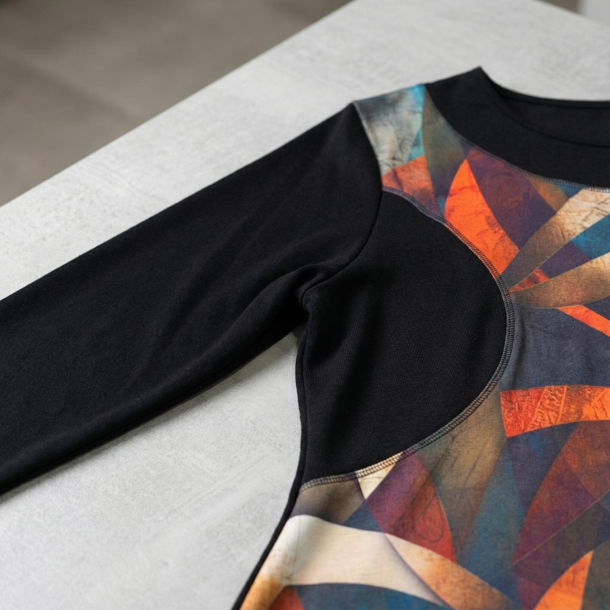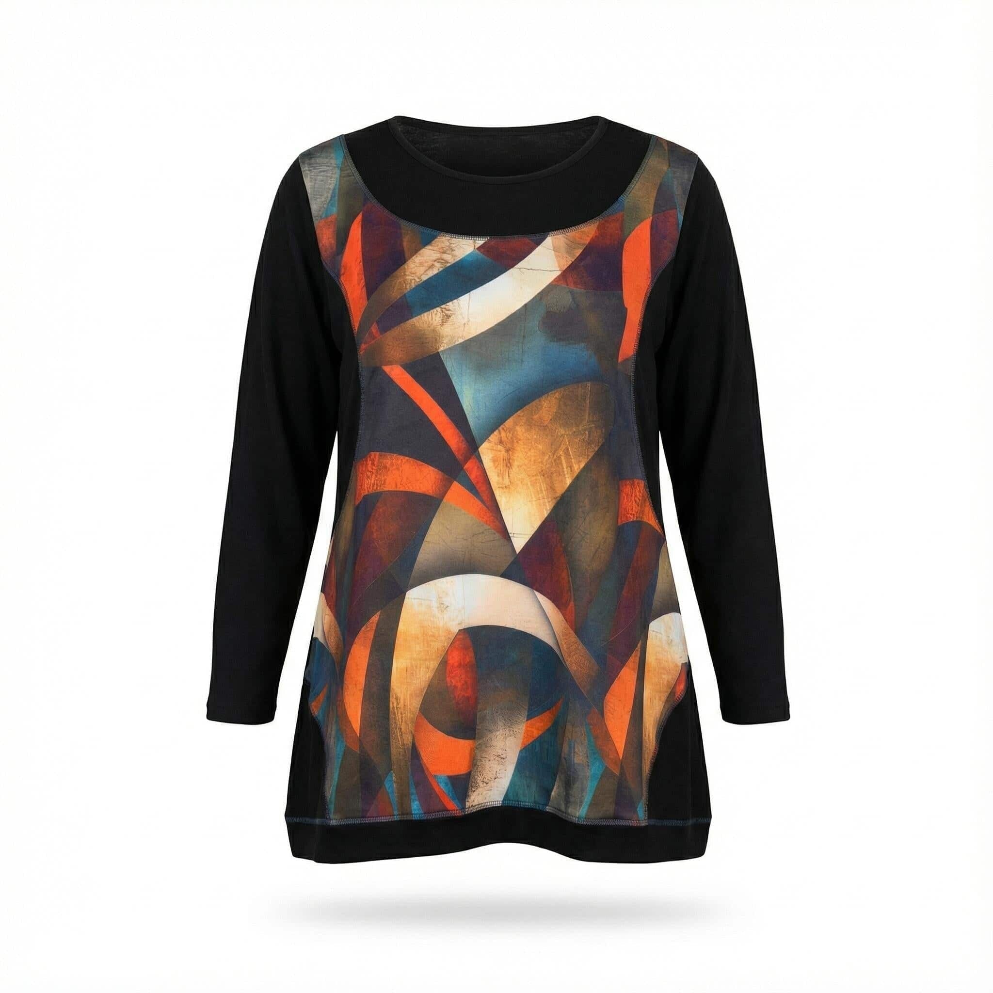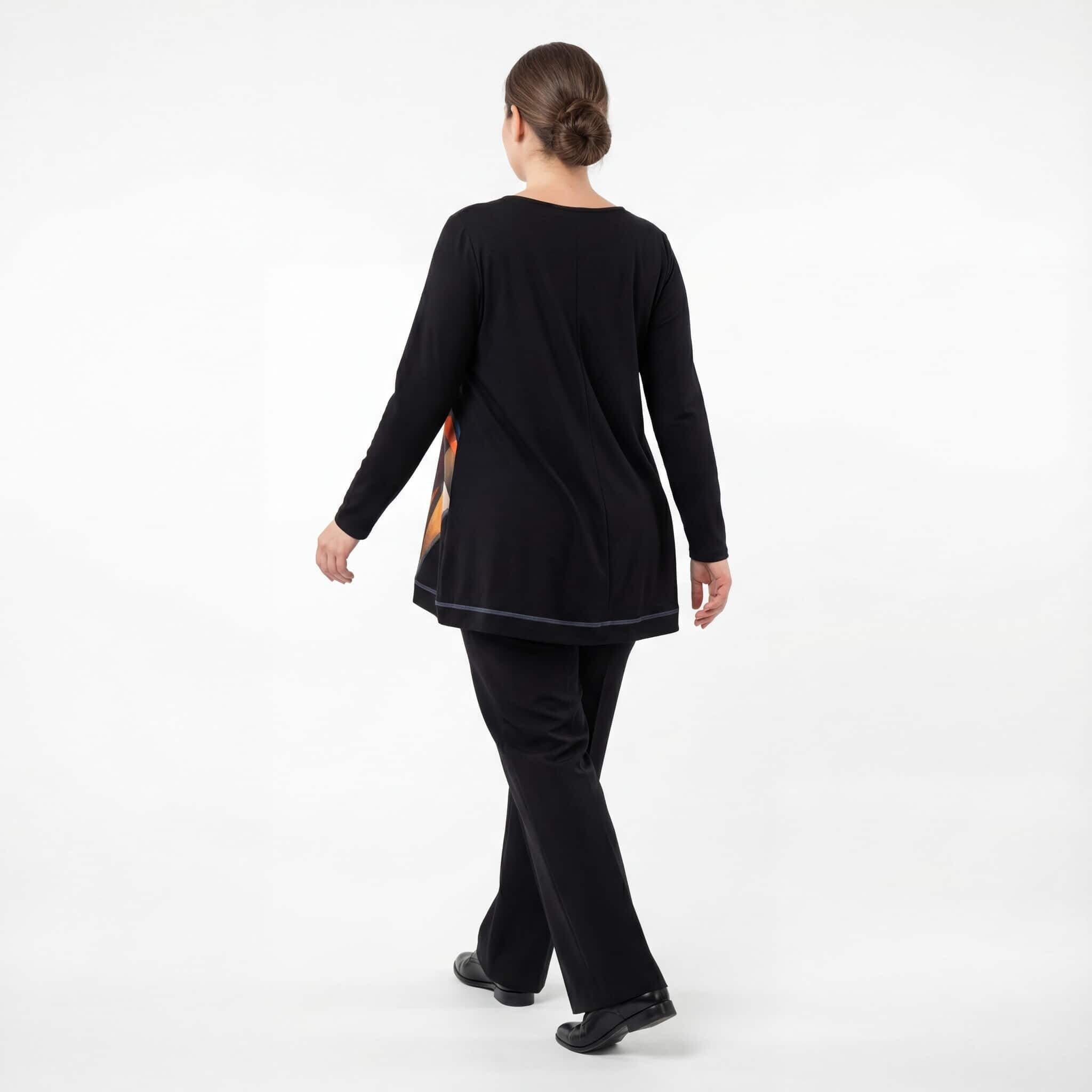 Открийте идеалния баланс между изкуство и мода с нашата нова есенна туника, създадена специално за дамите с извивки. Този модел е вдъхновен от красотата на цветните витражи и цели да внесе артистичен нюанс и увереност във вашето ежедневие. Черната основа създава изчистен и елегантен силует, докато предният панел с абстрактен принт в топли нюанси на оранжево, тюркоаз и бежово привлича погледа и добавя настроение. Меката и плътна материя пада тежко, а разкроената А-силует кройка осигурява несравним комфорт и свобода на движение, като деликатно следва извивките на тялото. Това е дрехата, която ще ви накара да се чувствате изискана и специална, независимо дали сте в офиса или на вечеря с приятели.