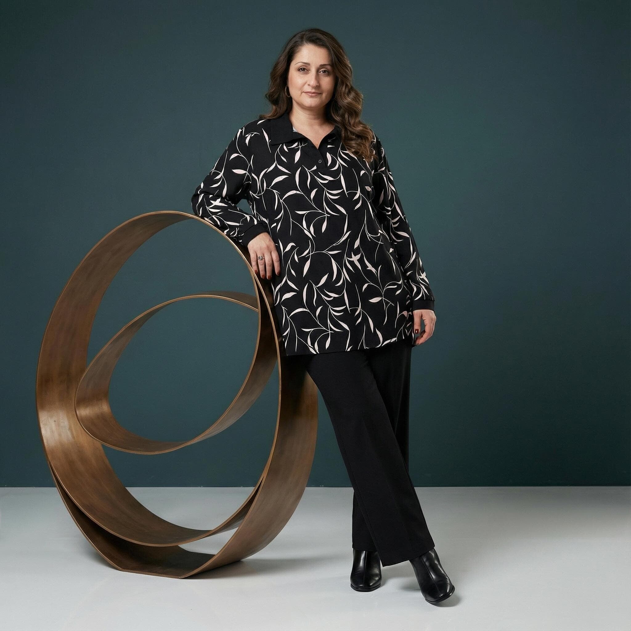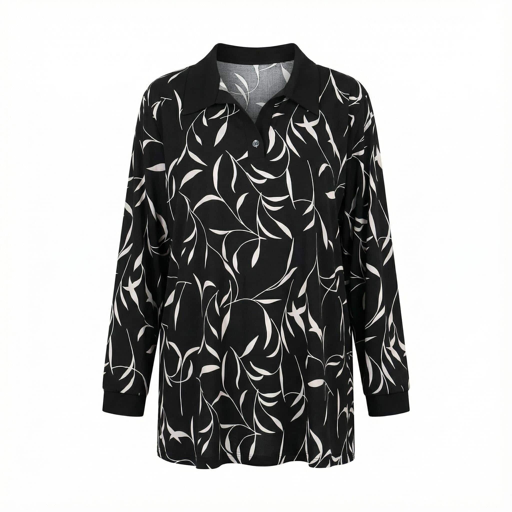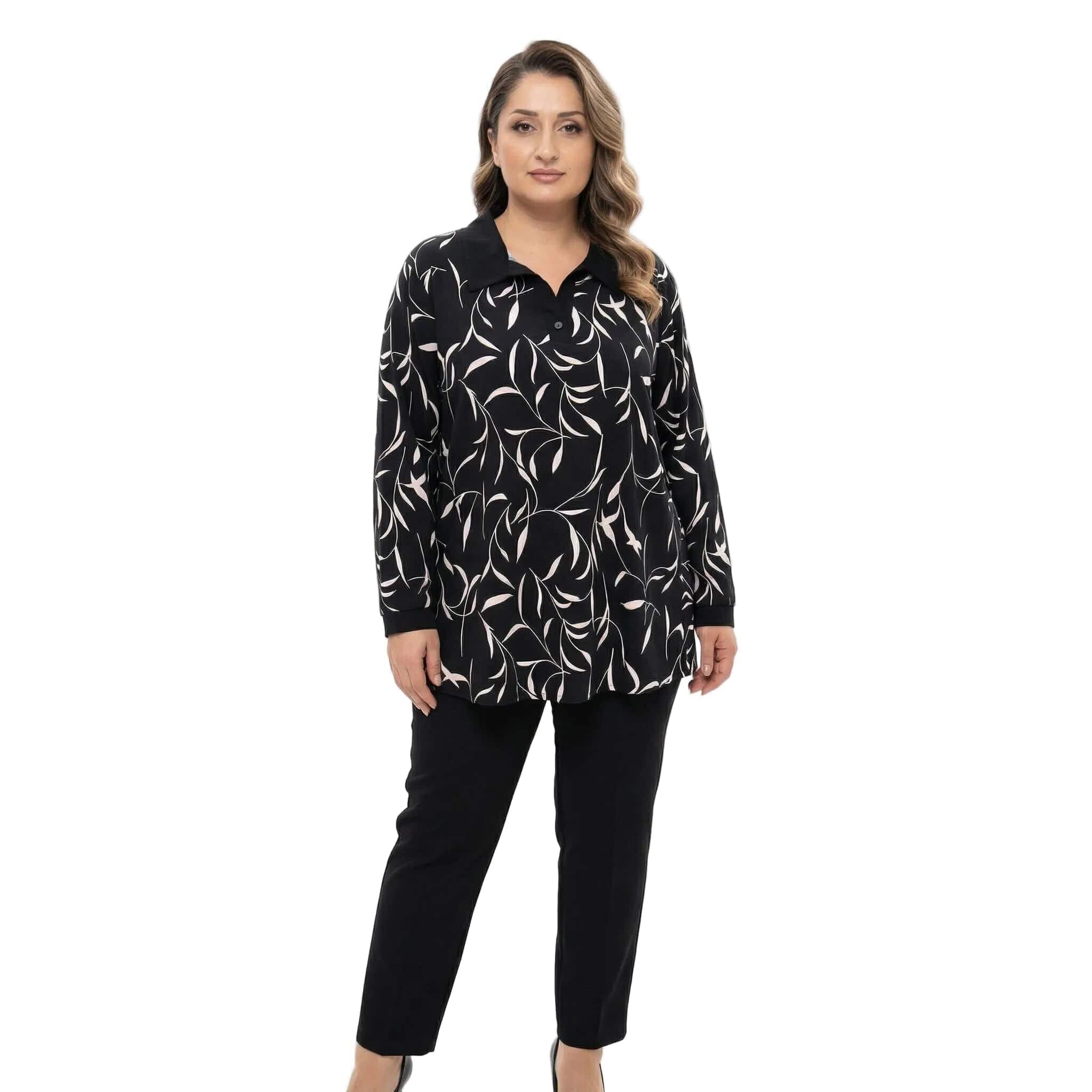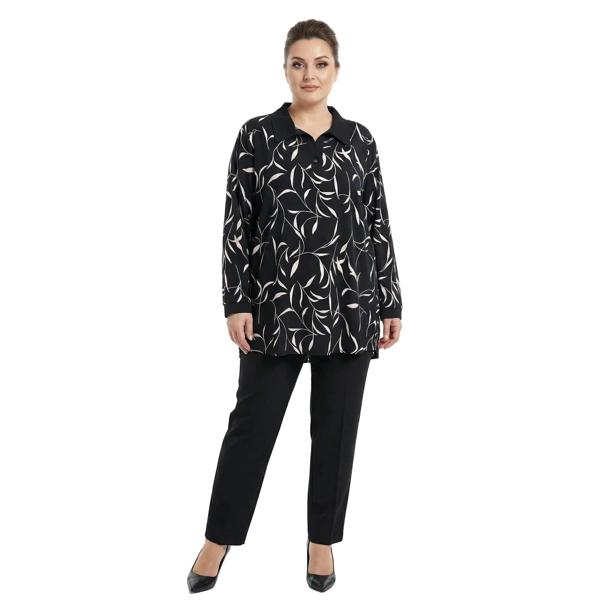 Открий перфектния баланс между изискан стил и безкомпромисен комфорт с нашата нова елегантна туника. Създадена специално за модерната българска дама, тази дреха впечатлява с класическата комбинация от черно и бяло, освежена чрез артистичен абстрактен принт със стилизирани листа. Акцентът пада върху ефектната яка, преливаща във V-образно деколте, и плътните черни маншети, които придават структура и завършен вид на визията. Мекото трико от вискоза гали кожата, а свободната разкроена кройка пада тежко и красиво, осигурявайки свобода на движението. Тази туника е вашето универсално решение за стилна визия – от офиса до вечеря с приятели.
